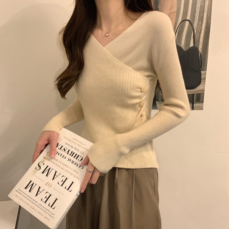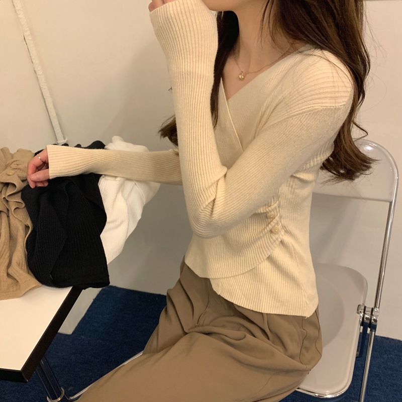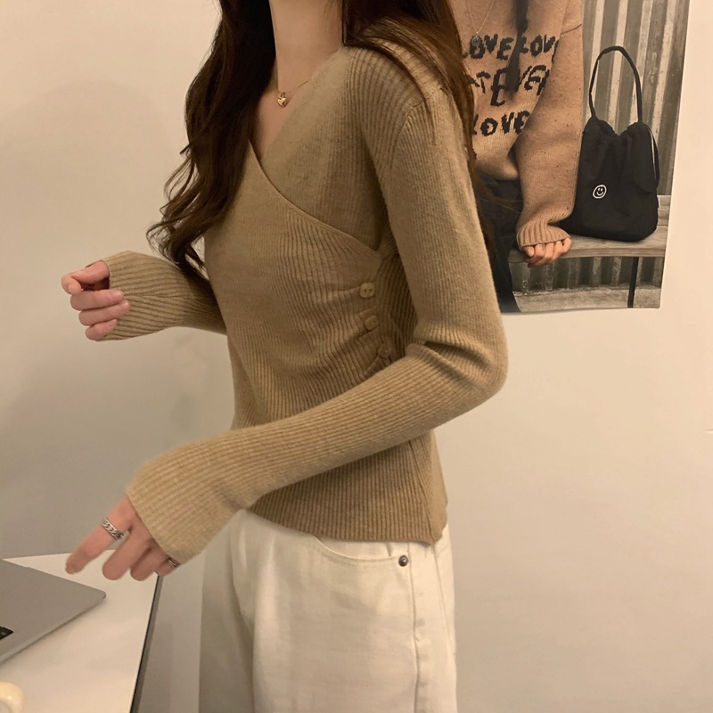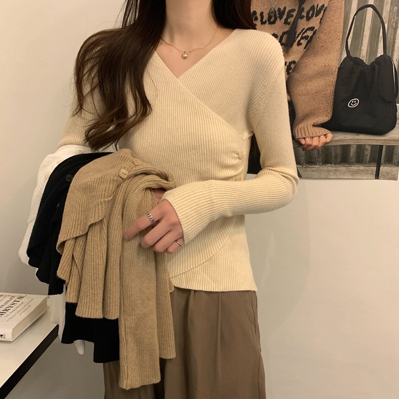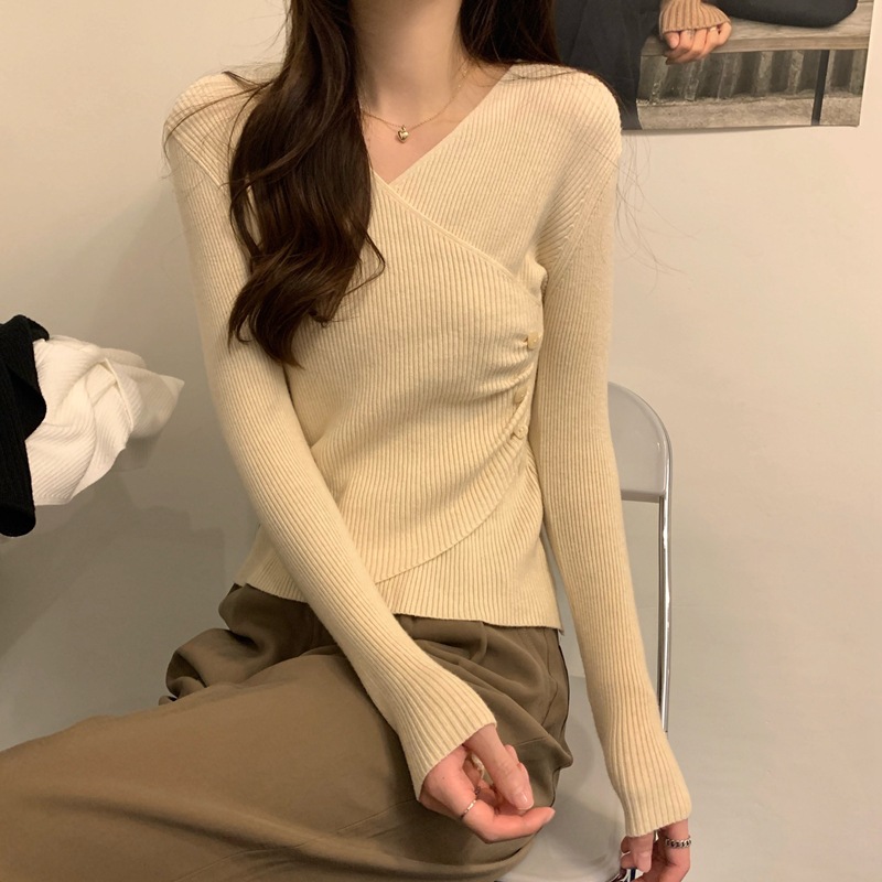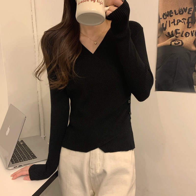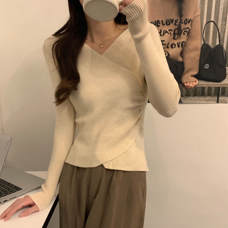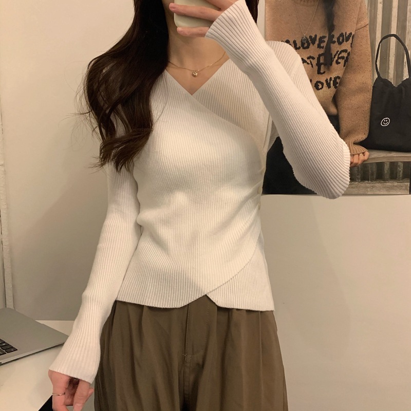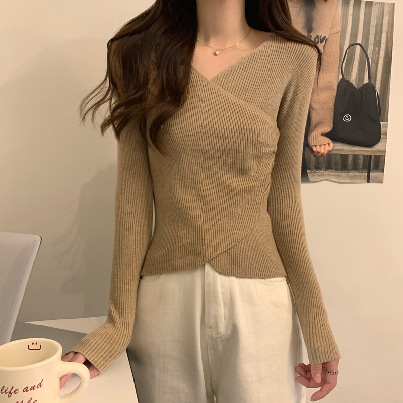 JMA-104 实拍 2023秋冬新款韩版v领修身交叉设计感内搭打底针织衫女毛衣潮