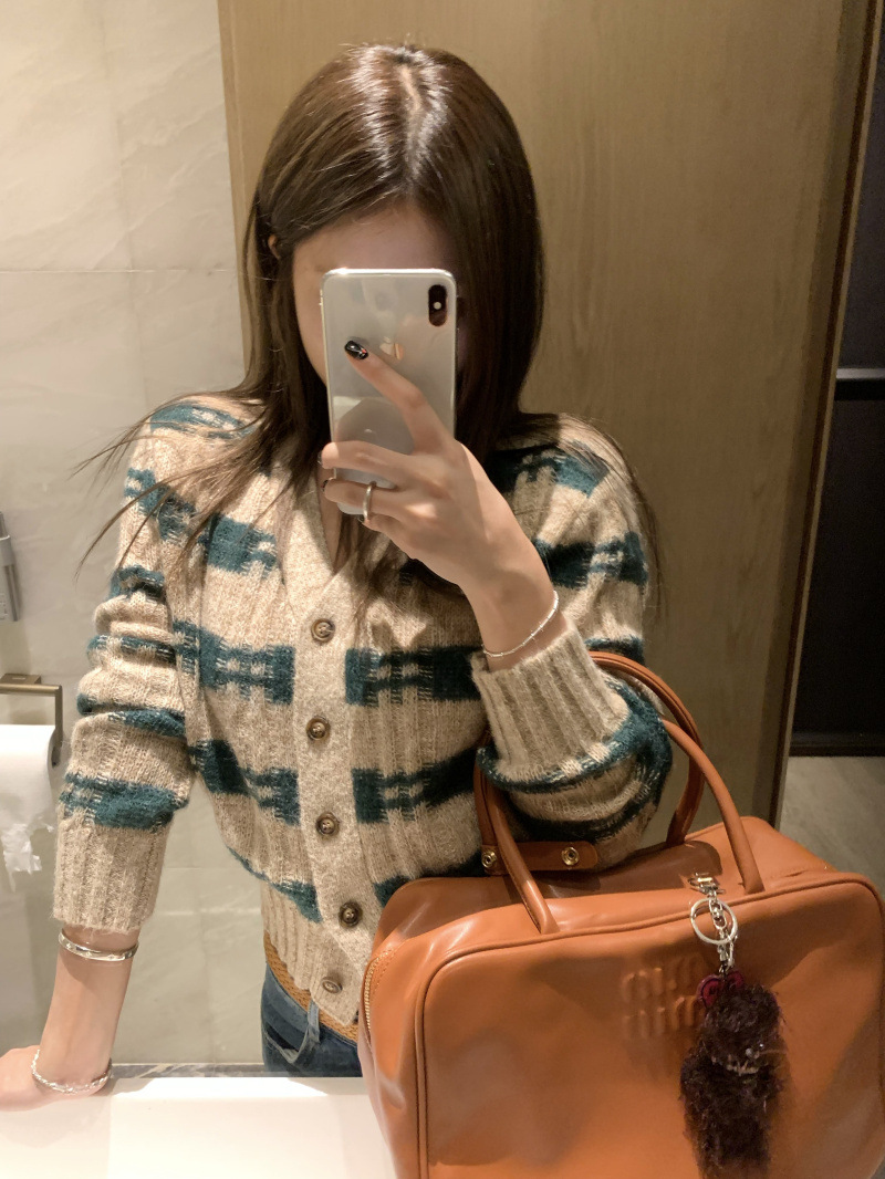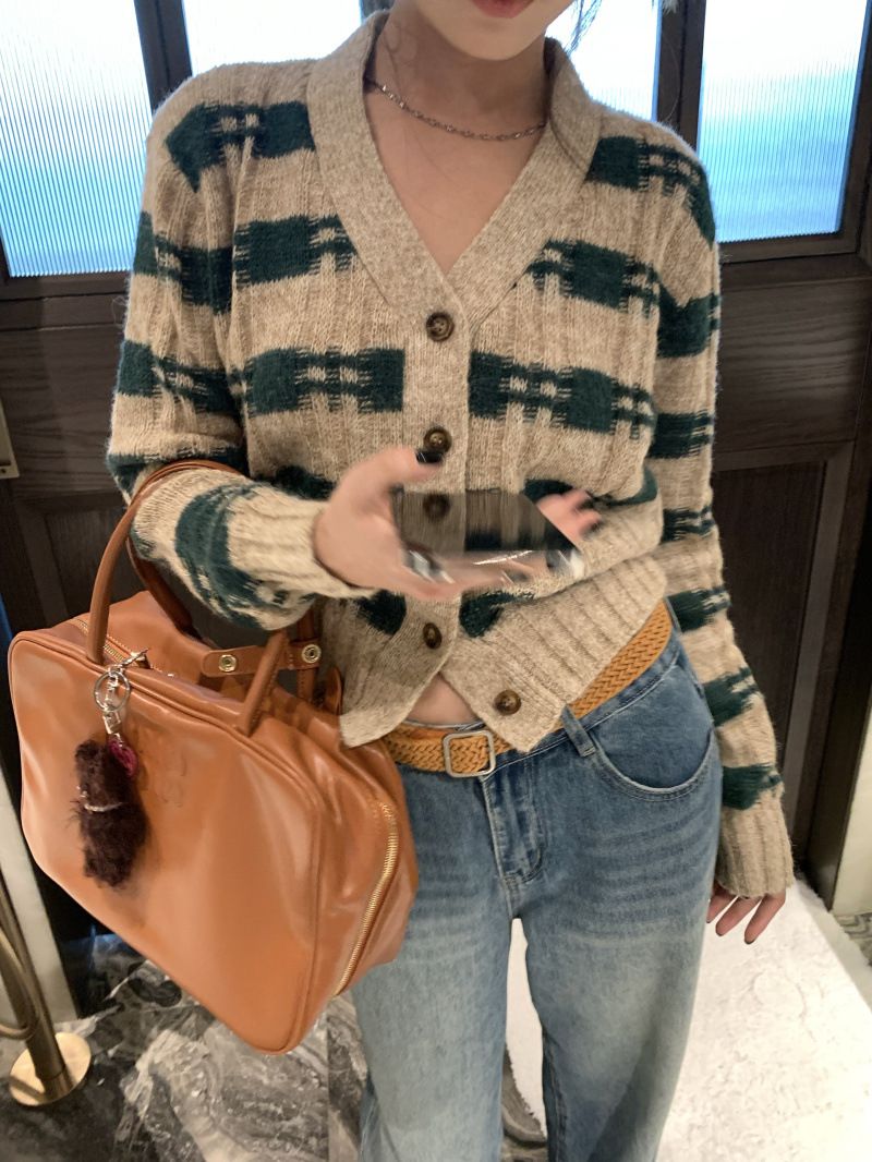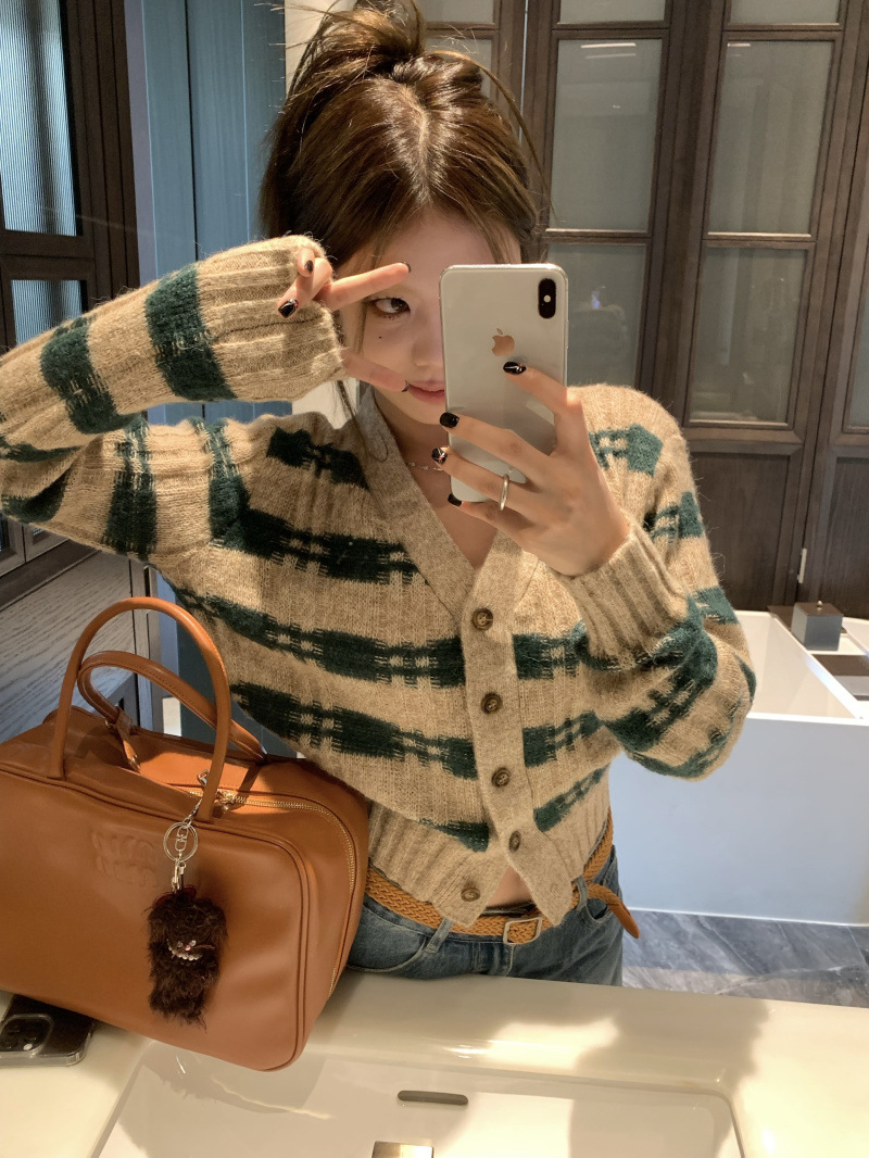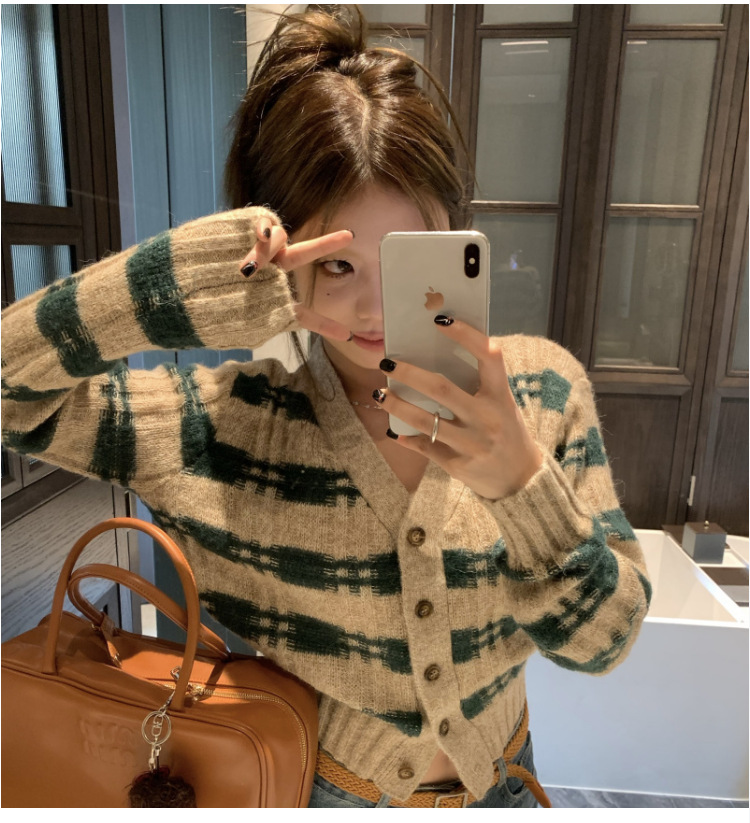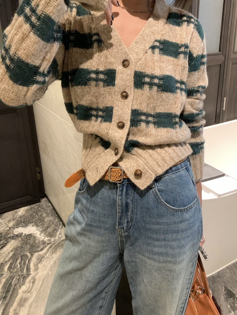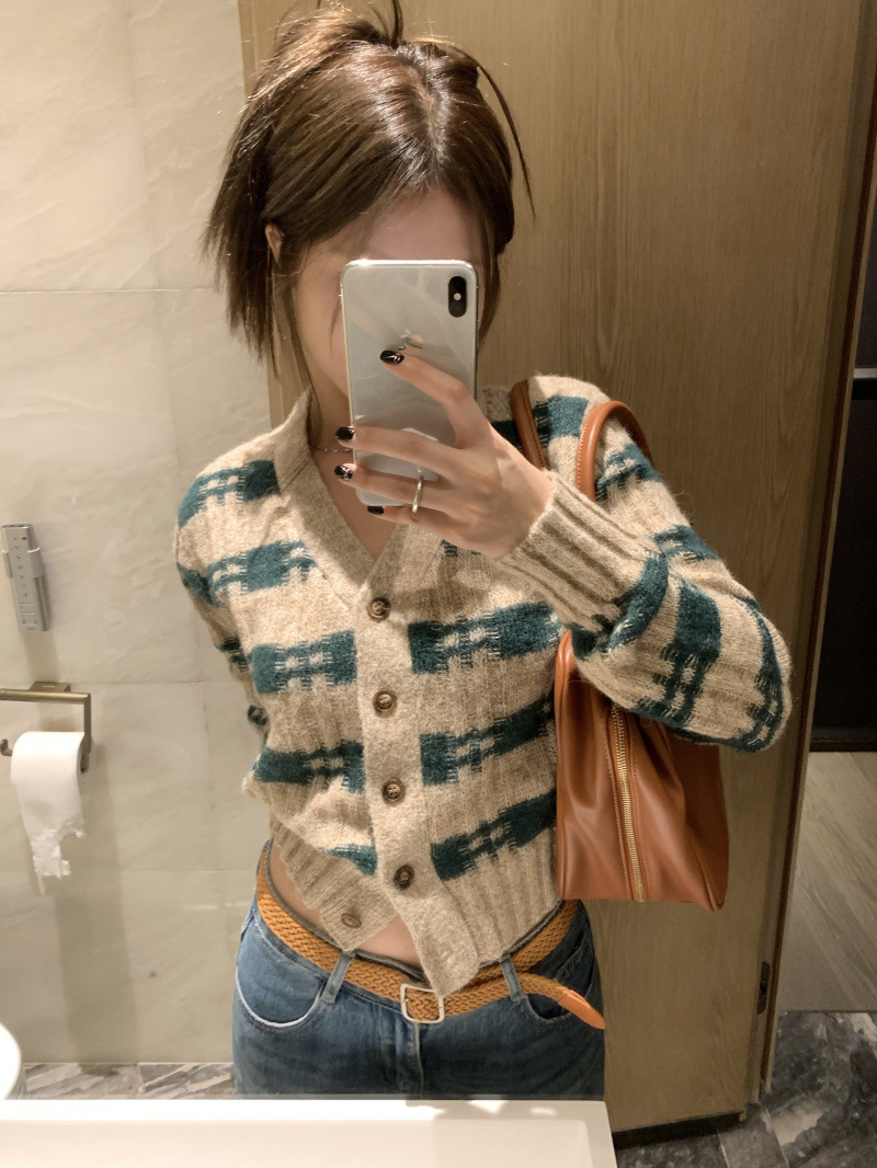 JMA-113 实拍 秋冬韩版复古V领条纹拼色开衫毛衣外套短款设计感针织衫上衣