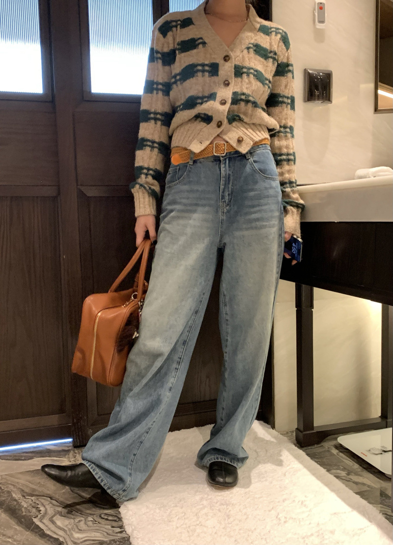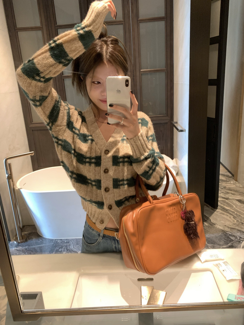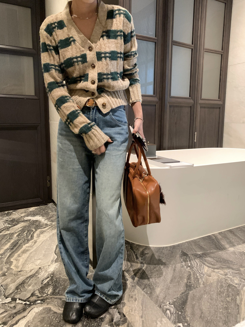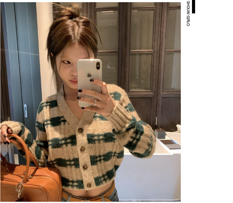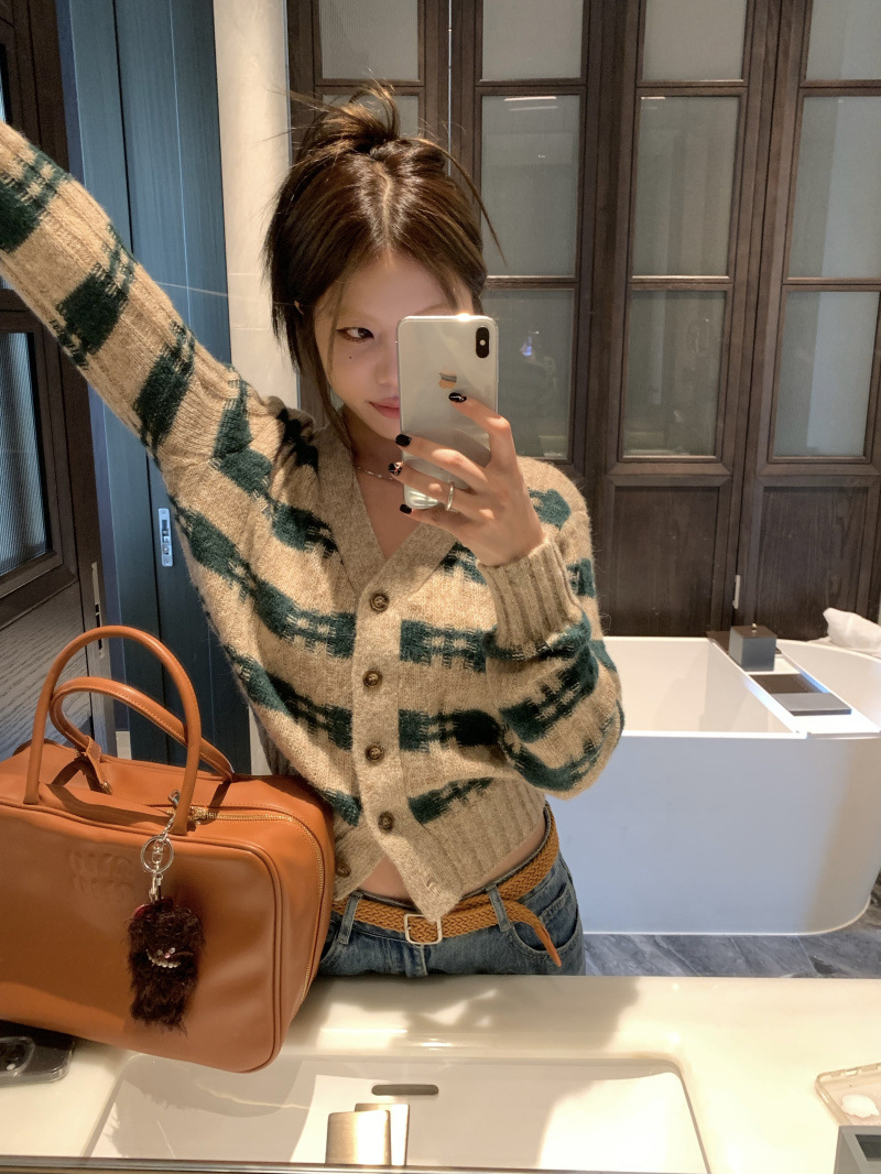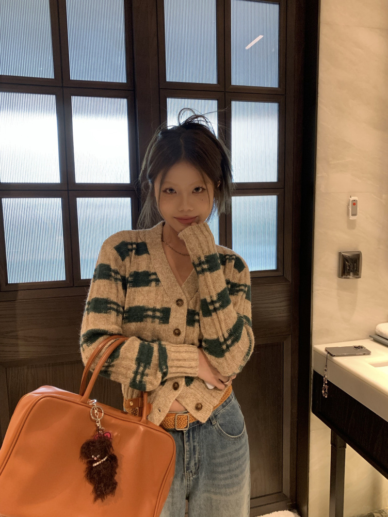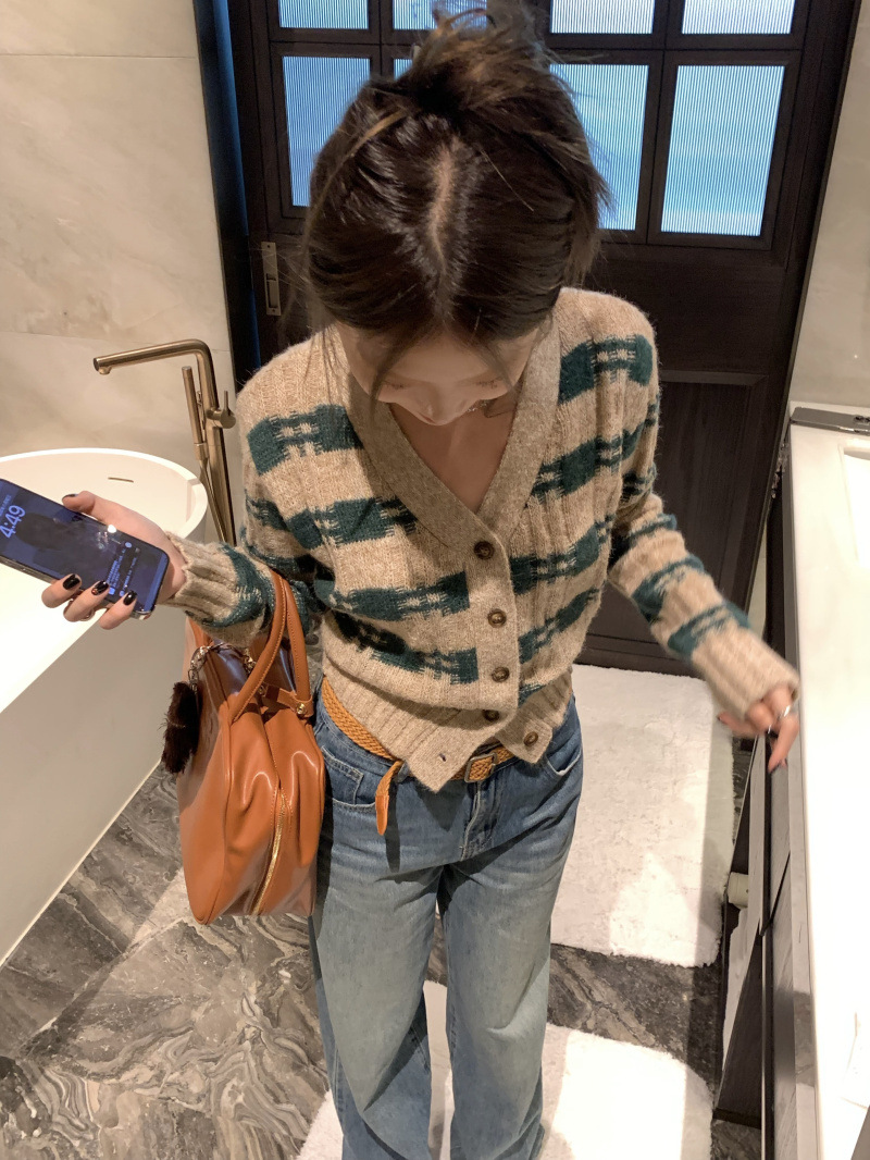 JMA-113 实拍 秋冬韩版复古V领条纹拼色开衫毛衣外套短款设计感针织衫上衣