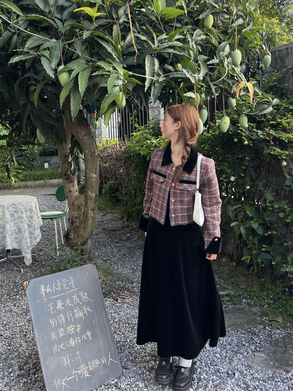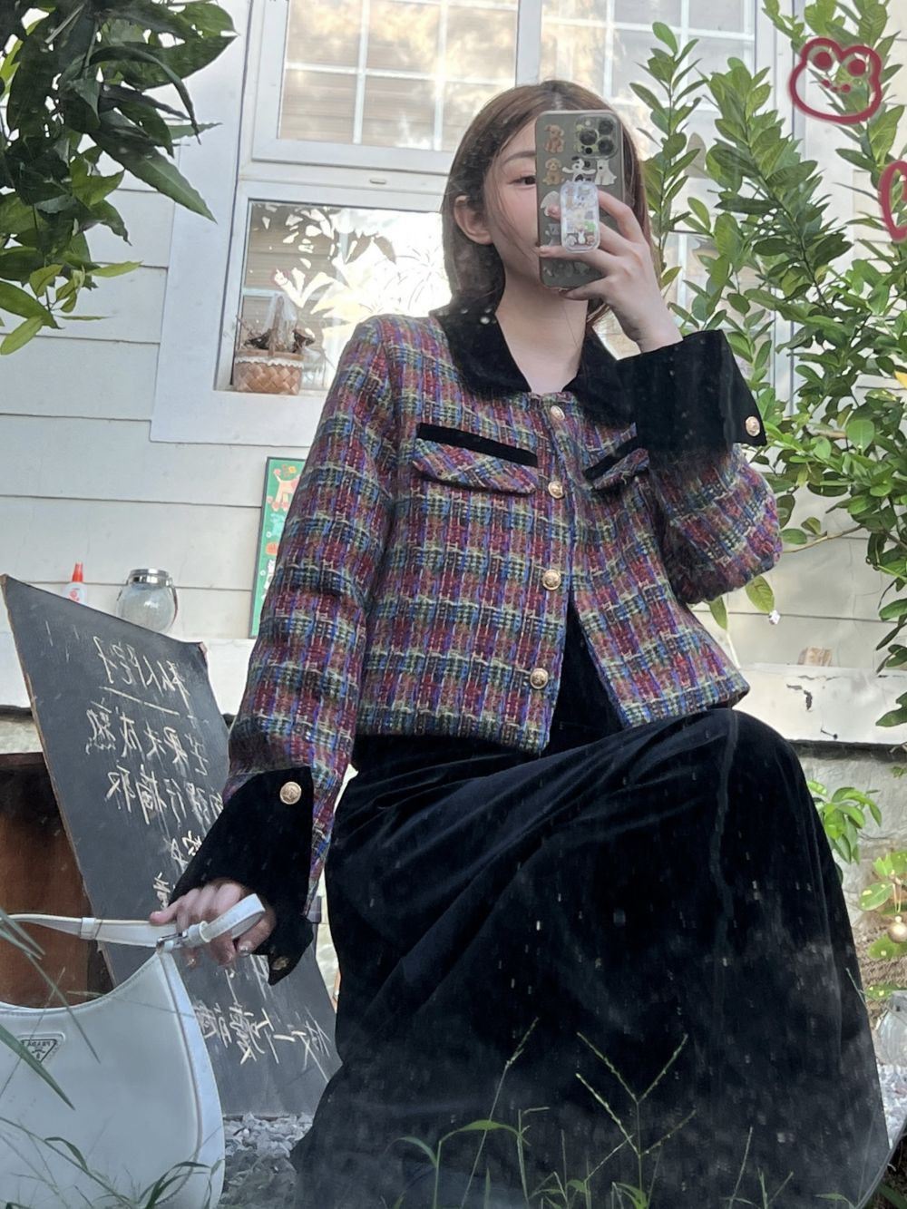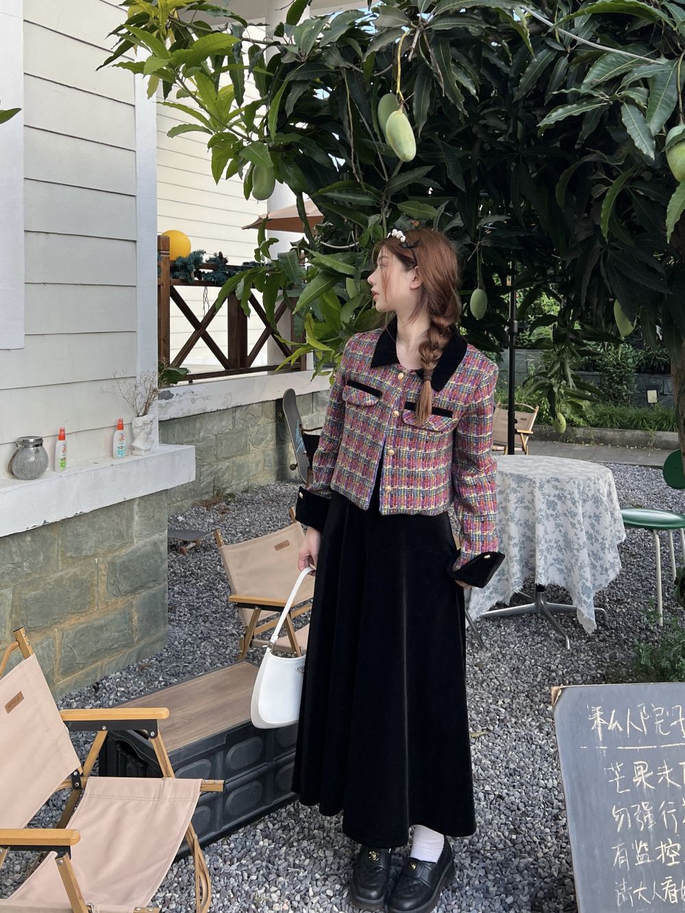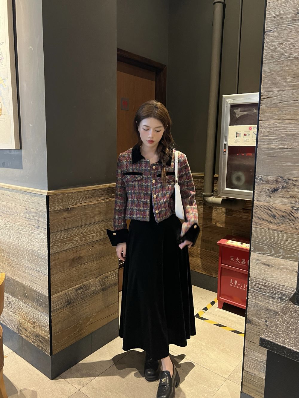 JMA-120 实拍 2023秋冬季新款韩系小香风翻领毛呢短外套+丝绒半身裙两件套