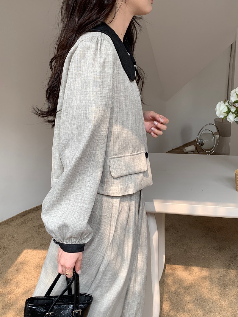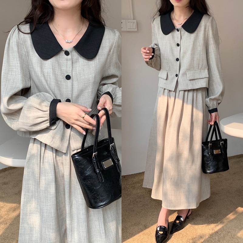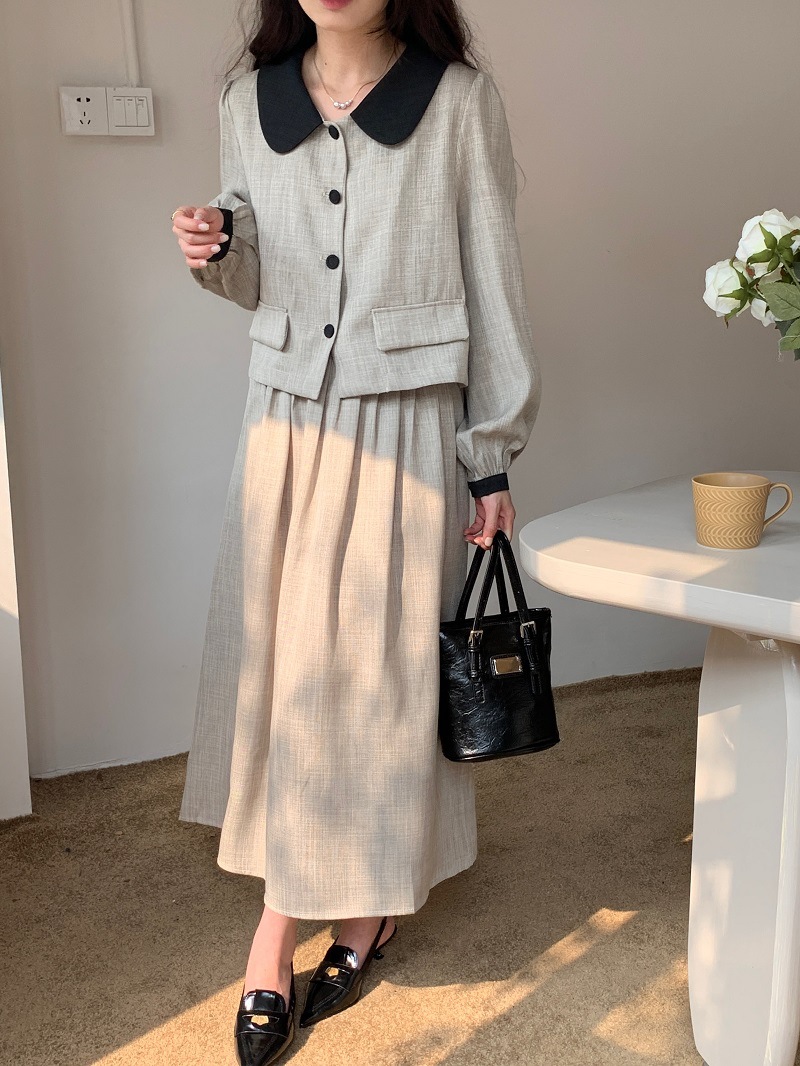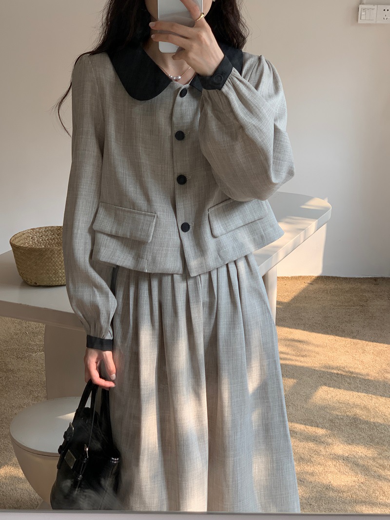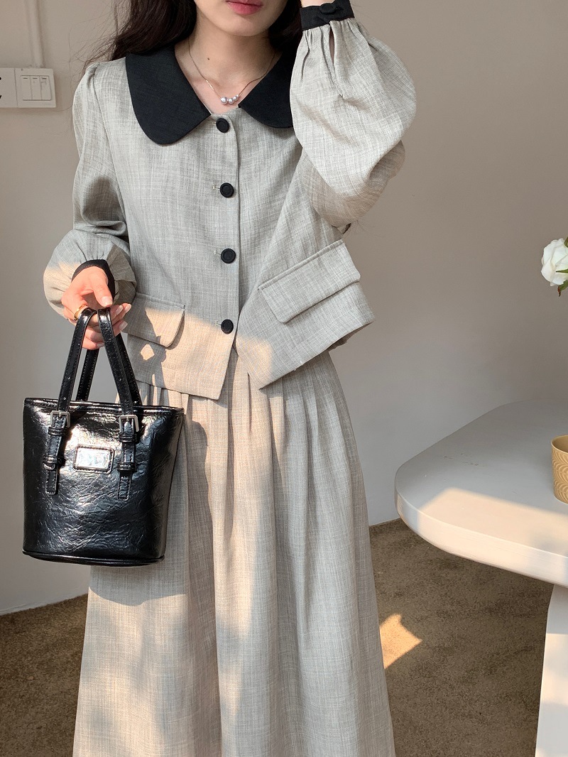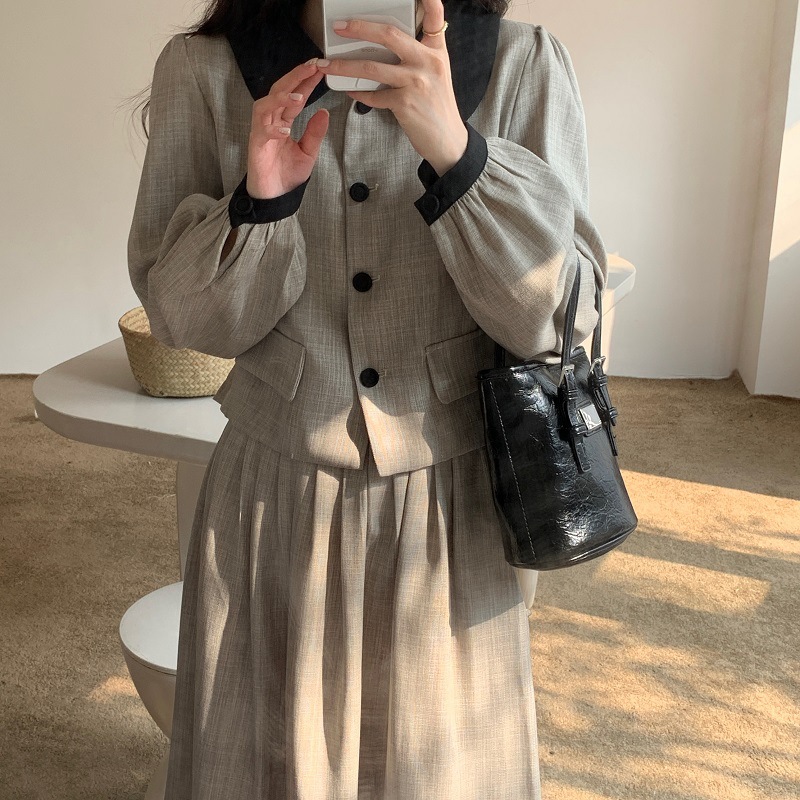 JMA-139 实拍 秋季韩版气质赫本风拼接撞色翻领短外套+高腰百褶半身裙套装