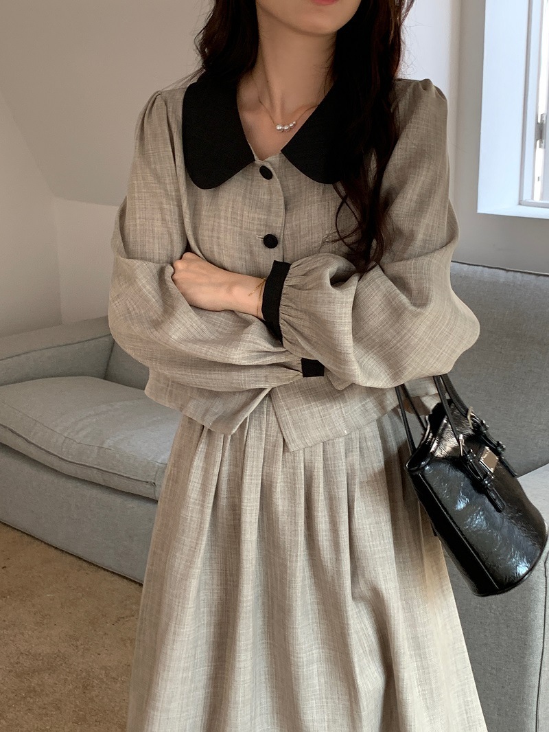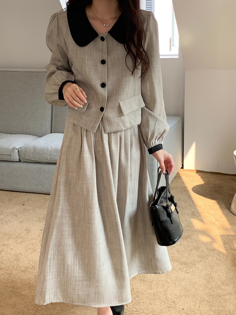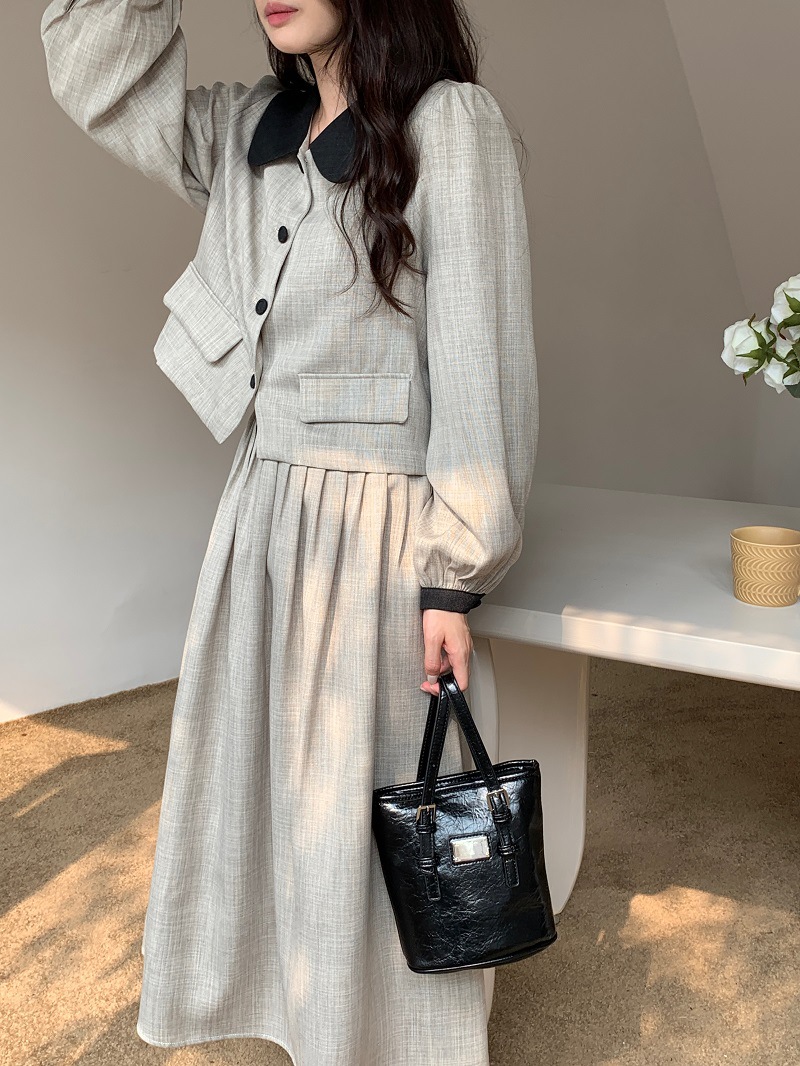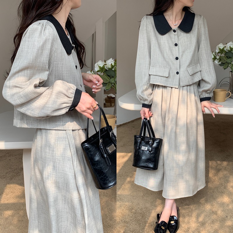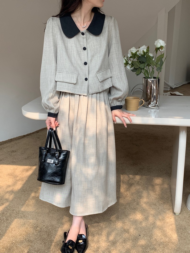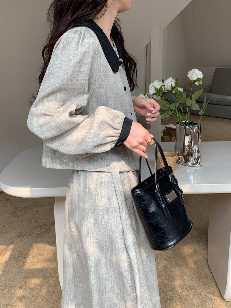 JMA-139 实拍 秋季韩版气质赫本风拼接撞色翻领短外套+高腰百褶半身裙套装