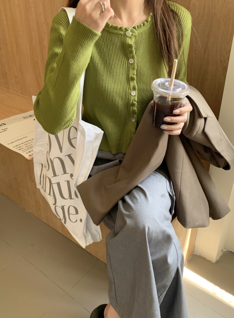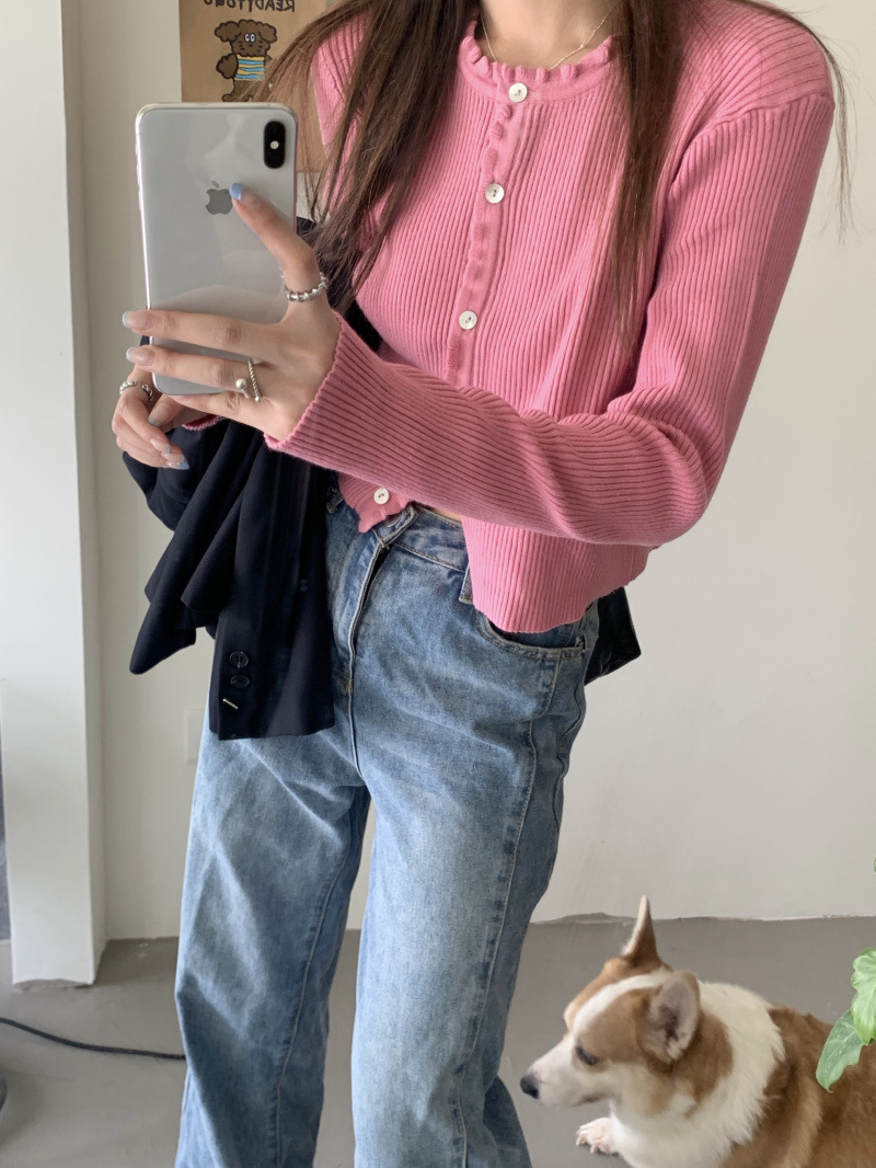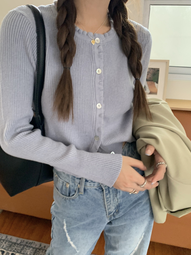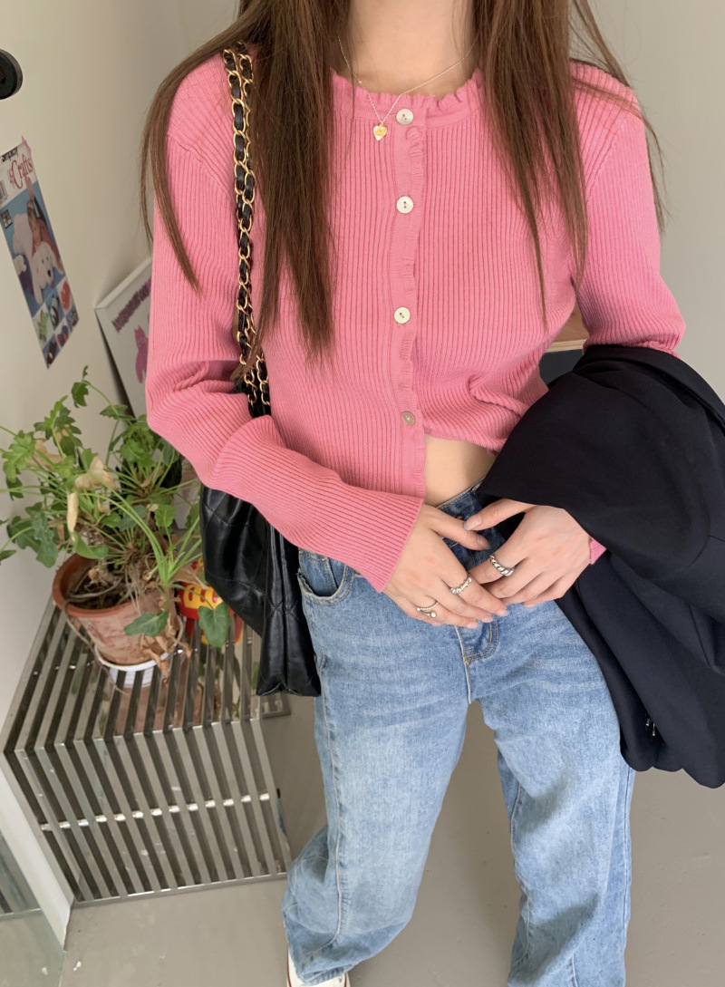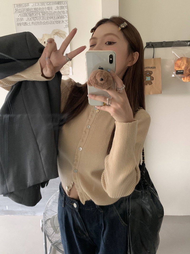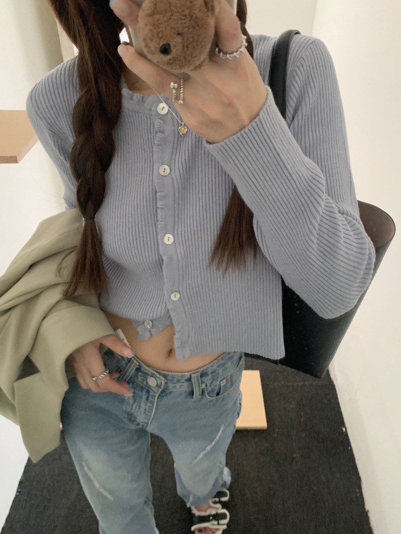 JMA-154 秋季韩版木耳边长袖针织衫开衫女宽松V领短款内搭簿毛衣外套上衣