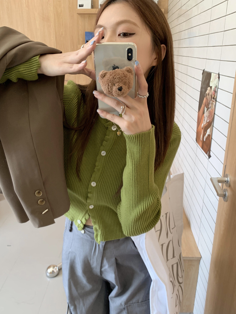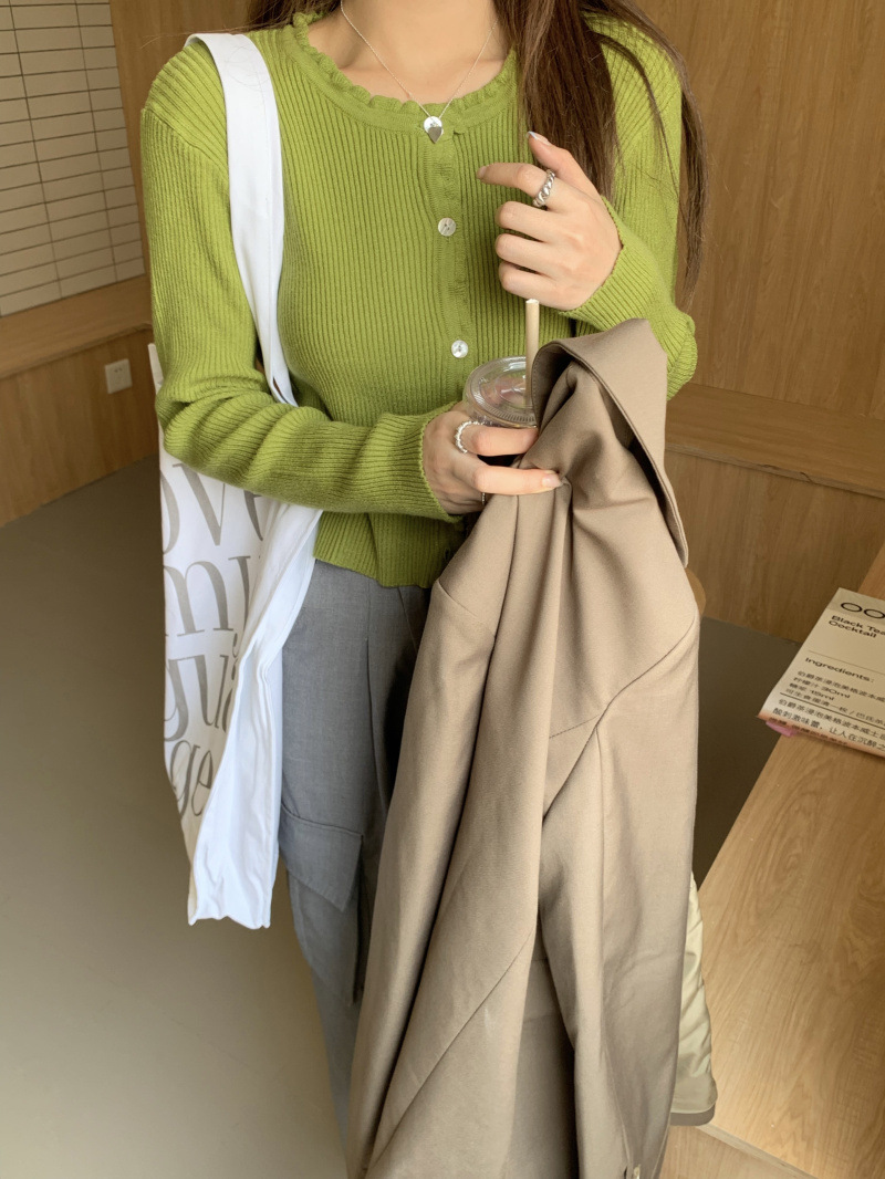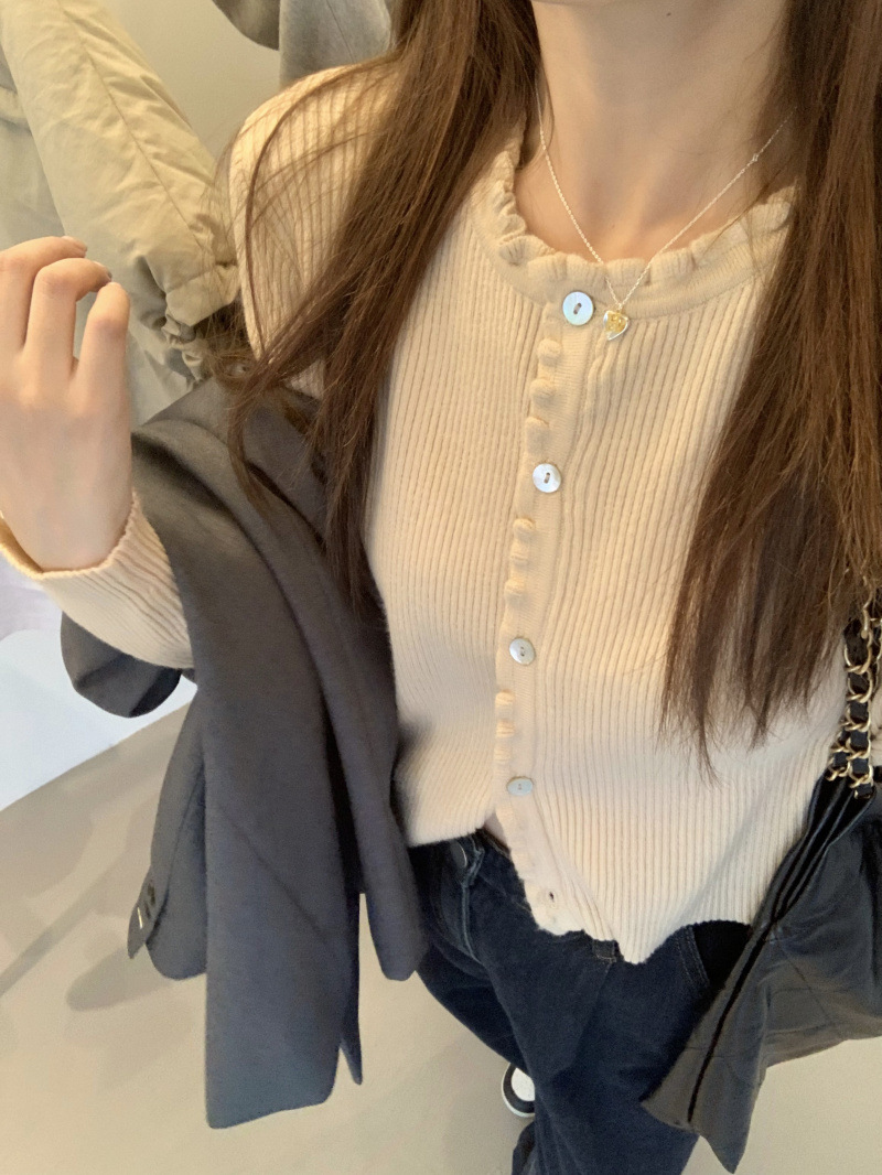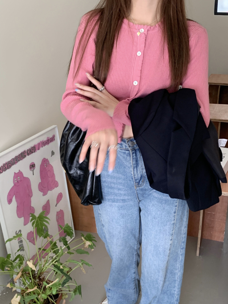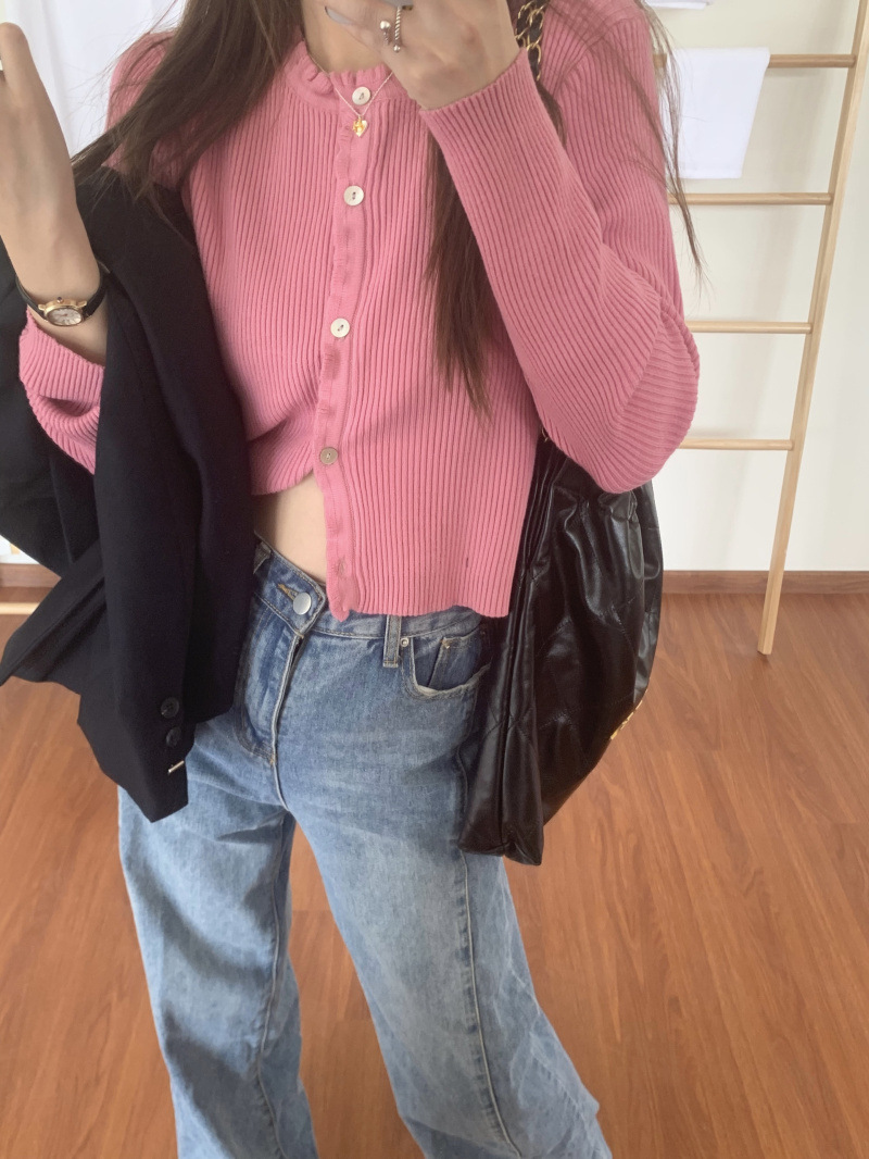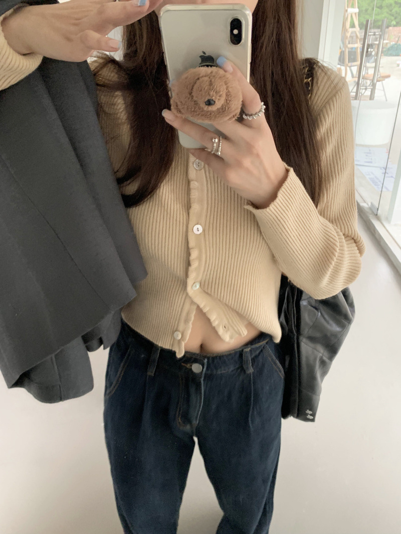 JMA-154 秋季韩版木耳边长袖针织衫开衫女宽松V领短款内搭簿毛衣外套上衣