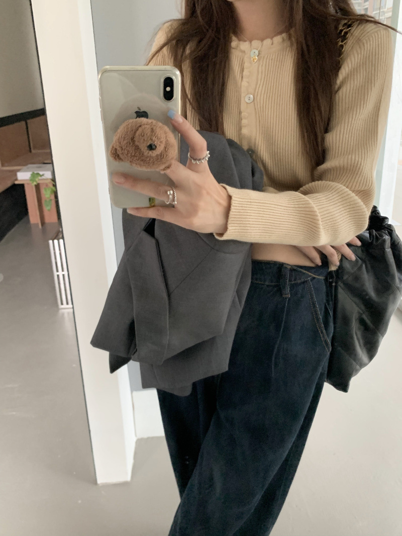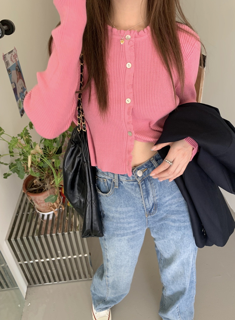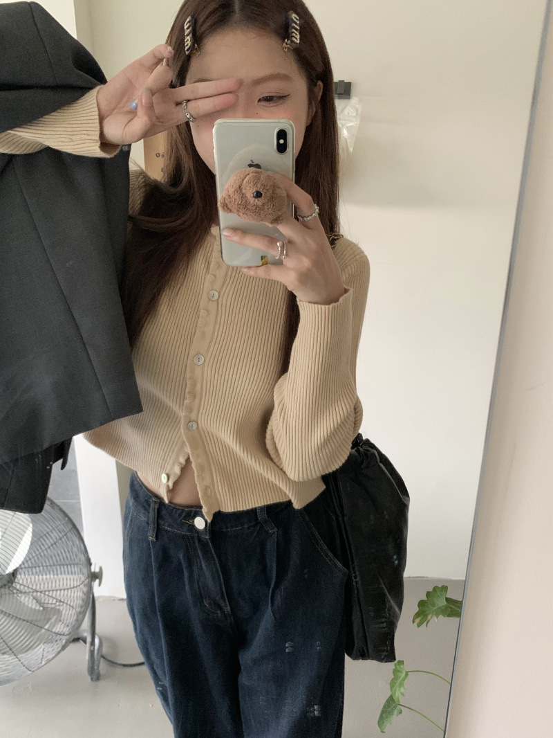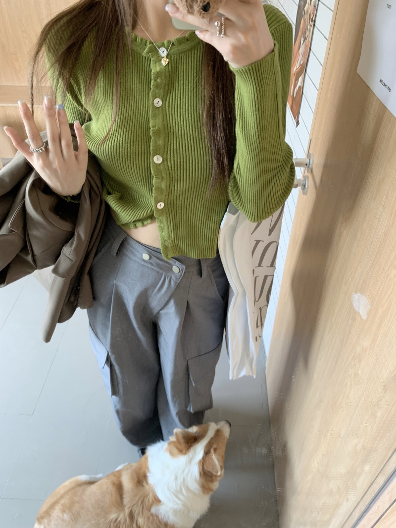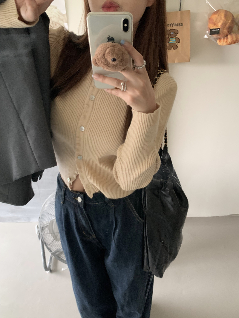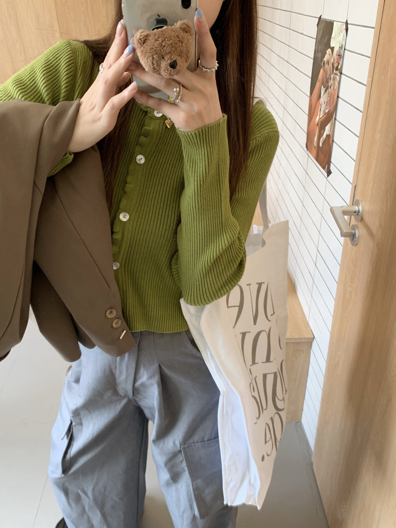 JMA-154 秋季韩版木耳边长袖针织衫开衫女宽松V领短款内搭簿毛衣外套上衣