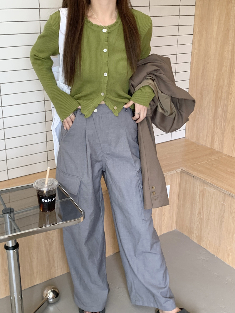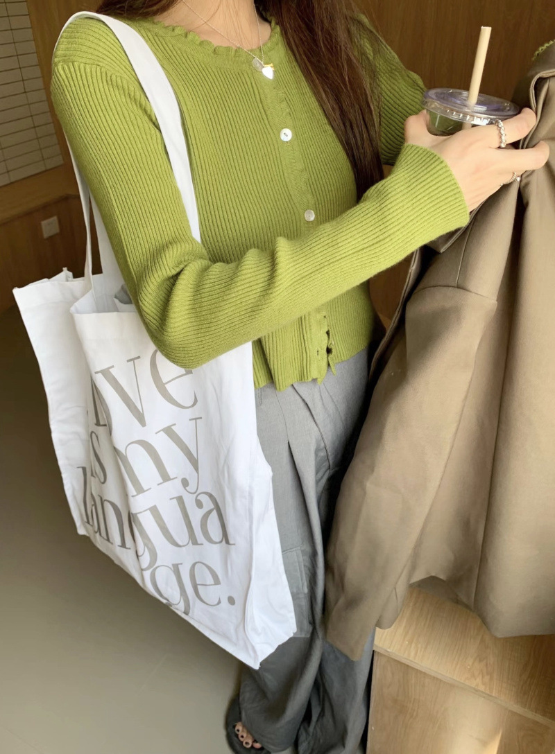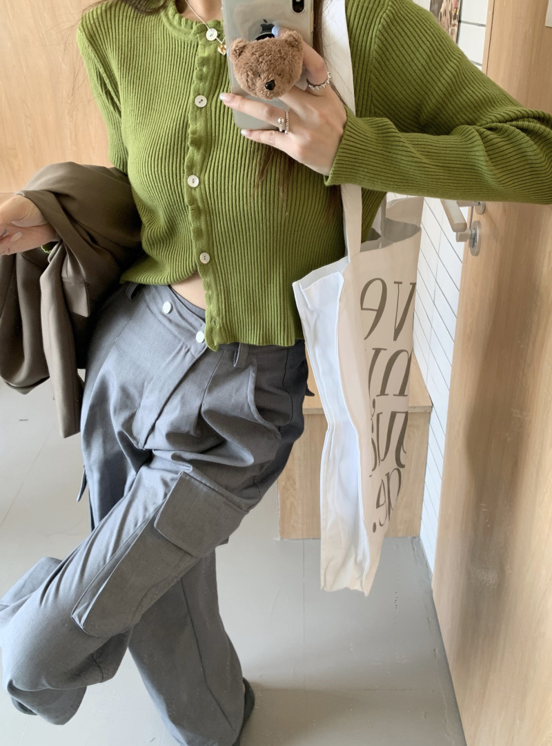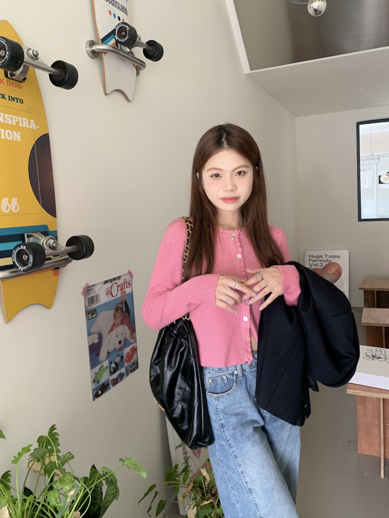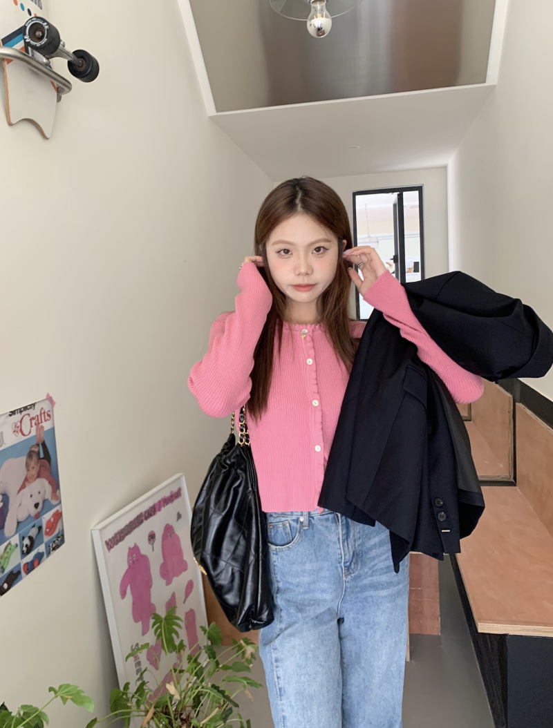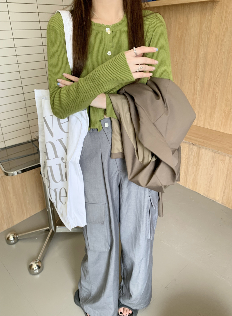 JMA-154 秋季韩版木耳边长袖针织衫开衫女宽松V领短款内搭簿毛衣外套上衣