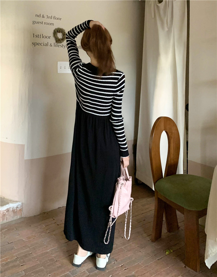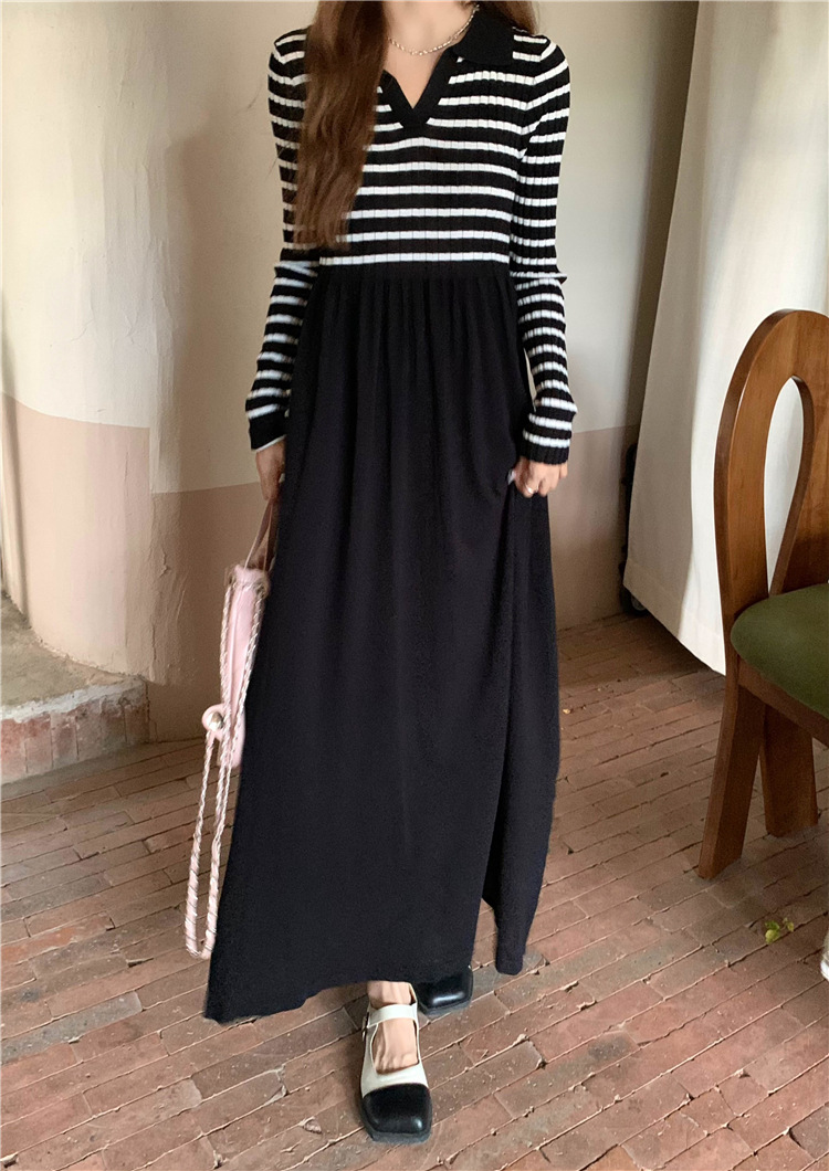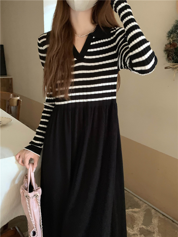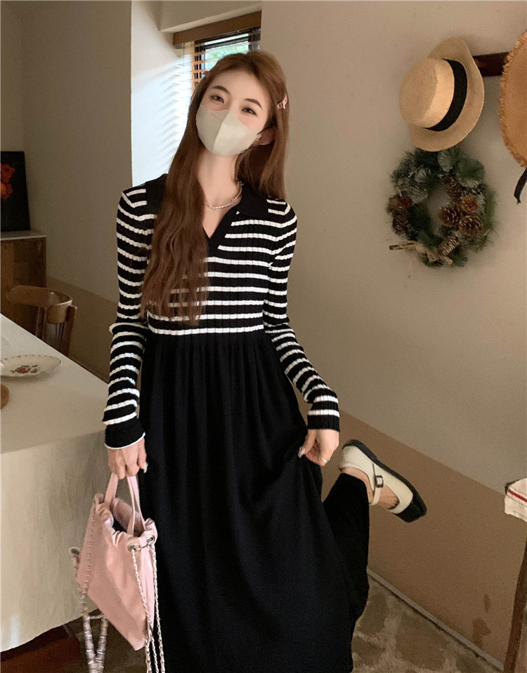 JMA-162 实拍 秋季新款复古POLO翻领条纹针织连衣裙慵懒风长袖大摆裙长裙
