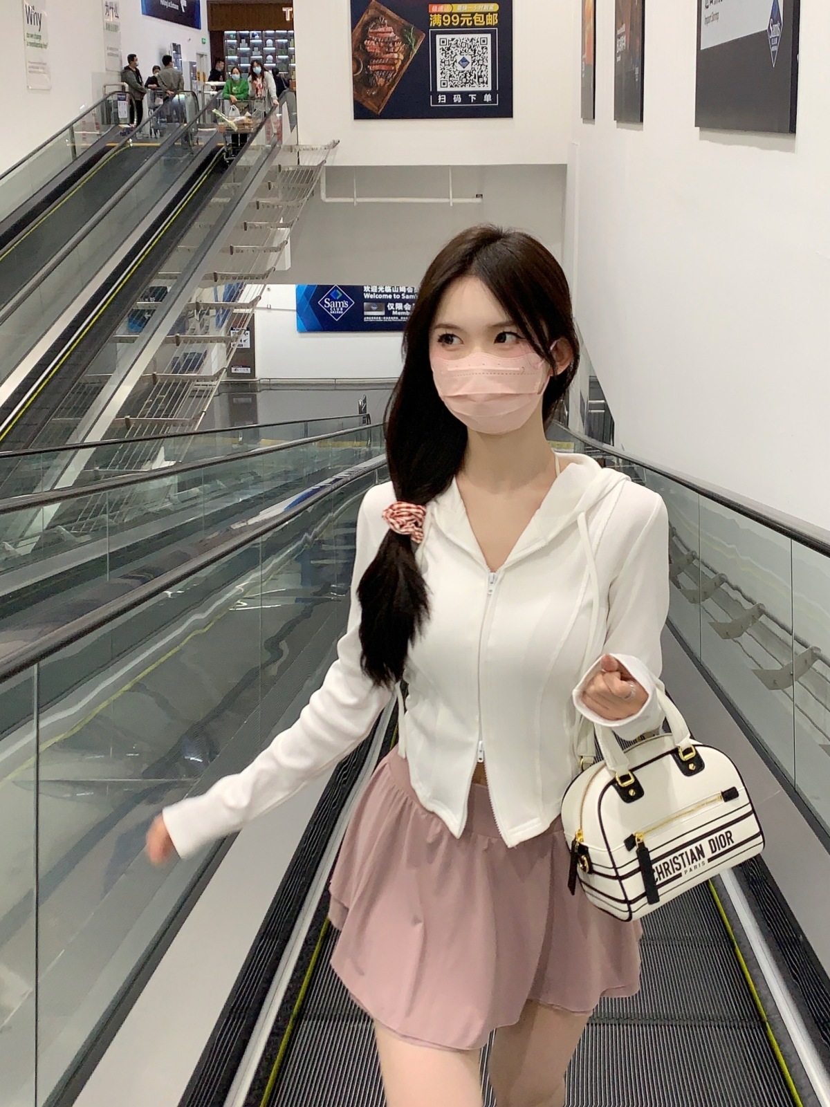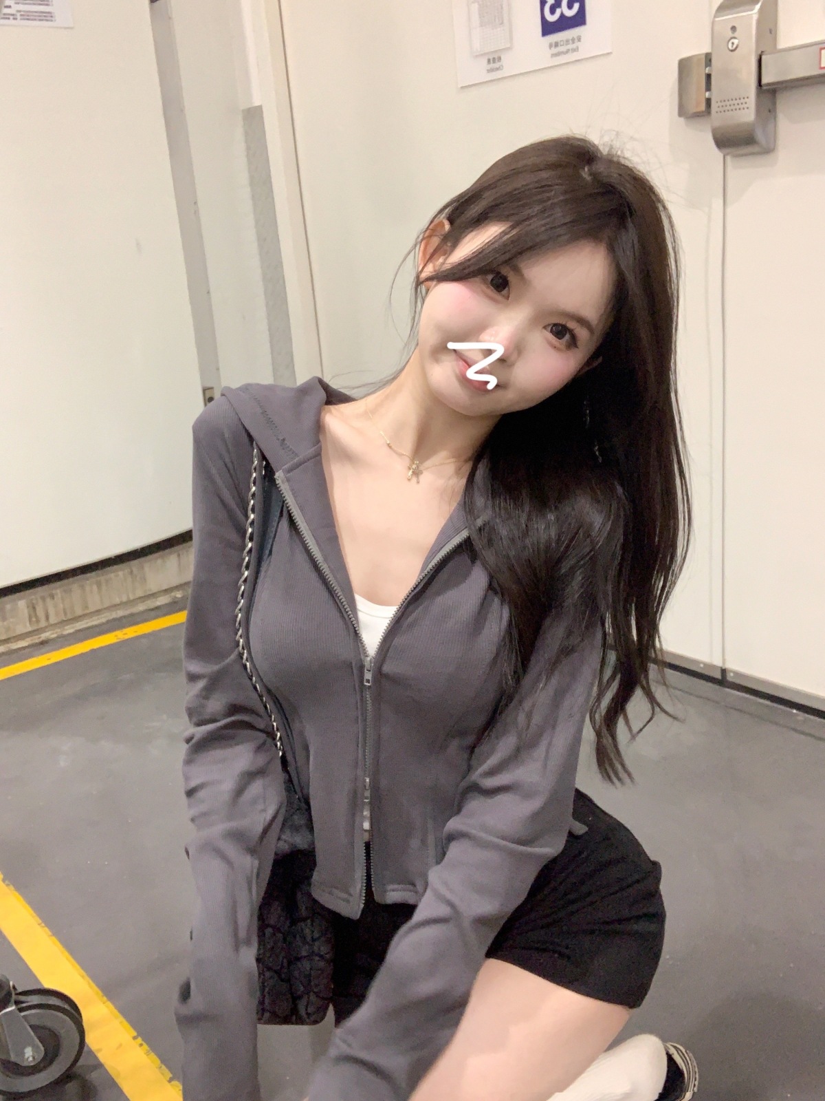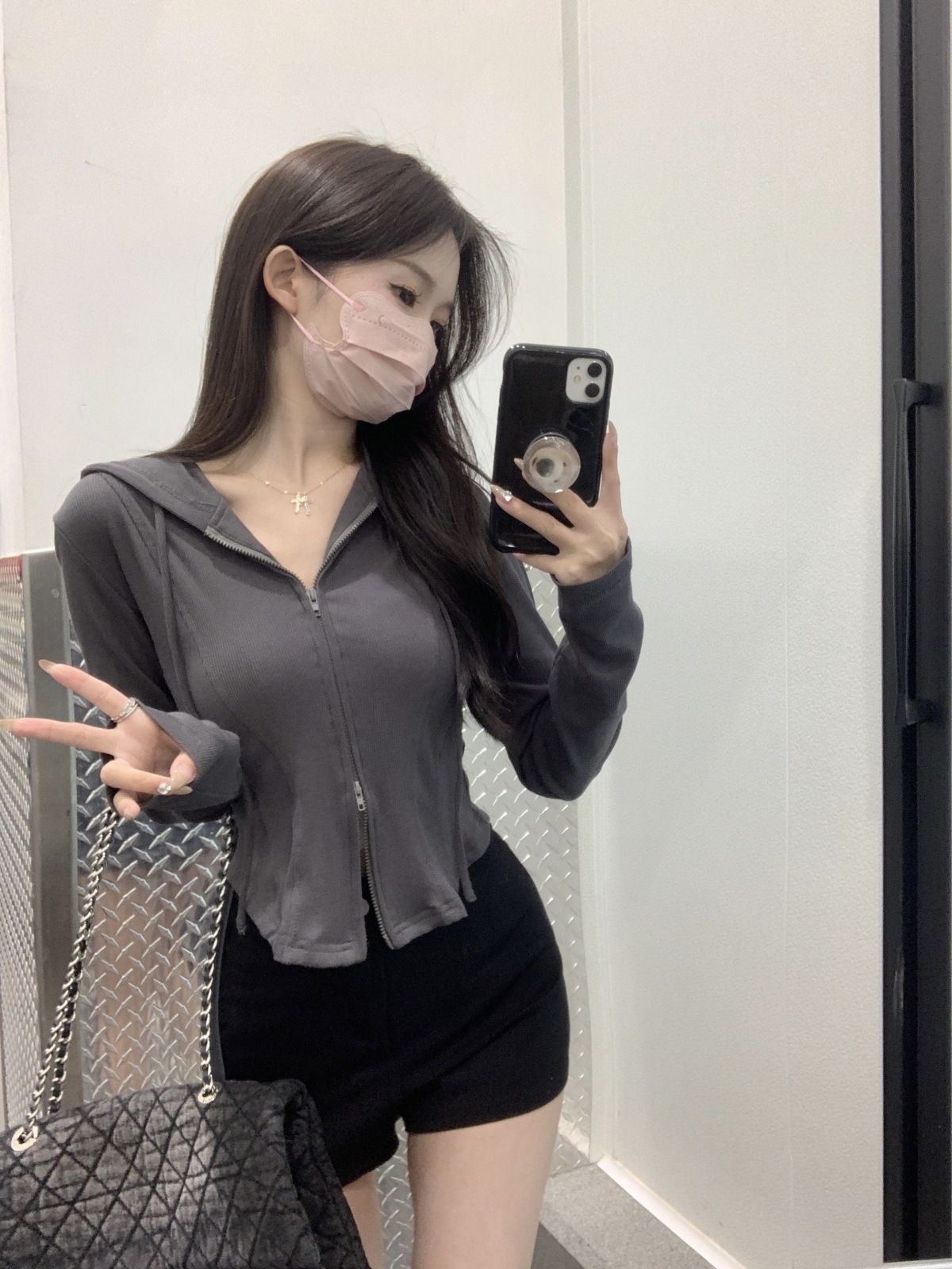 JMA-167 实拍 秋韩版修身鱼骨连帽双拉链设计感甜辣风长袖开衫T恤上衣外套