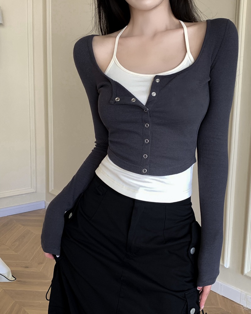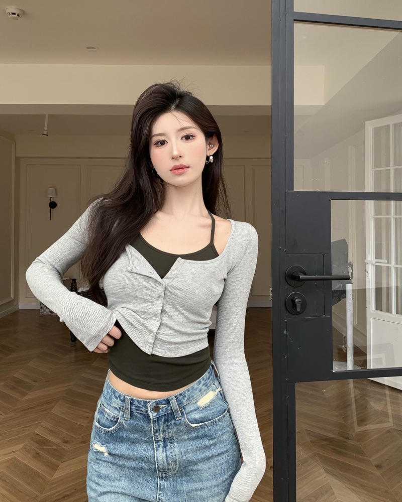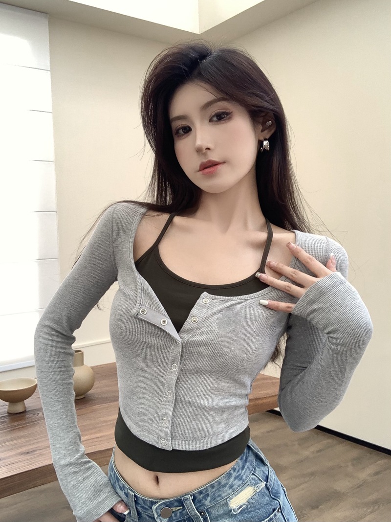 JMA-168 实拍 初秋美式复古辣妹风薄款修身吊带短款长袖T恤假两件防晒上衣