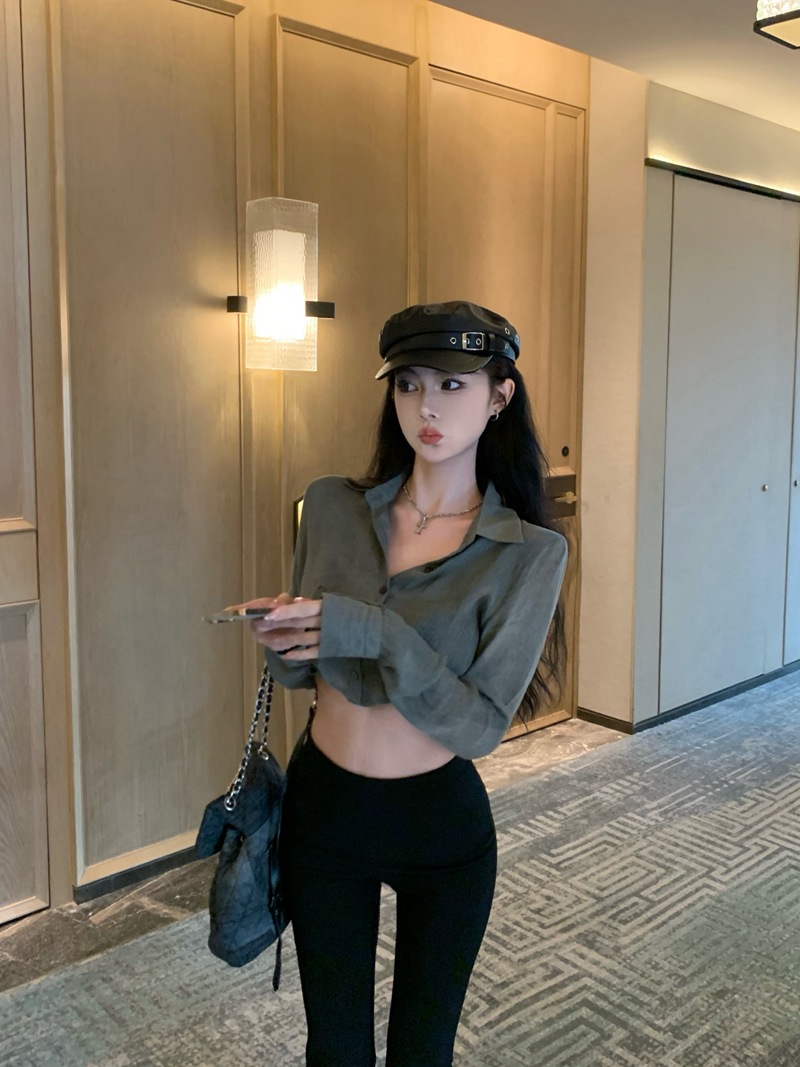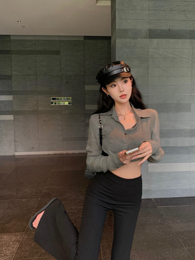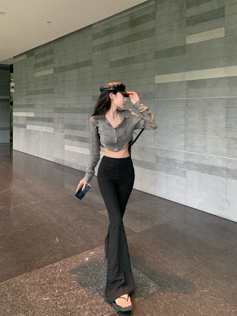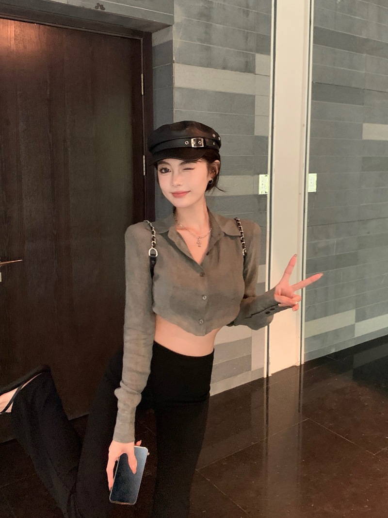 JMA-169 实拍2023夏性感辣妹风超薄短款长袖灰色长袖衬衫女防晒上衣薄外套