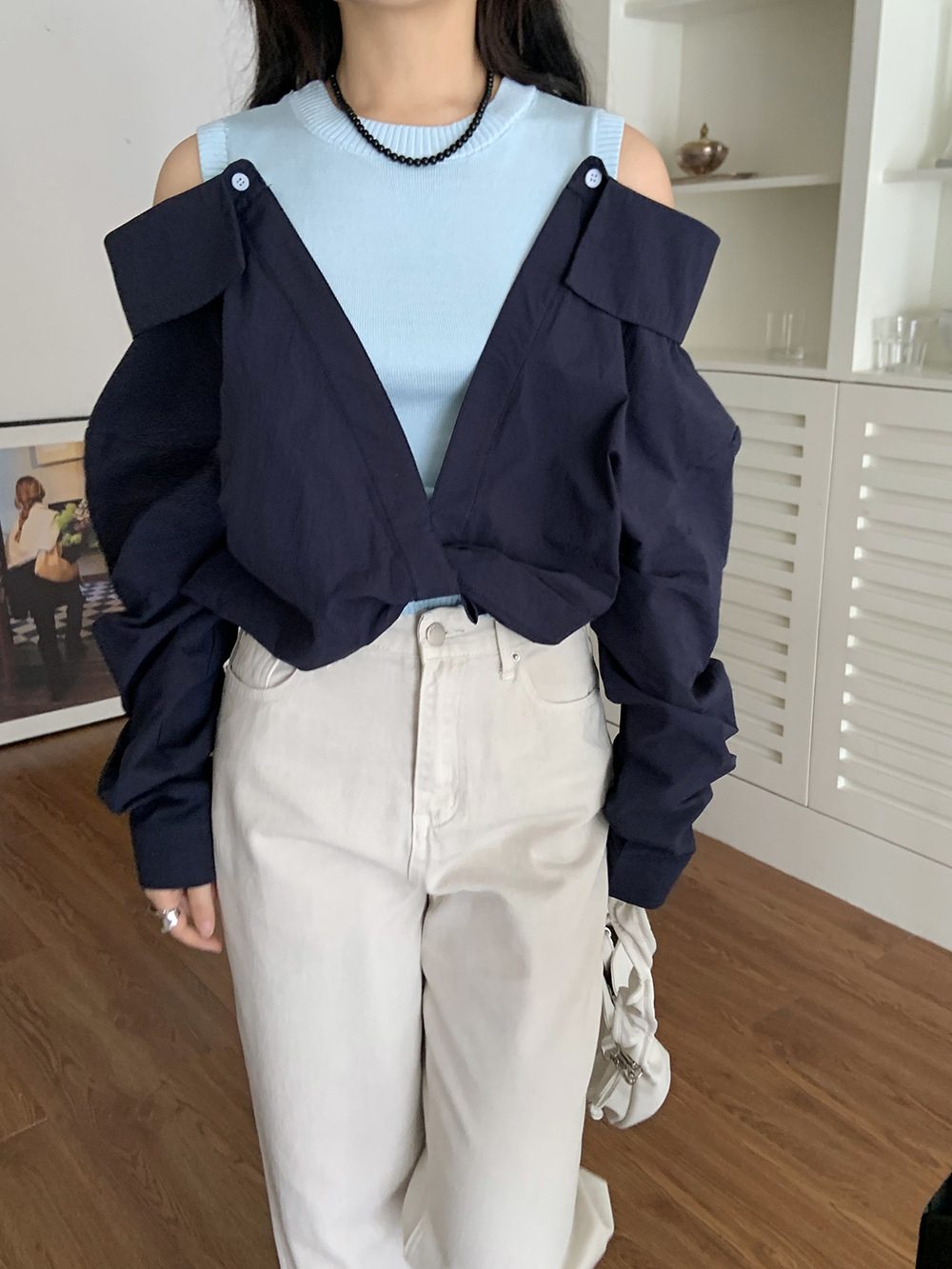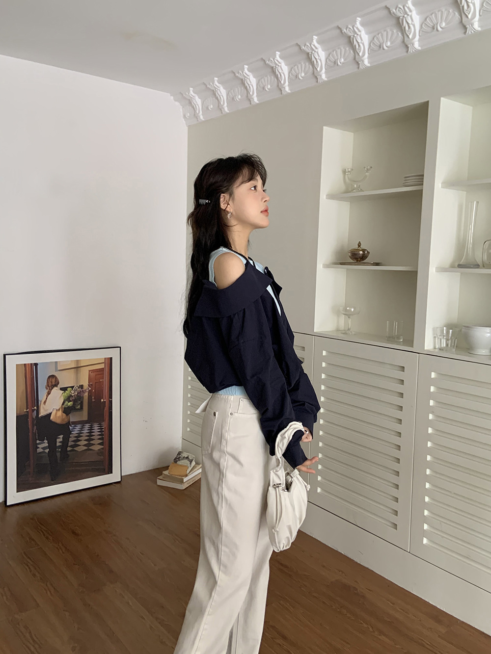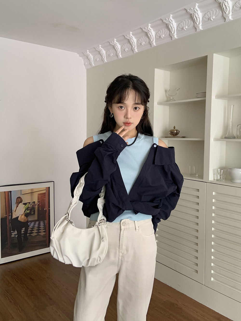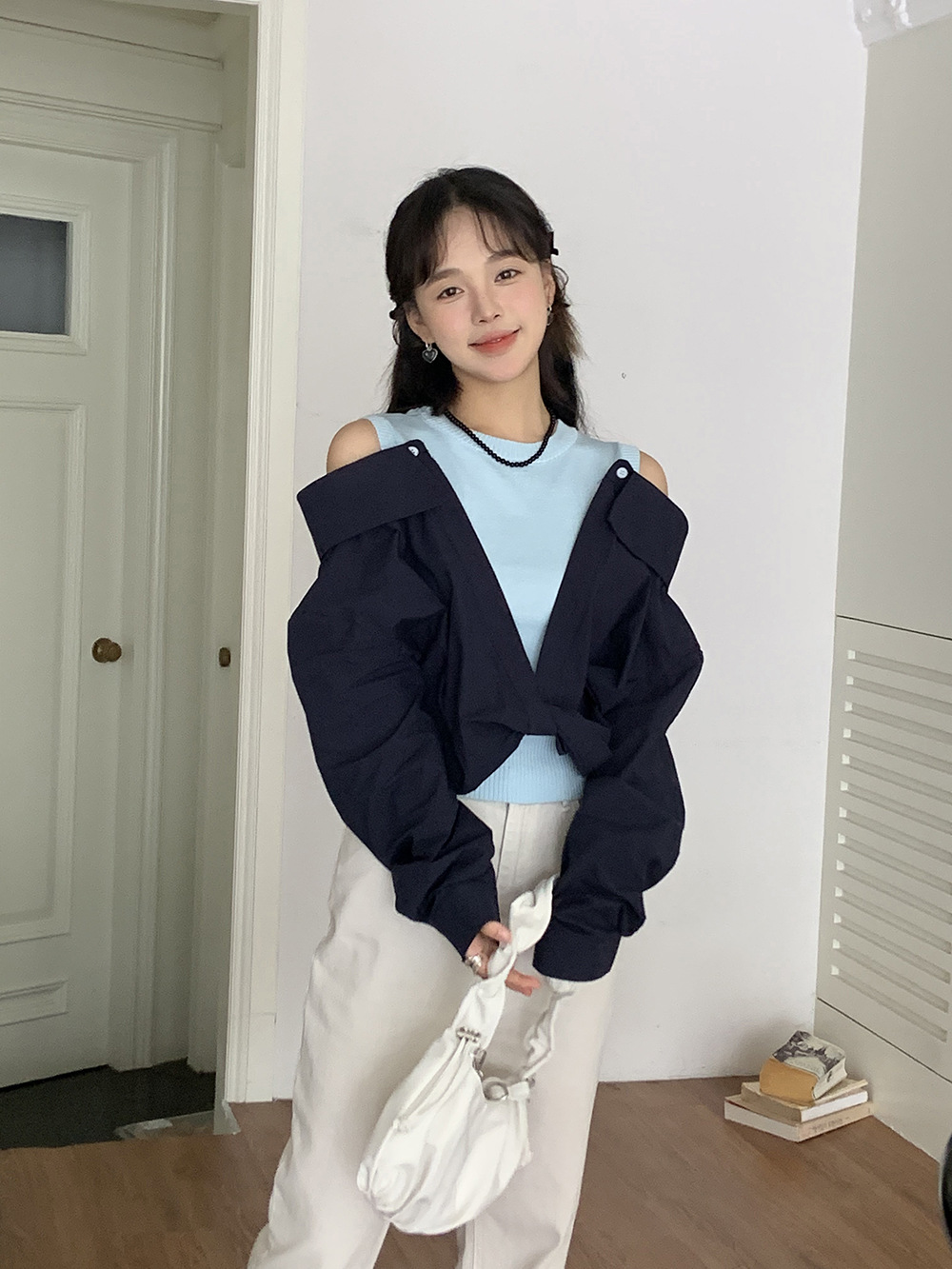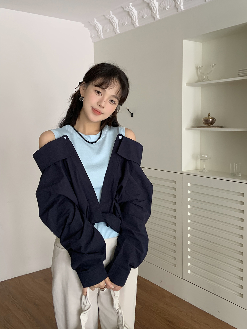 JMA-171 实拍秋季复古小众设计感减龄撞色露肩针织背心假两件拼接上衣衬衫