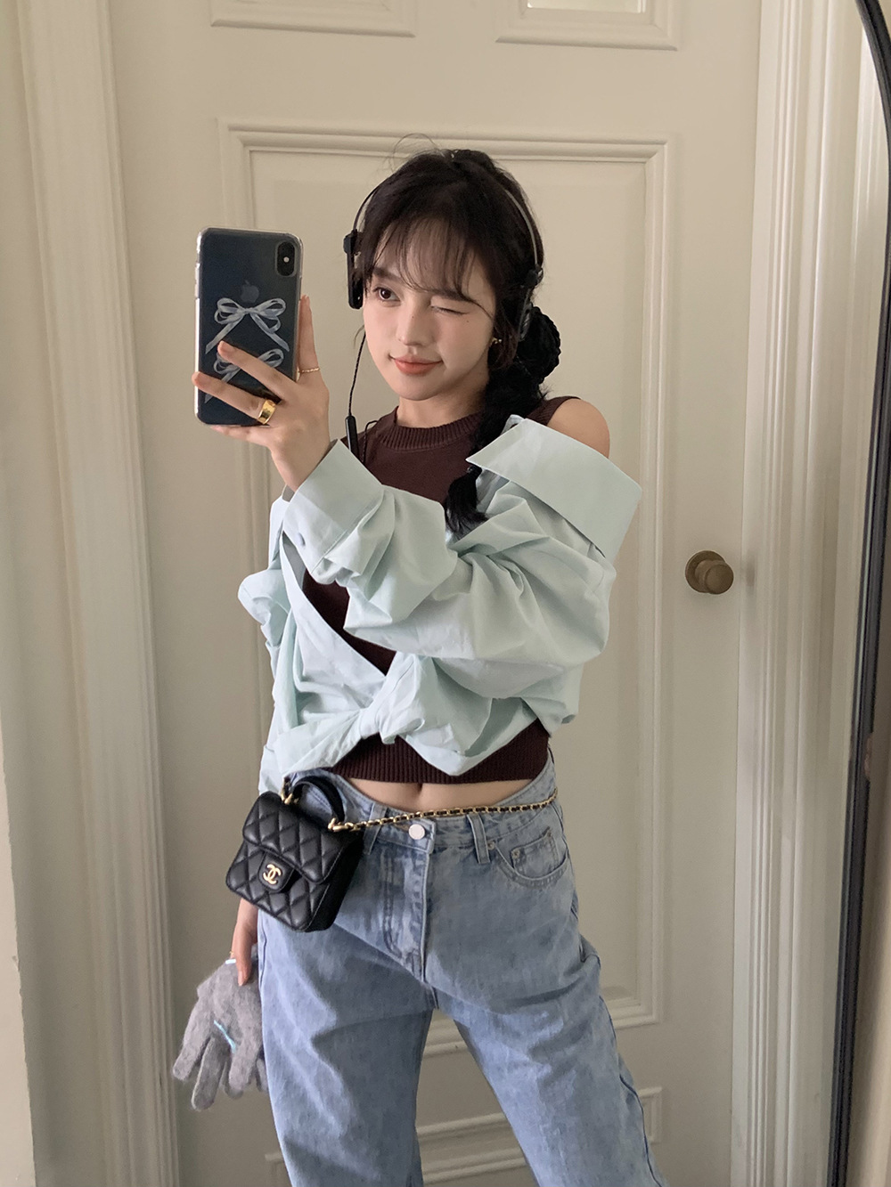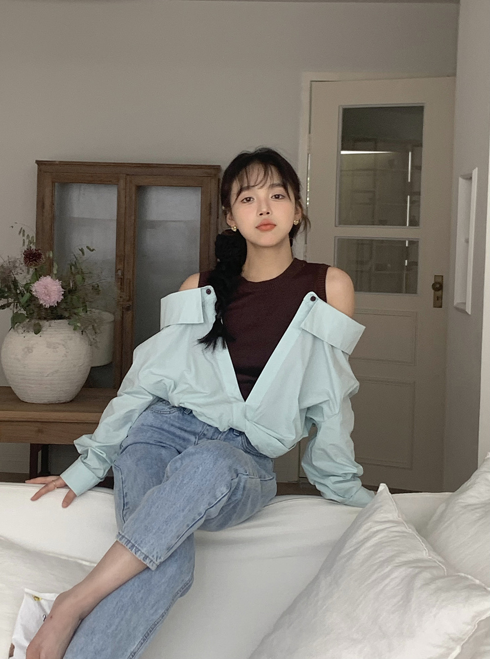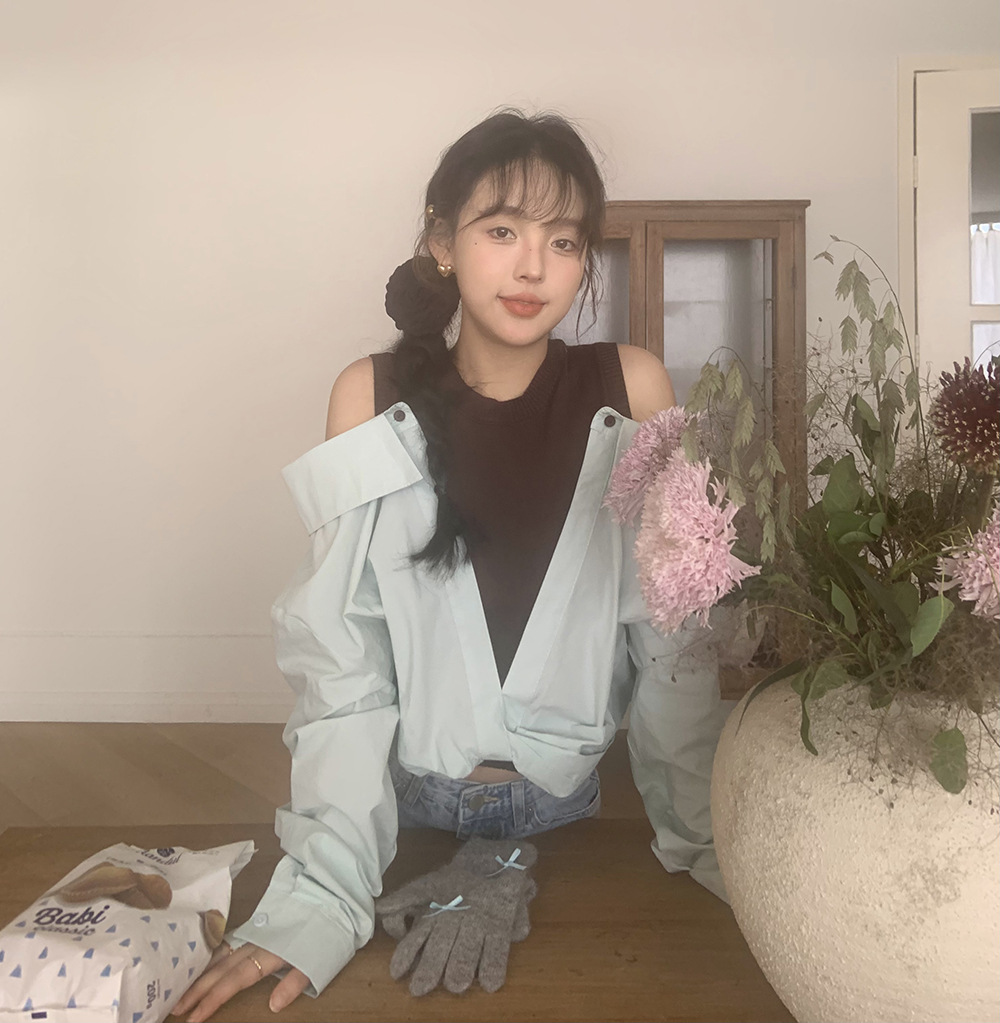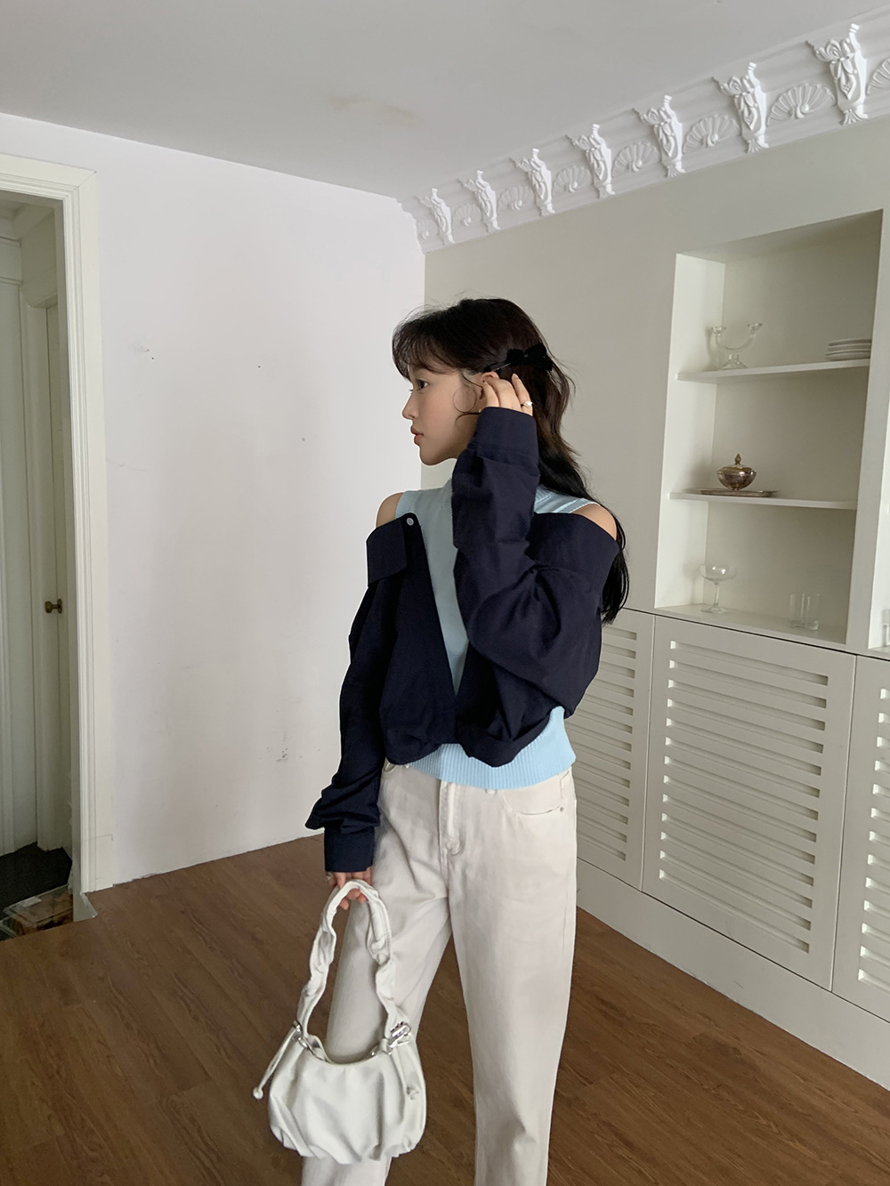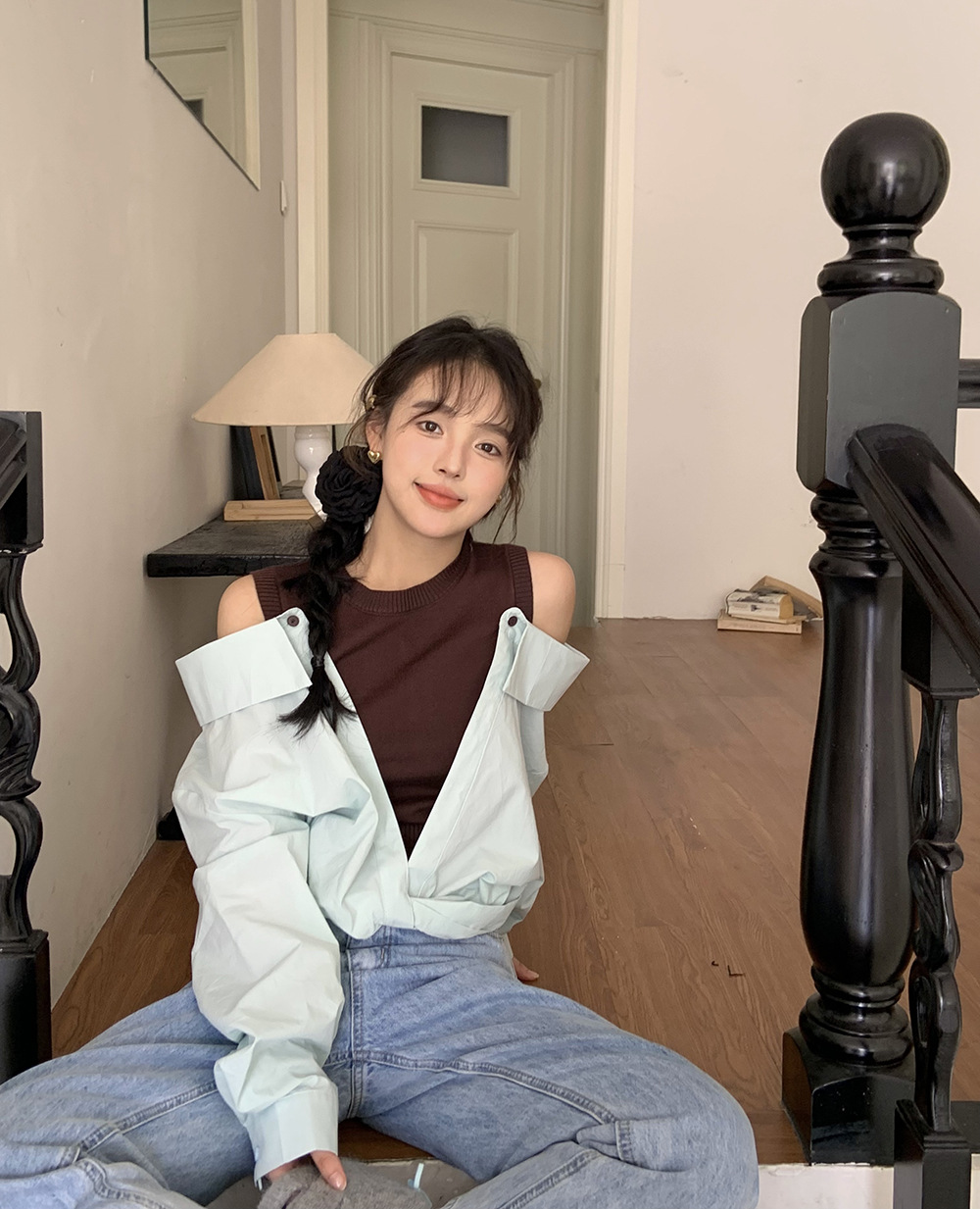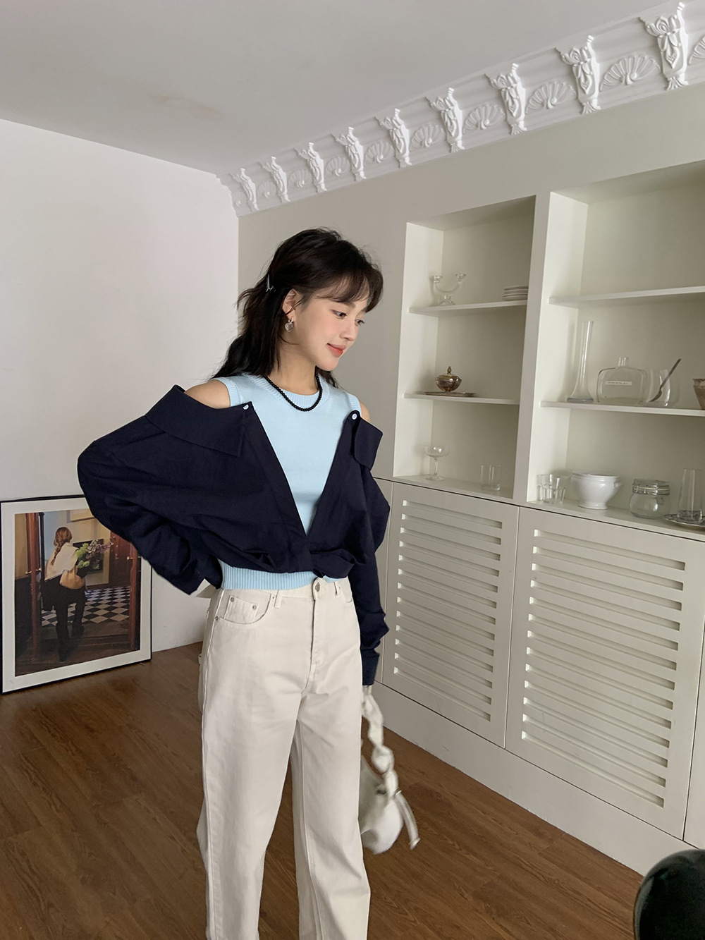 JMA-171 实拍秋季复古小众设计感减龄撞色露肩针织背心假两件拼接上衣衬衫
