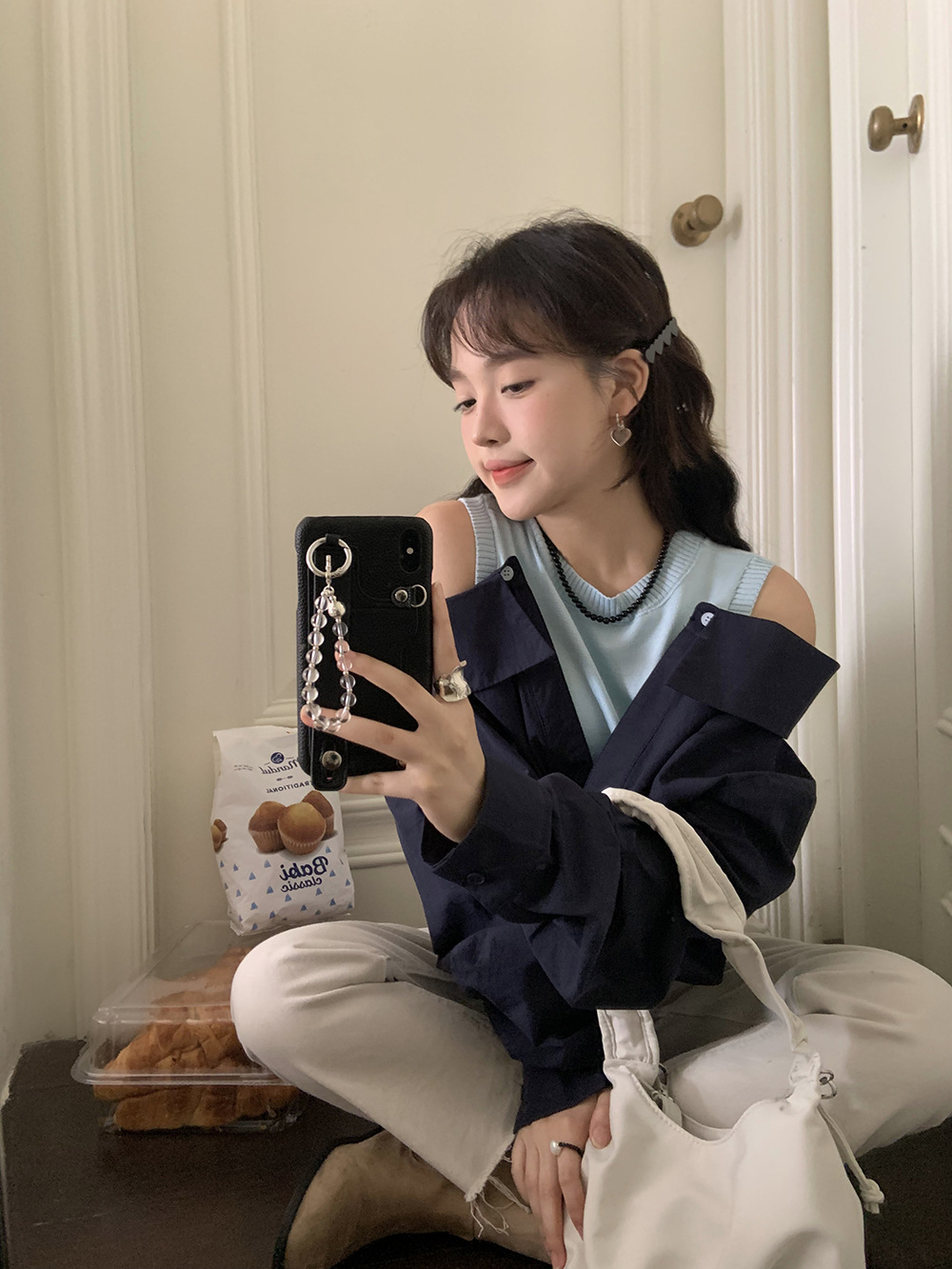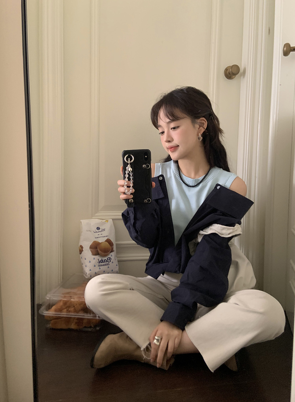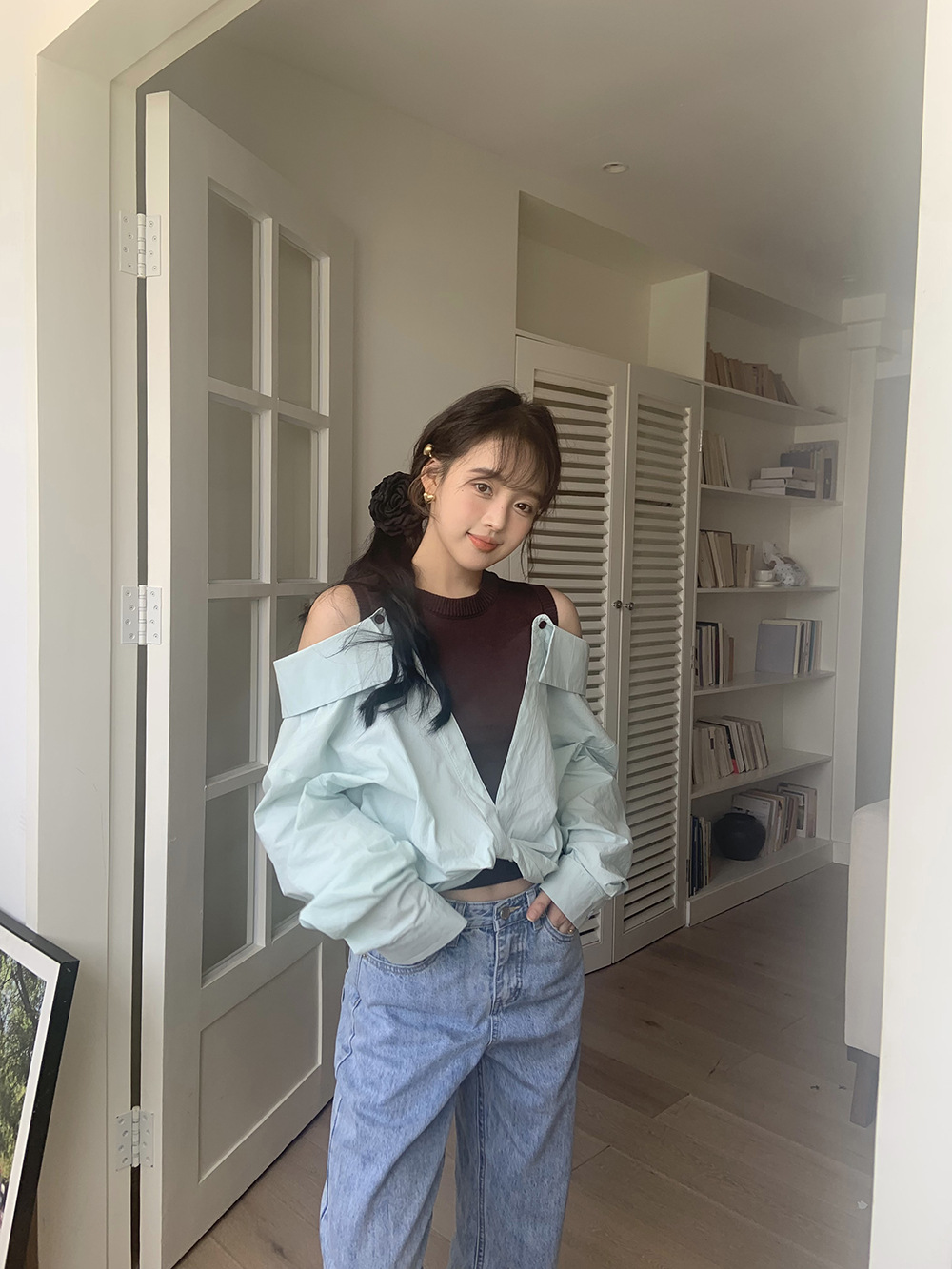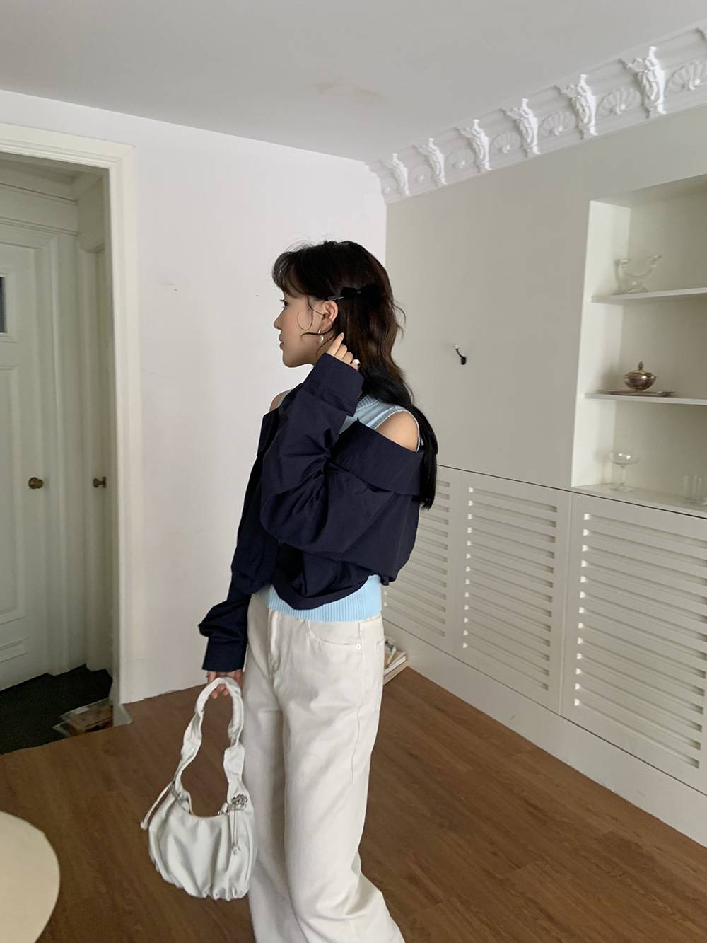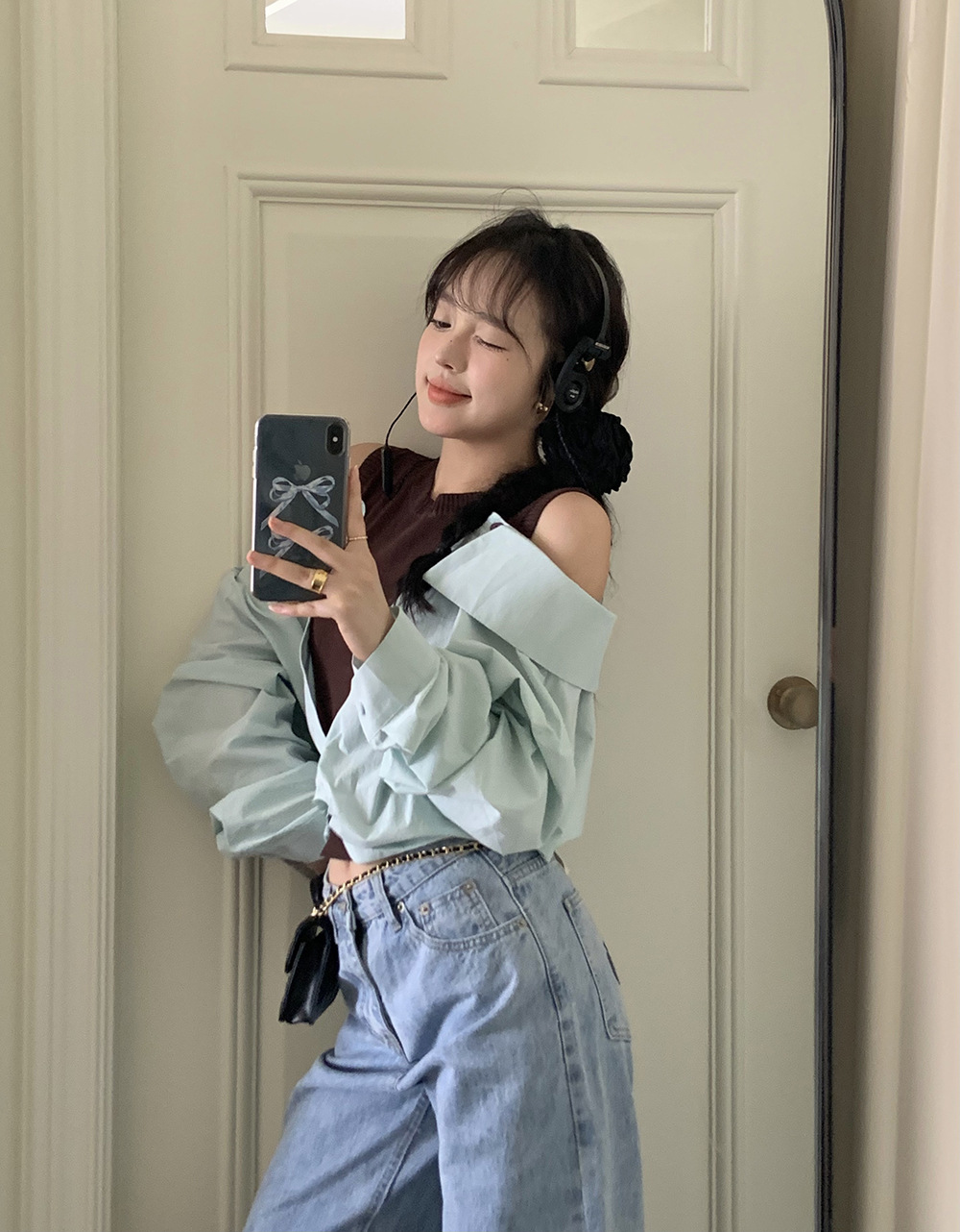 JMA-171 实拍秋季复古小众设计感减龄撞色露肩针织背心假两件拼接上衣衬衫