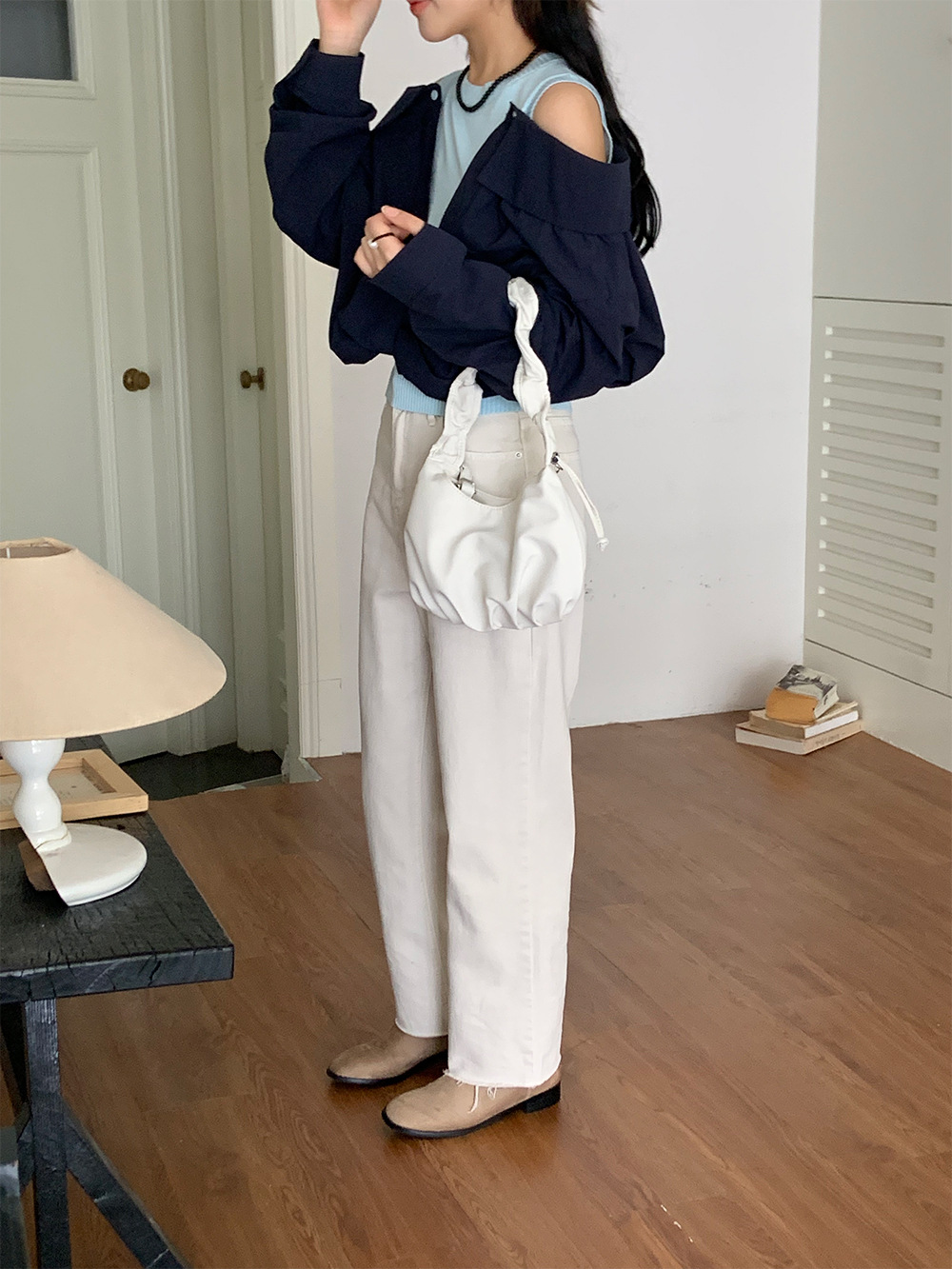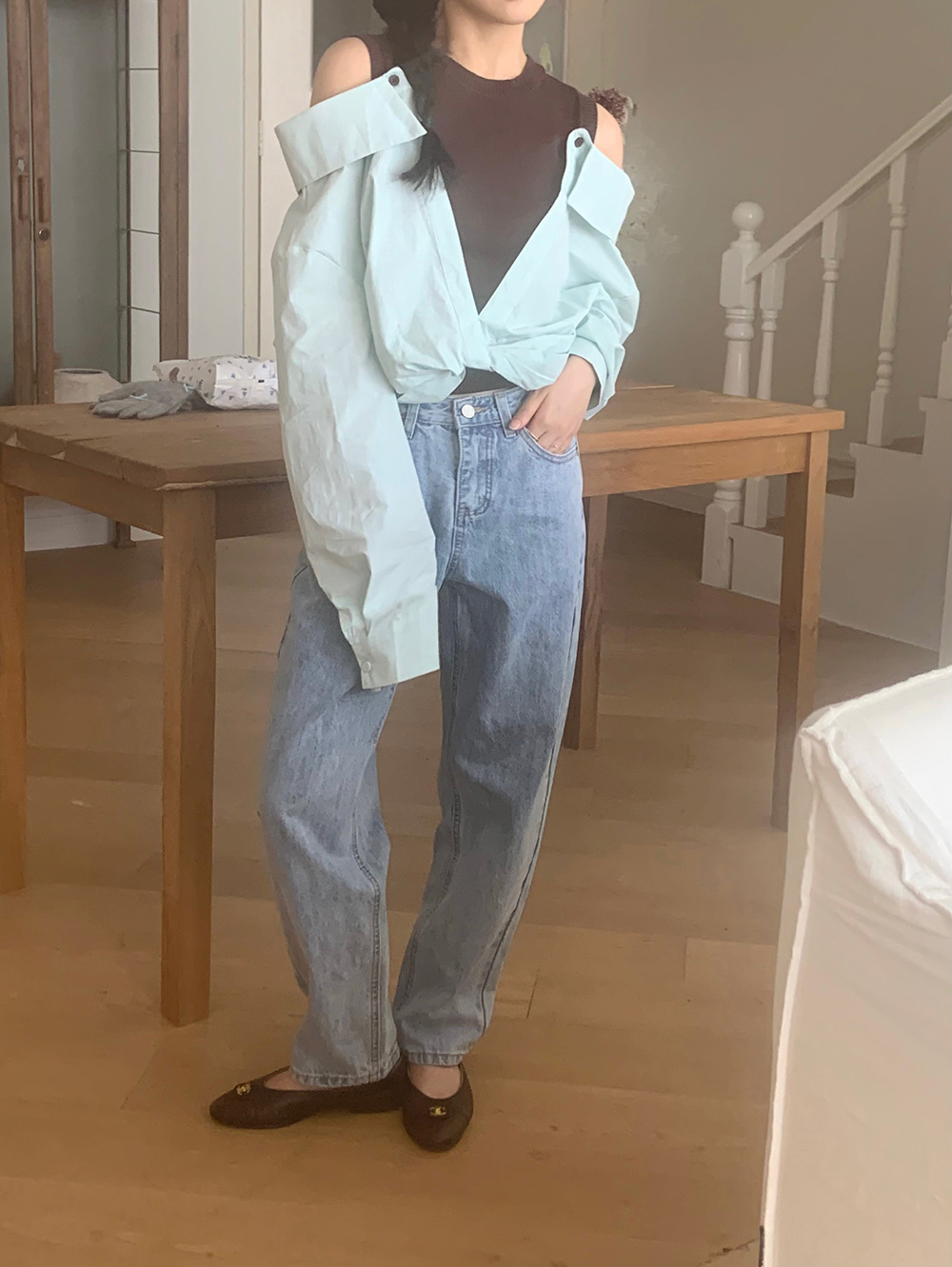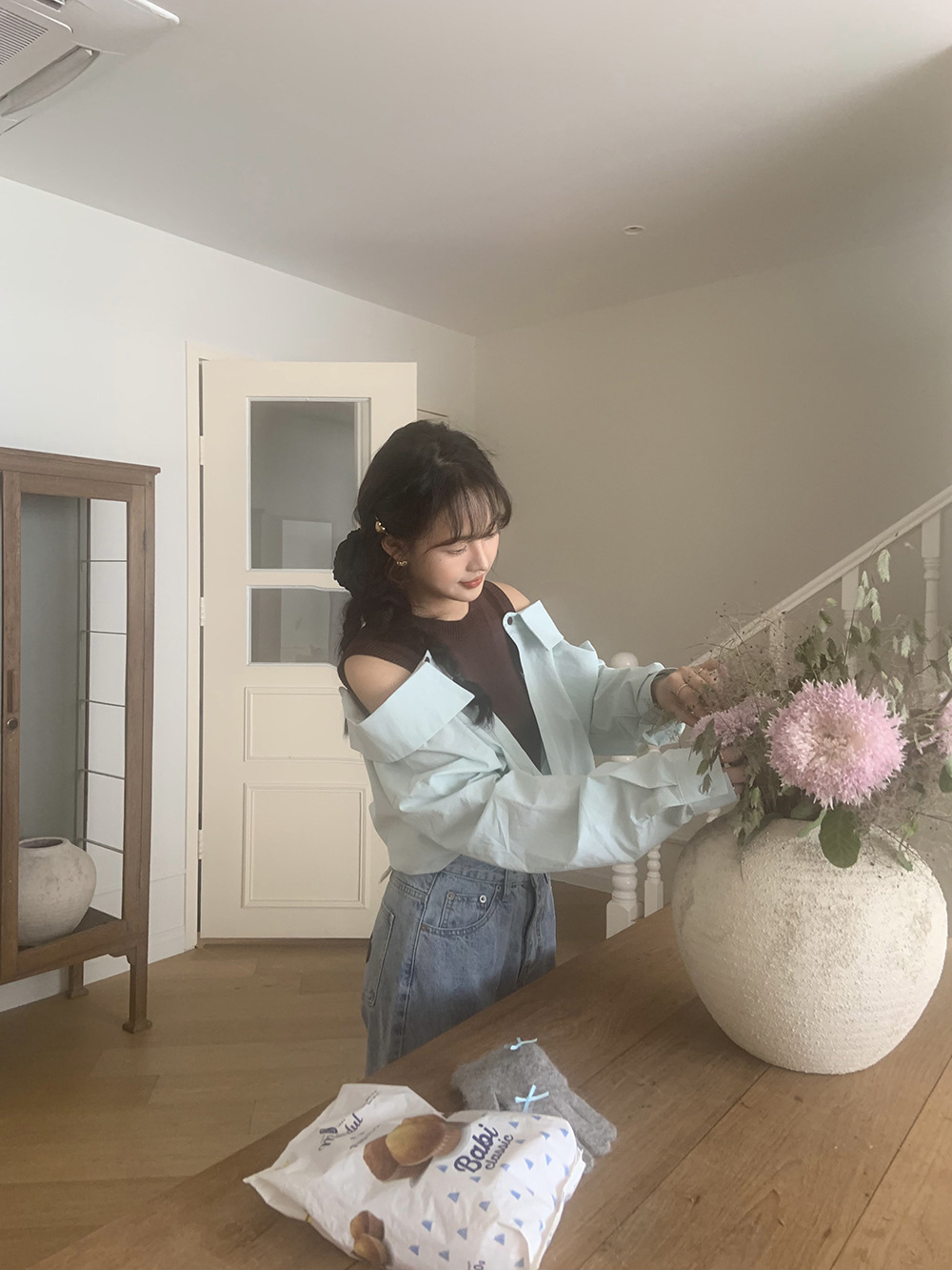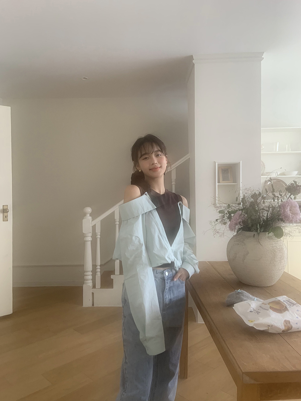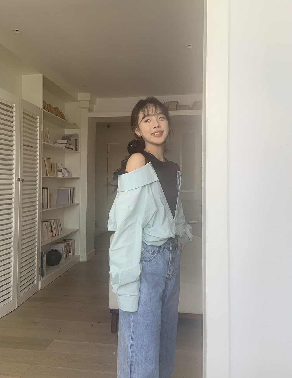 JMA-171 实拍秋季复古小众设计感减龄撞色露肩针织背心假两件拼接上衣衬衫