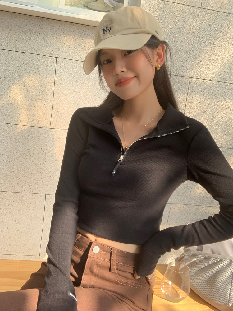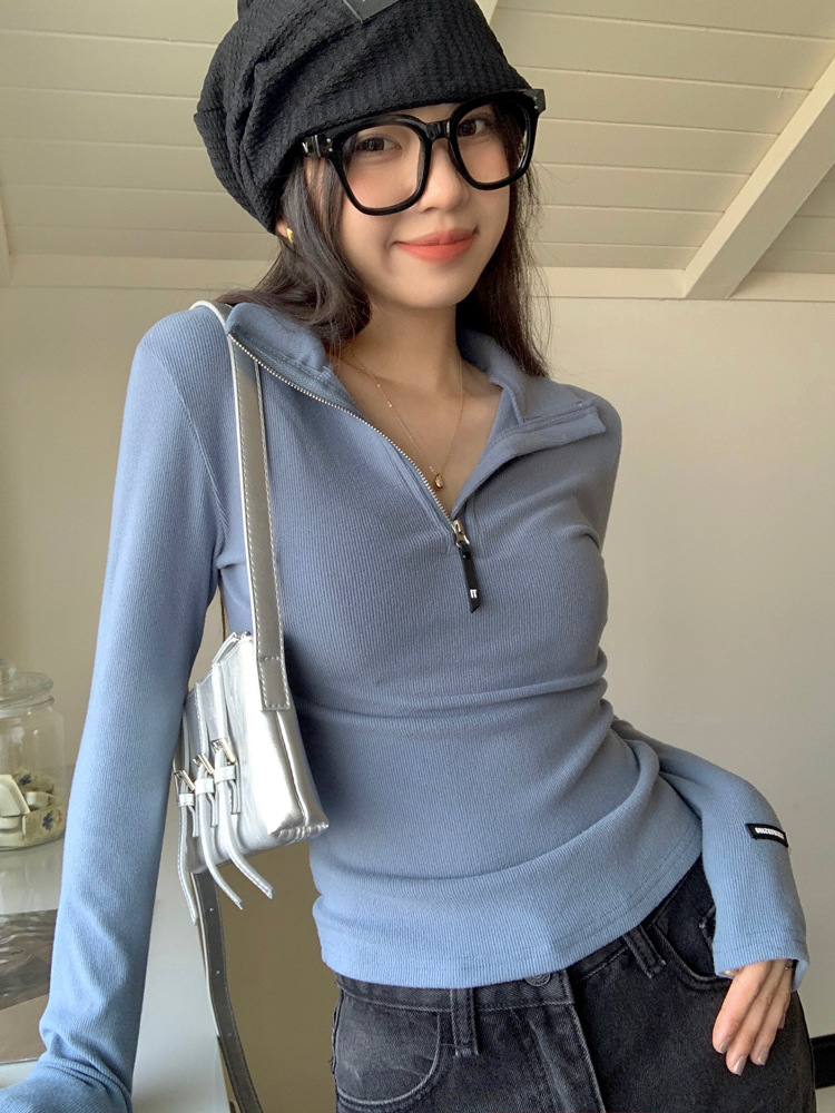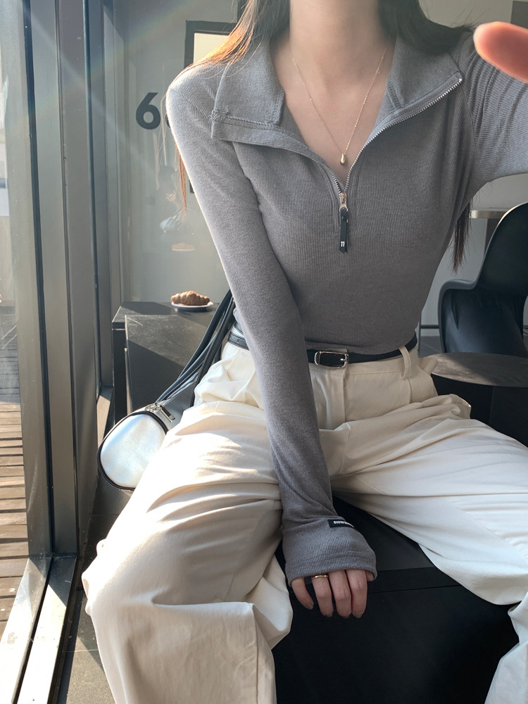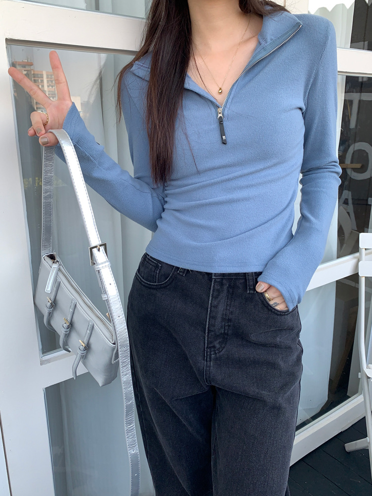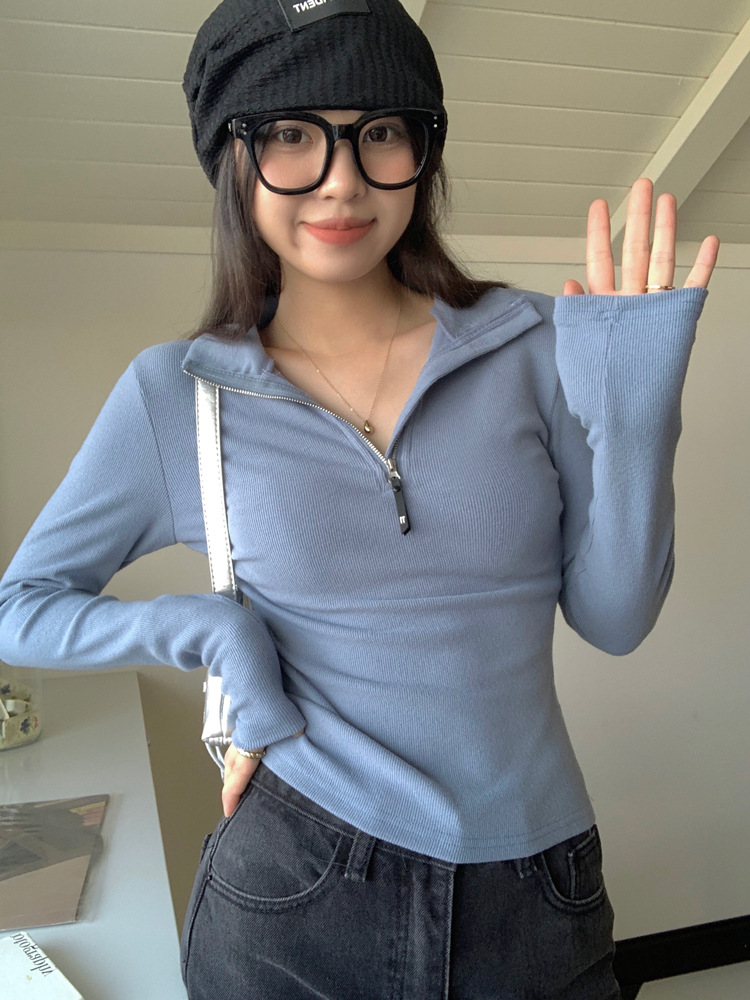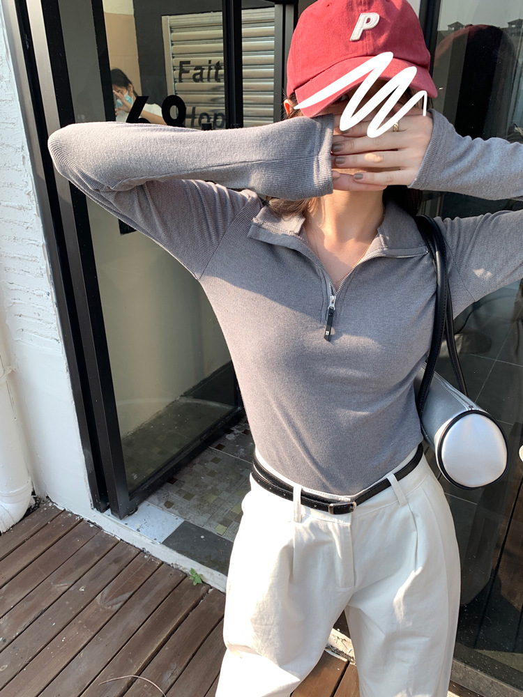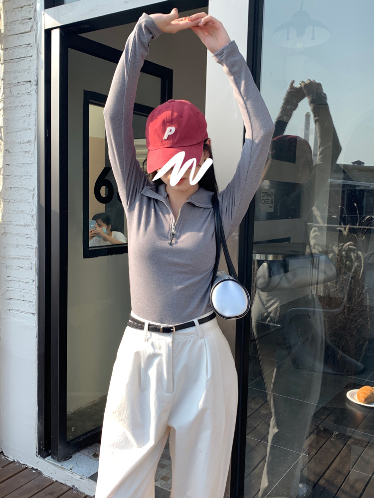 JMA-172 实拍 美式立领长袖T恤女2023秋季新款韩版气质修身长袖打底衫上衣