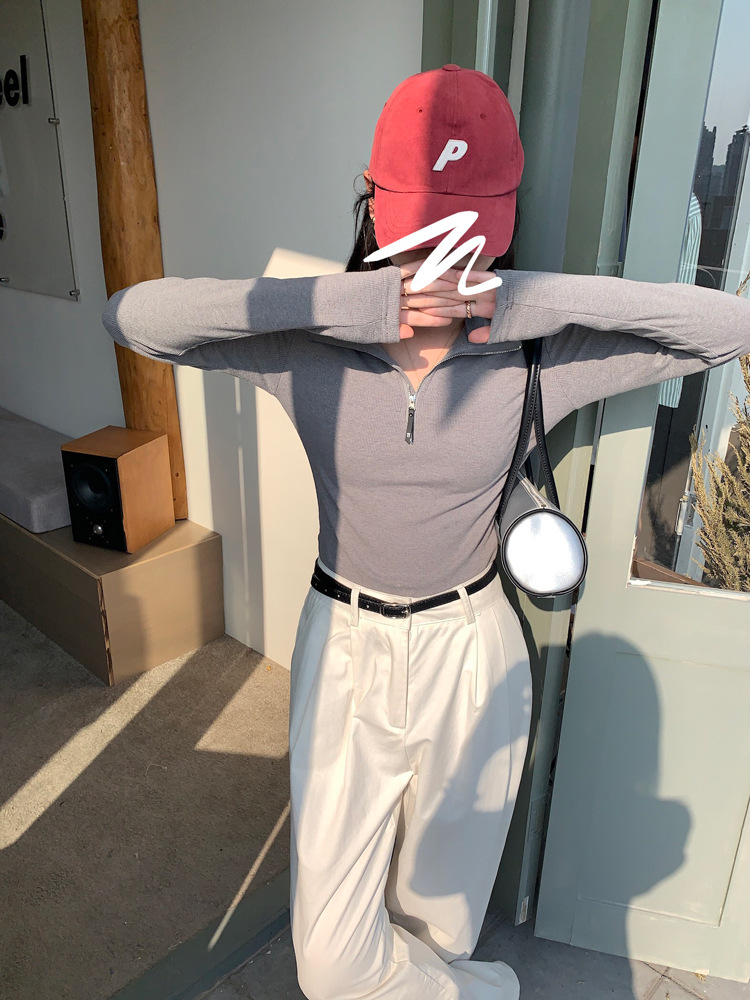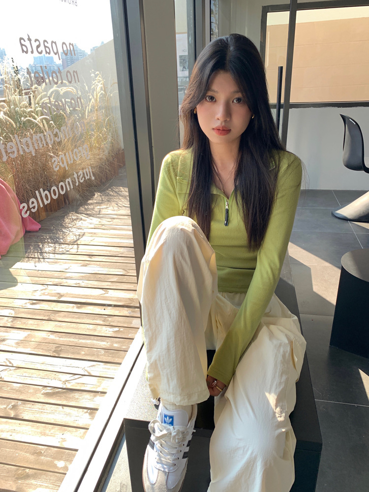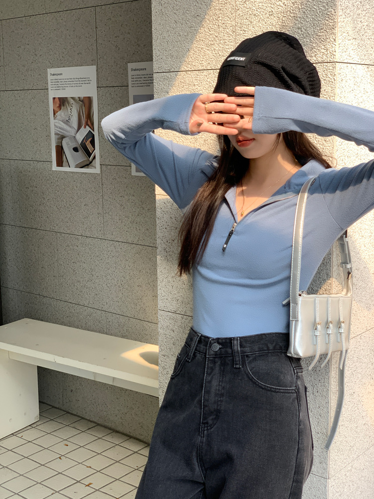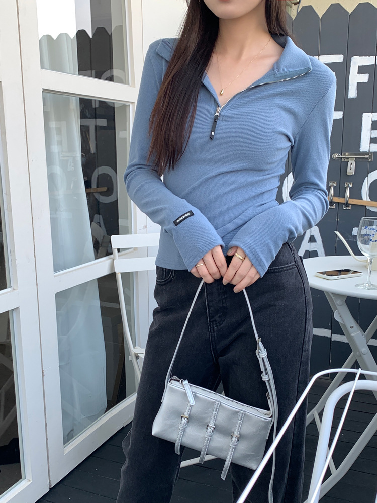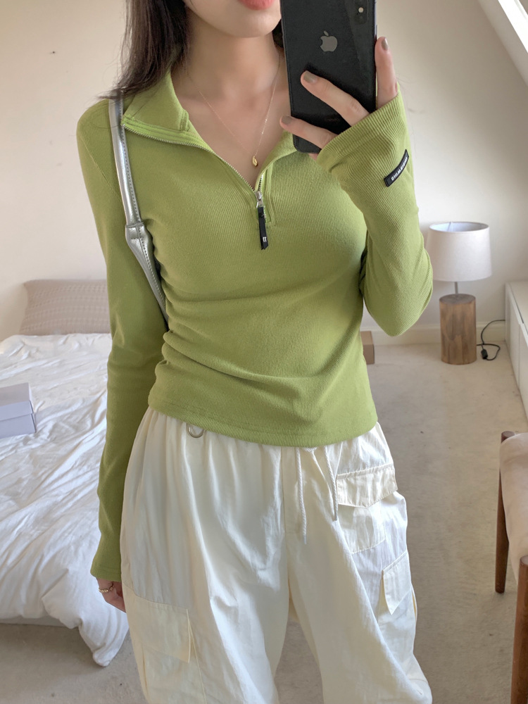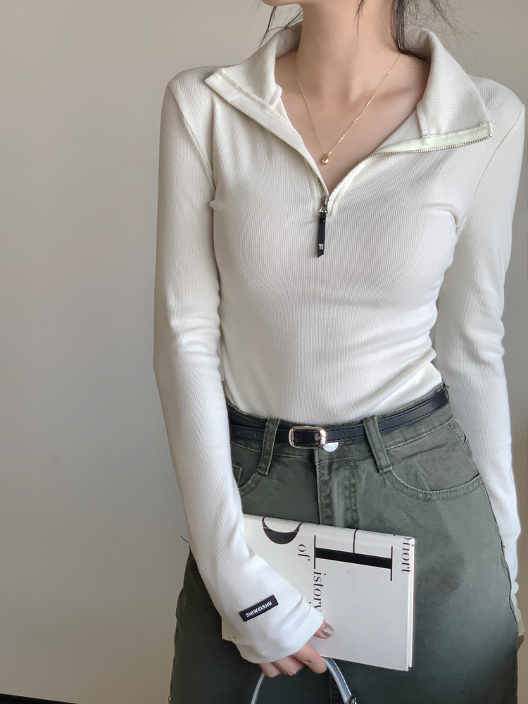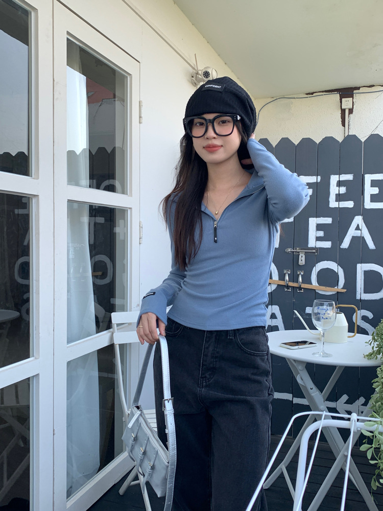 JMA-172 实拍 美式立领长袖T恤女2023秋季新款韩版气质修身长袖打底衫上衣