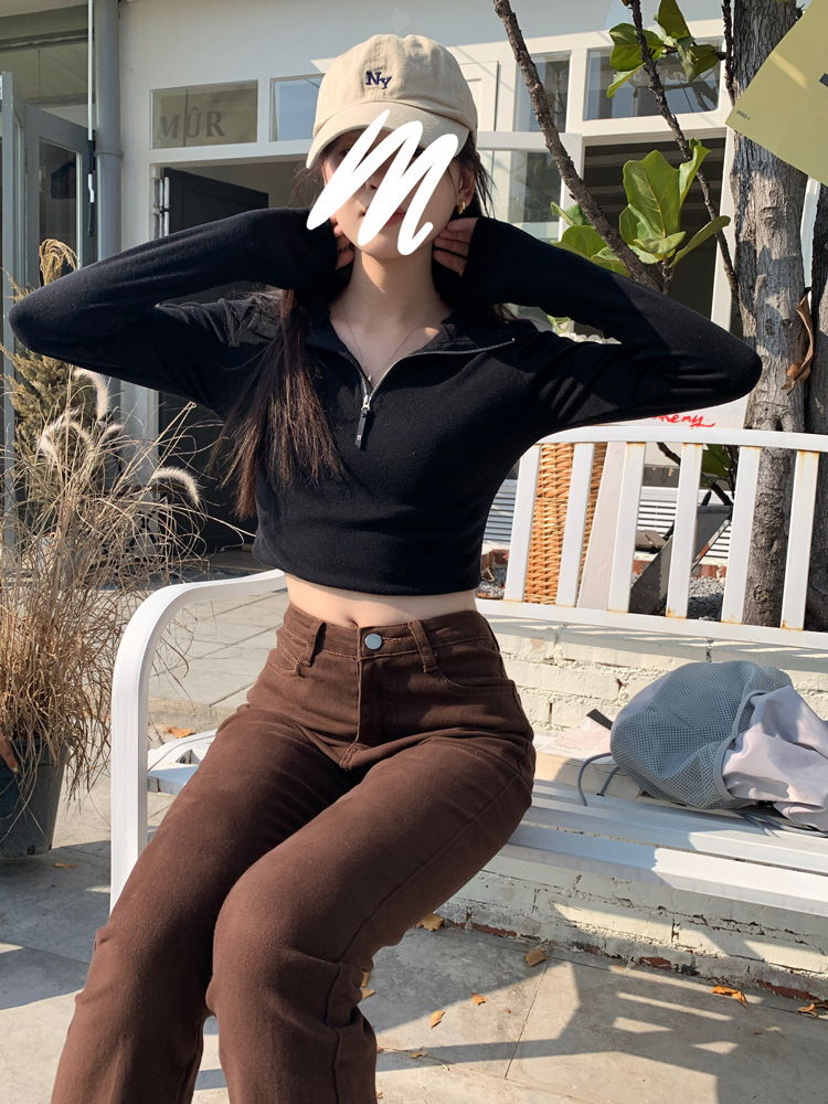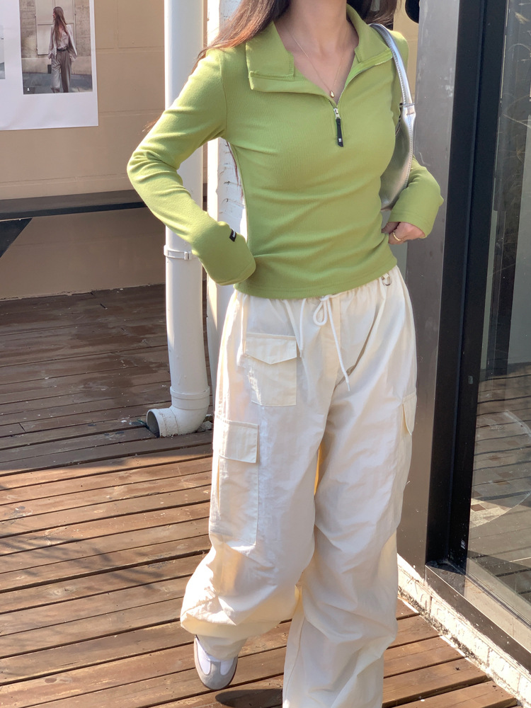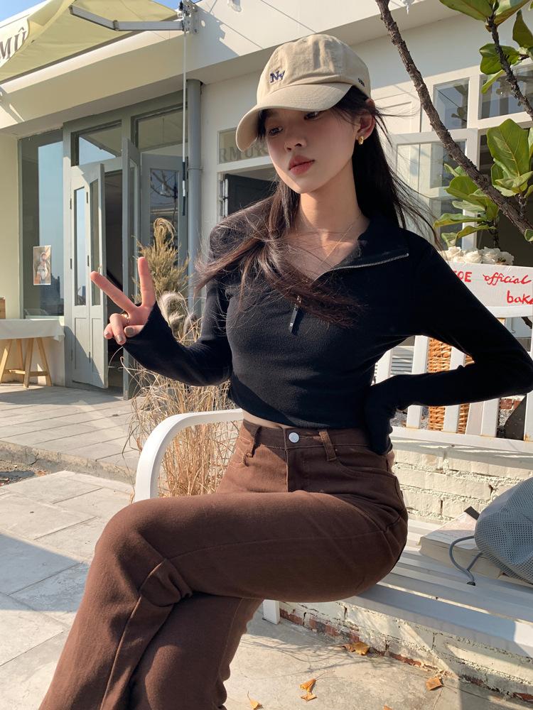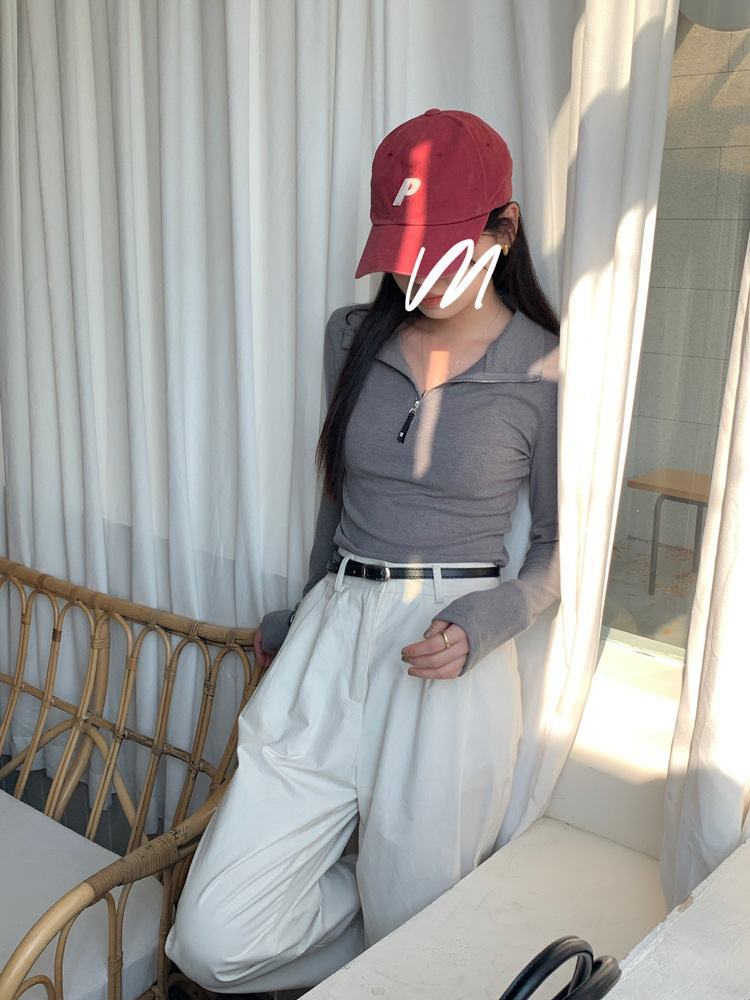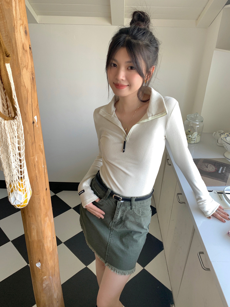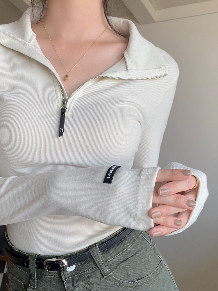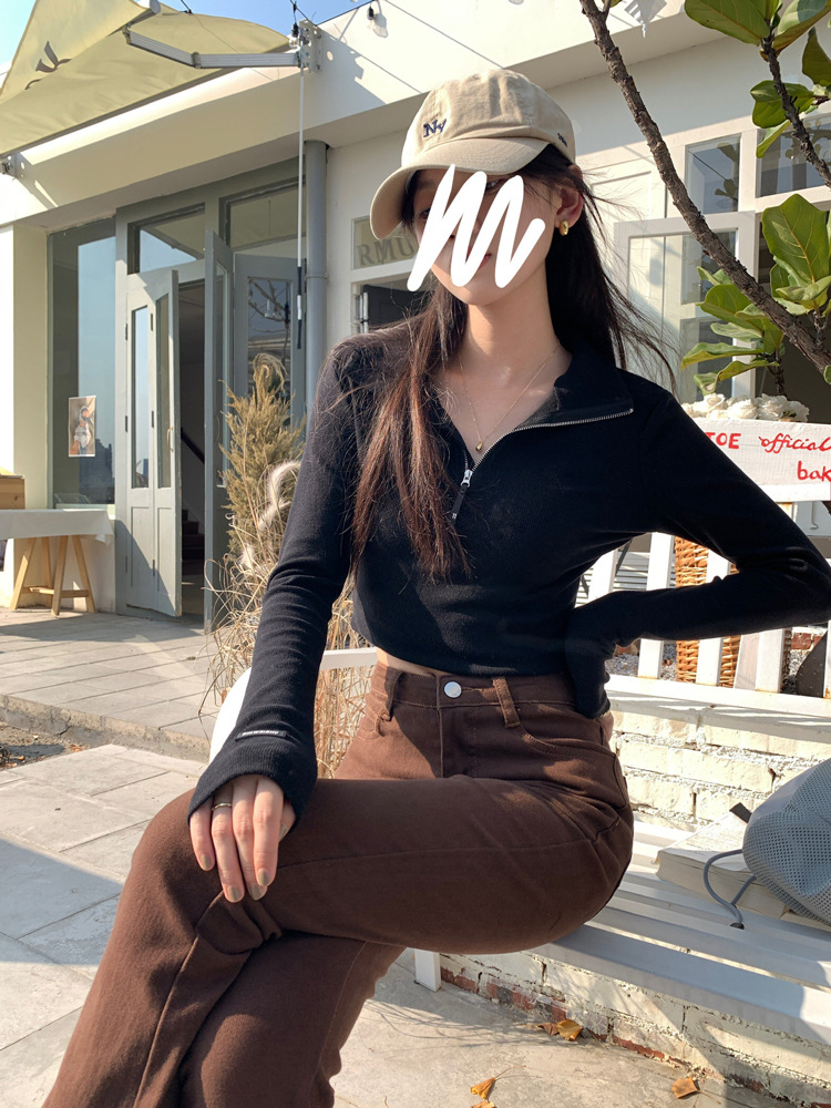 JMA-172 实拍 美式立领长袖T恤女2023秋季新款韩版气质修身长袖打底衫上衣