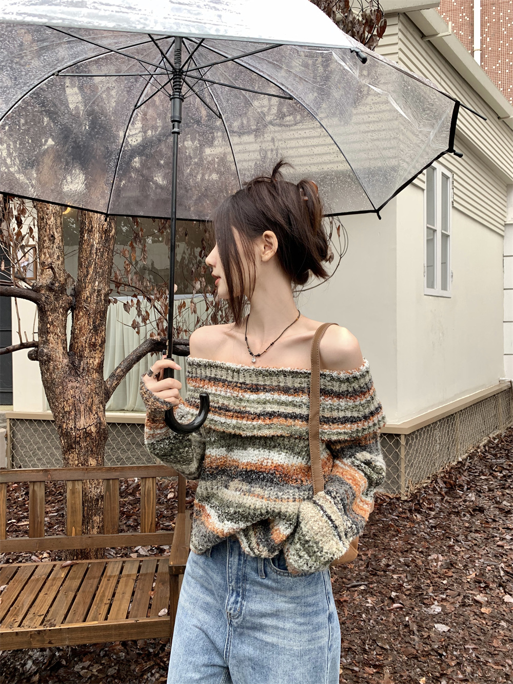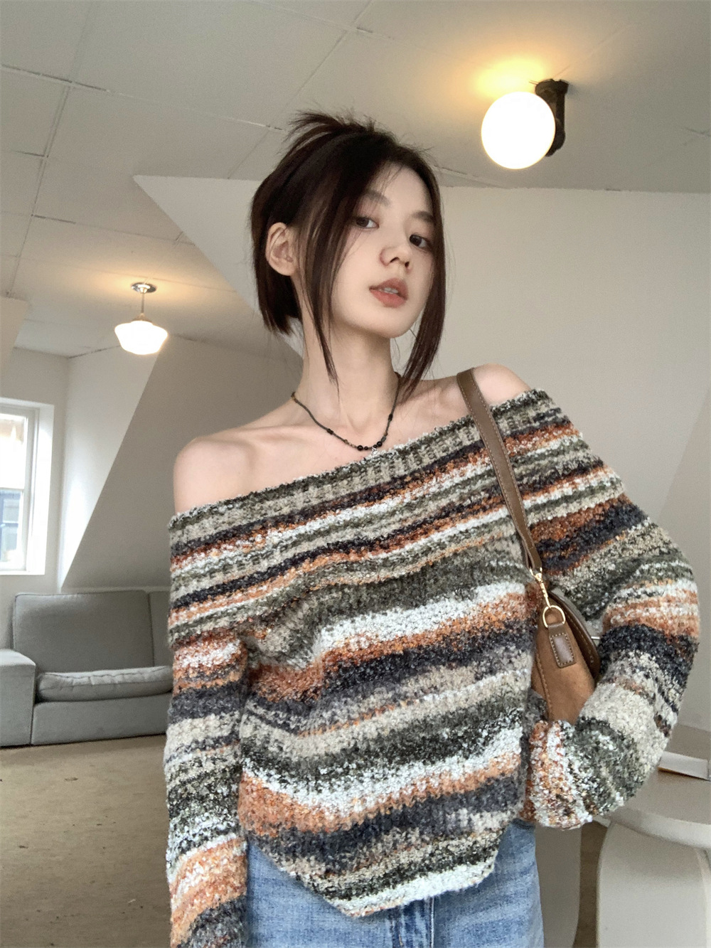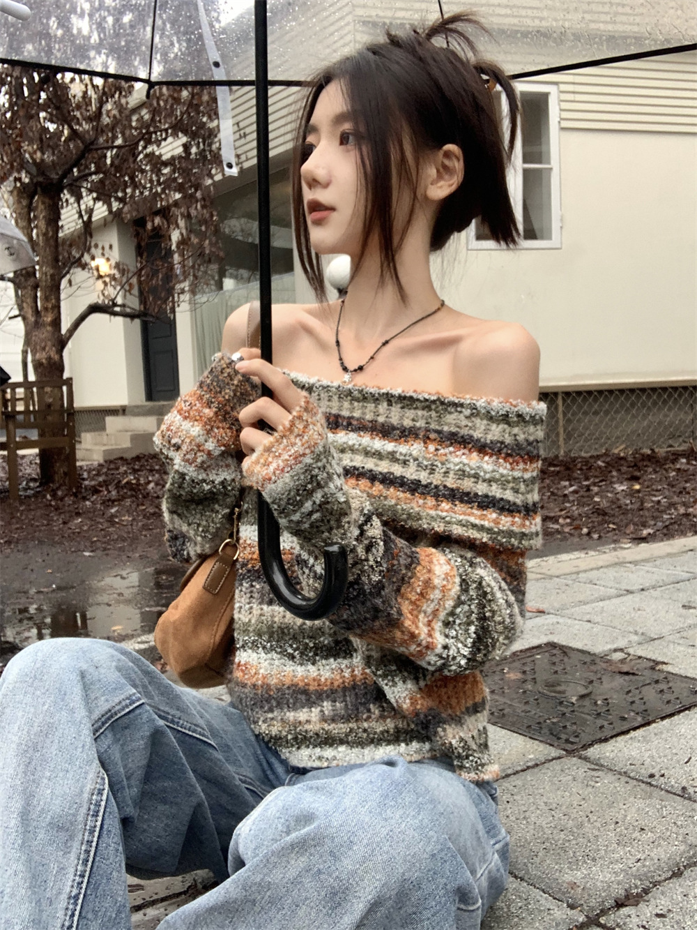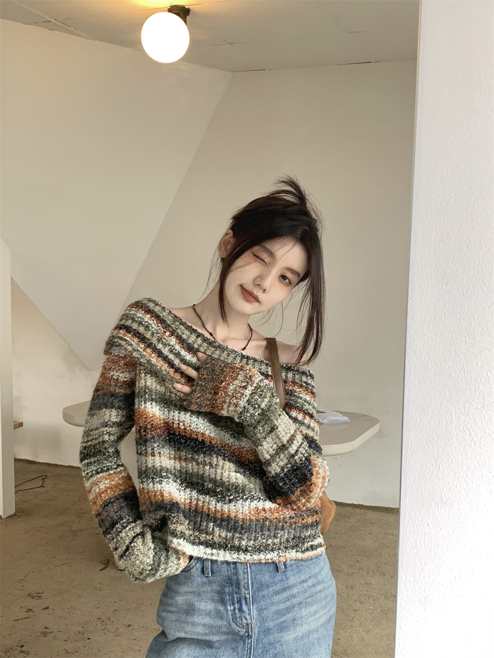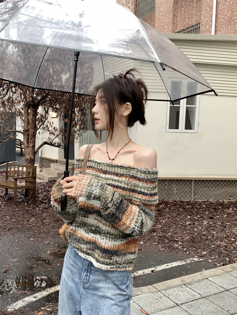 JMA-181 实拍 2023秋冬韩版混色油画锁骨短款毛衣女甜辣风露肩长袖针织衫