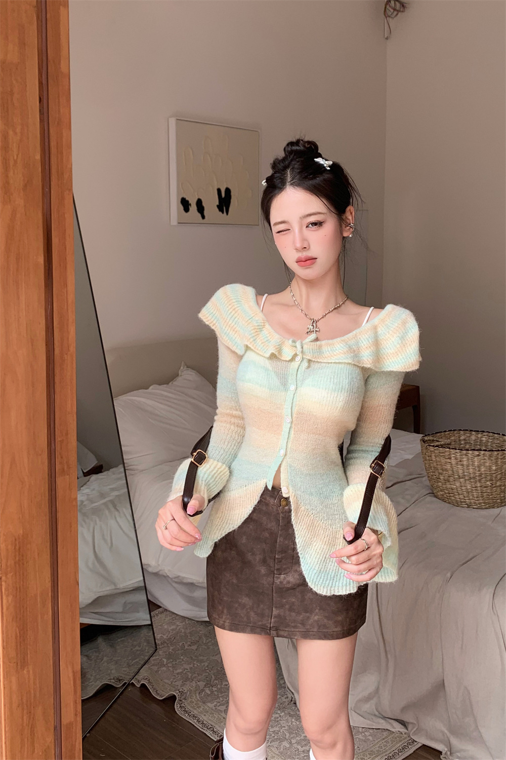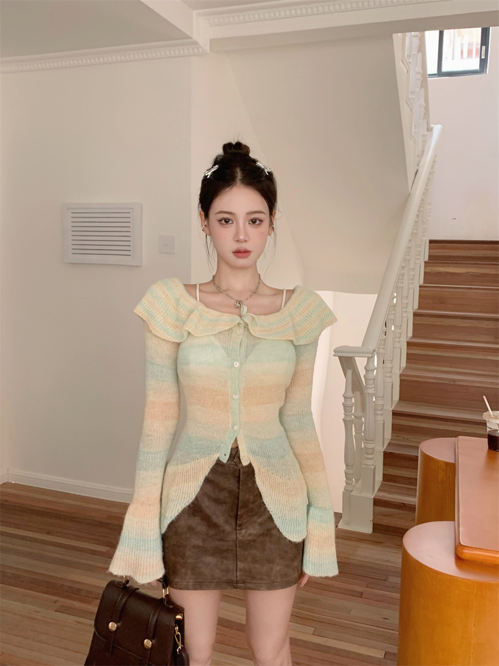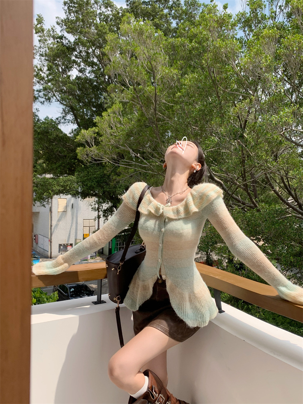 JMA-182 实拍 秋冬设计感梦幻条纹海马荷叶边短款修身显瘦喇叭袖针织开衫