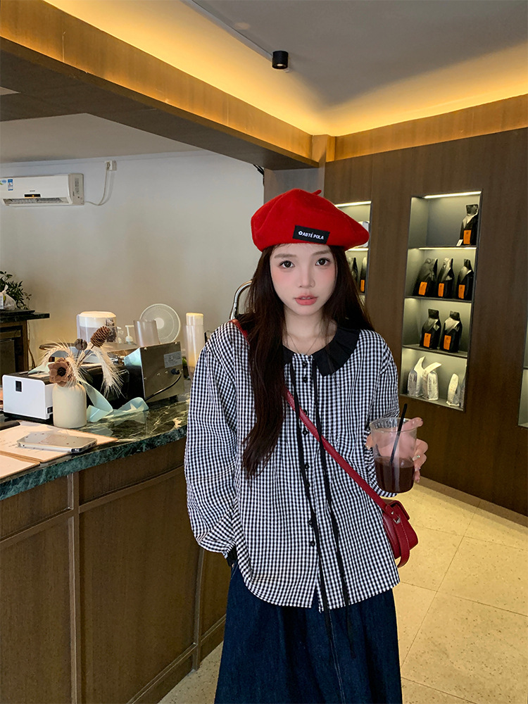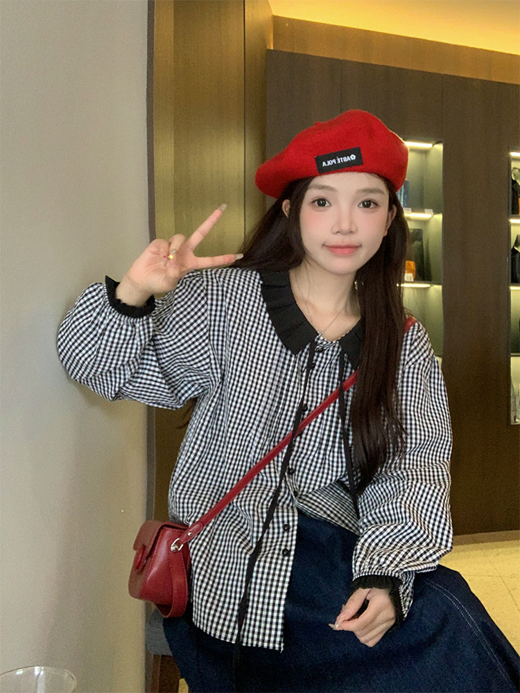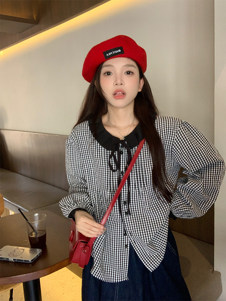 JMA-184 实拍 2023秋季新款韩系chic简约撞色格子小翻领百搭长袖衬衫女