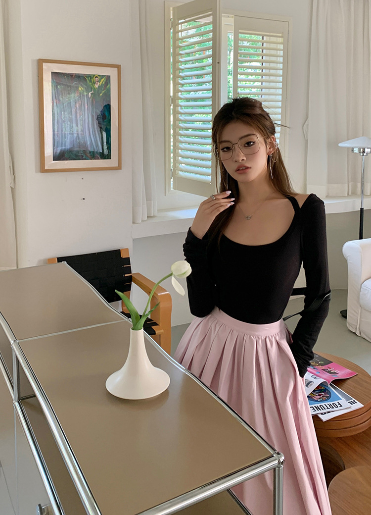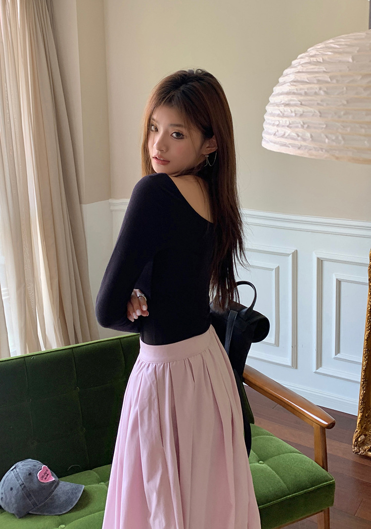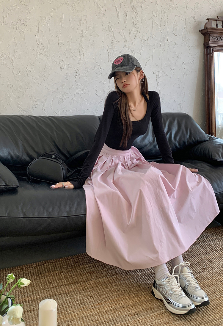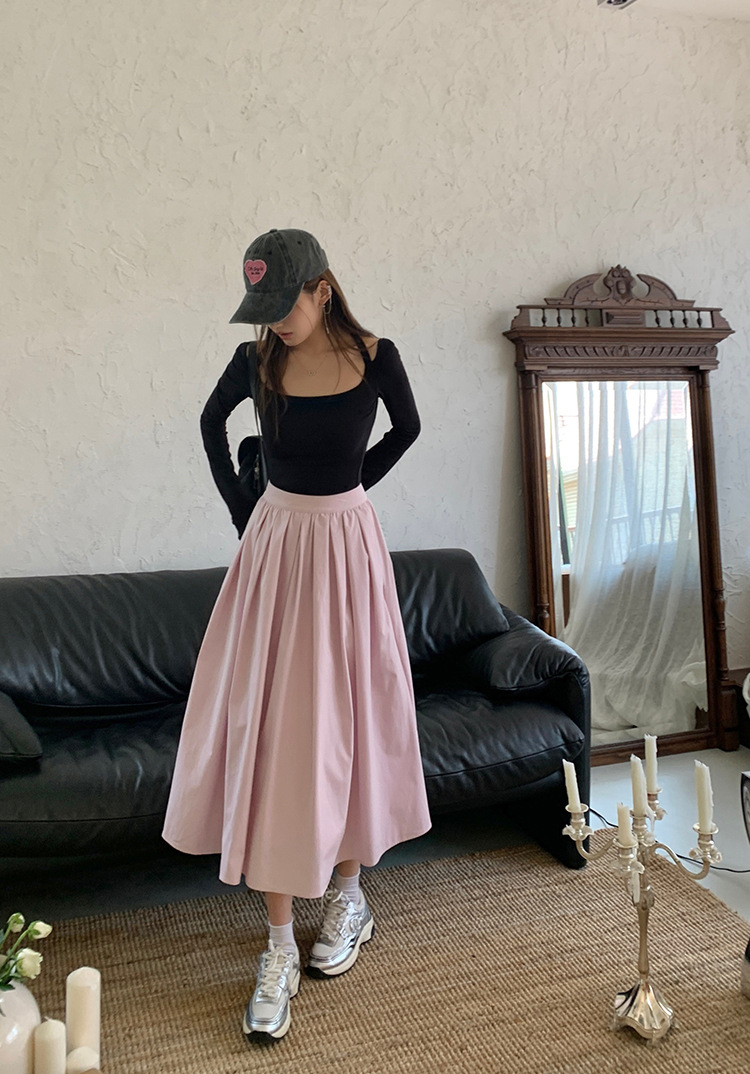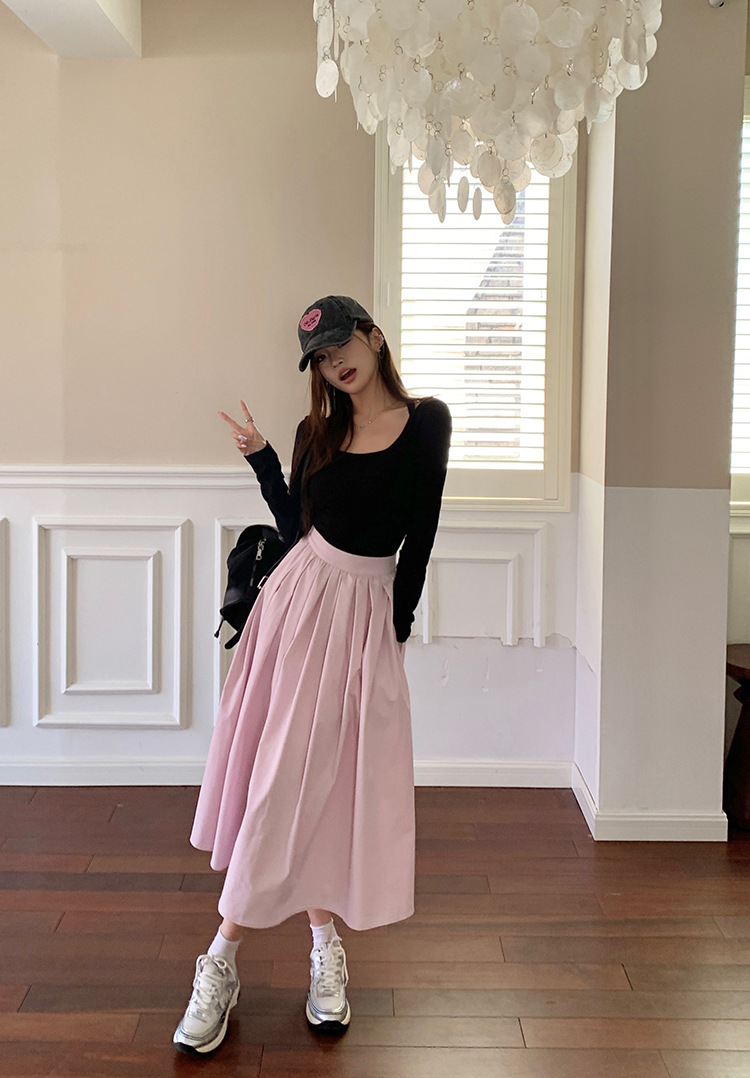JMA-185 实拍 2023初秋季新款韩版甜美粉大摆A字版型褶皱中长裙女半身裙子
