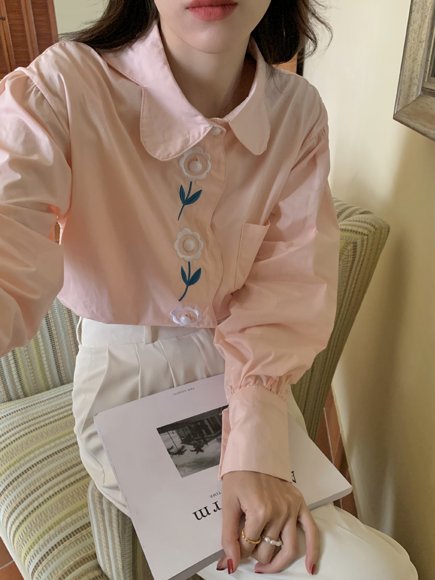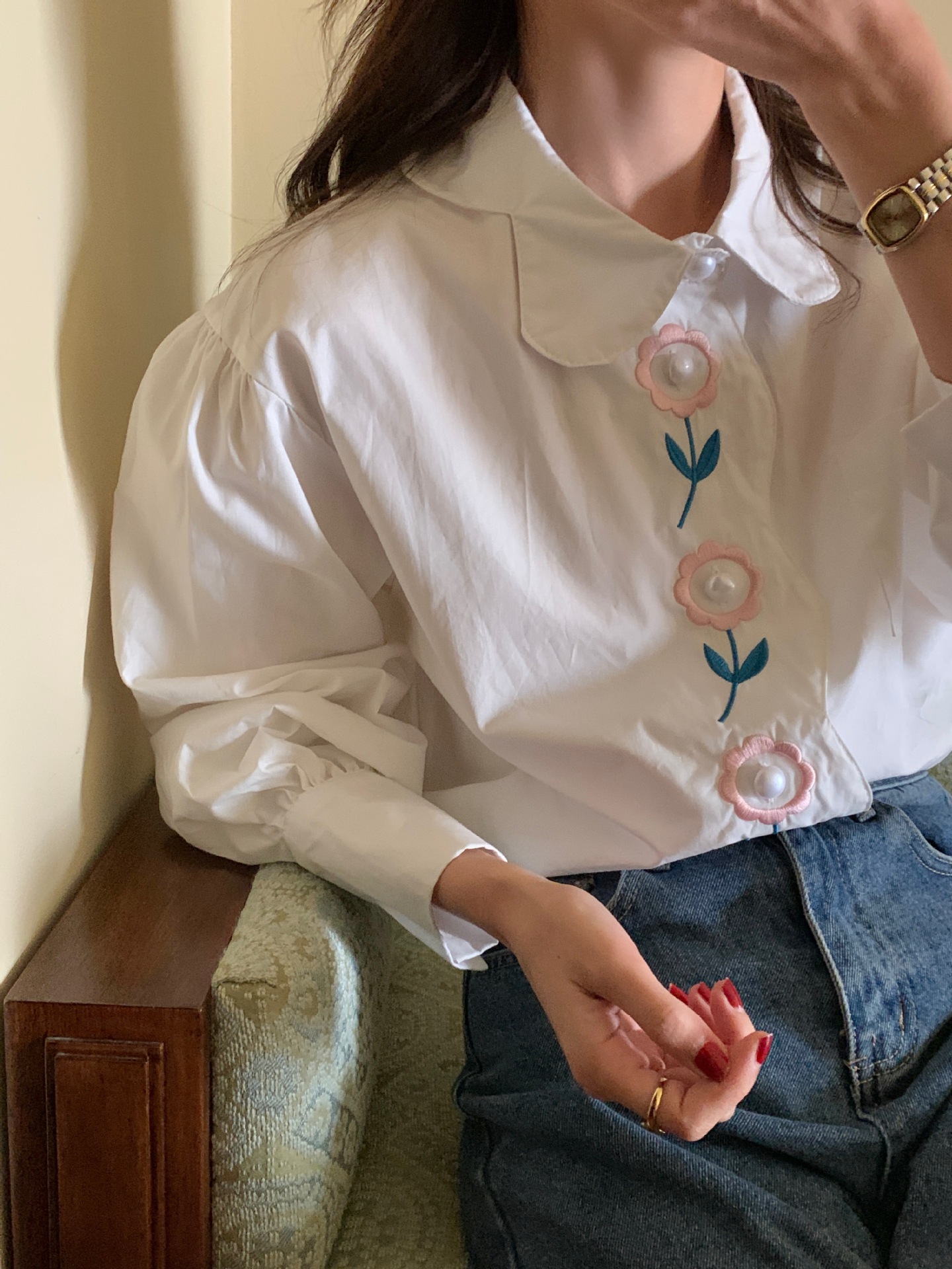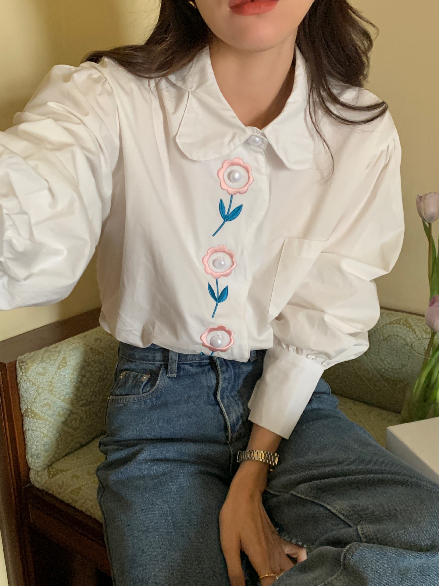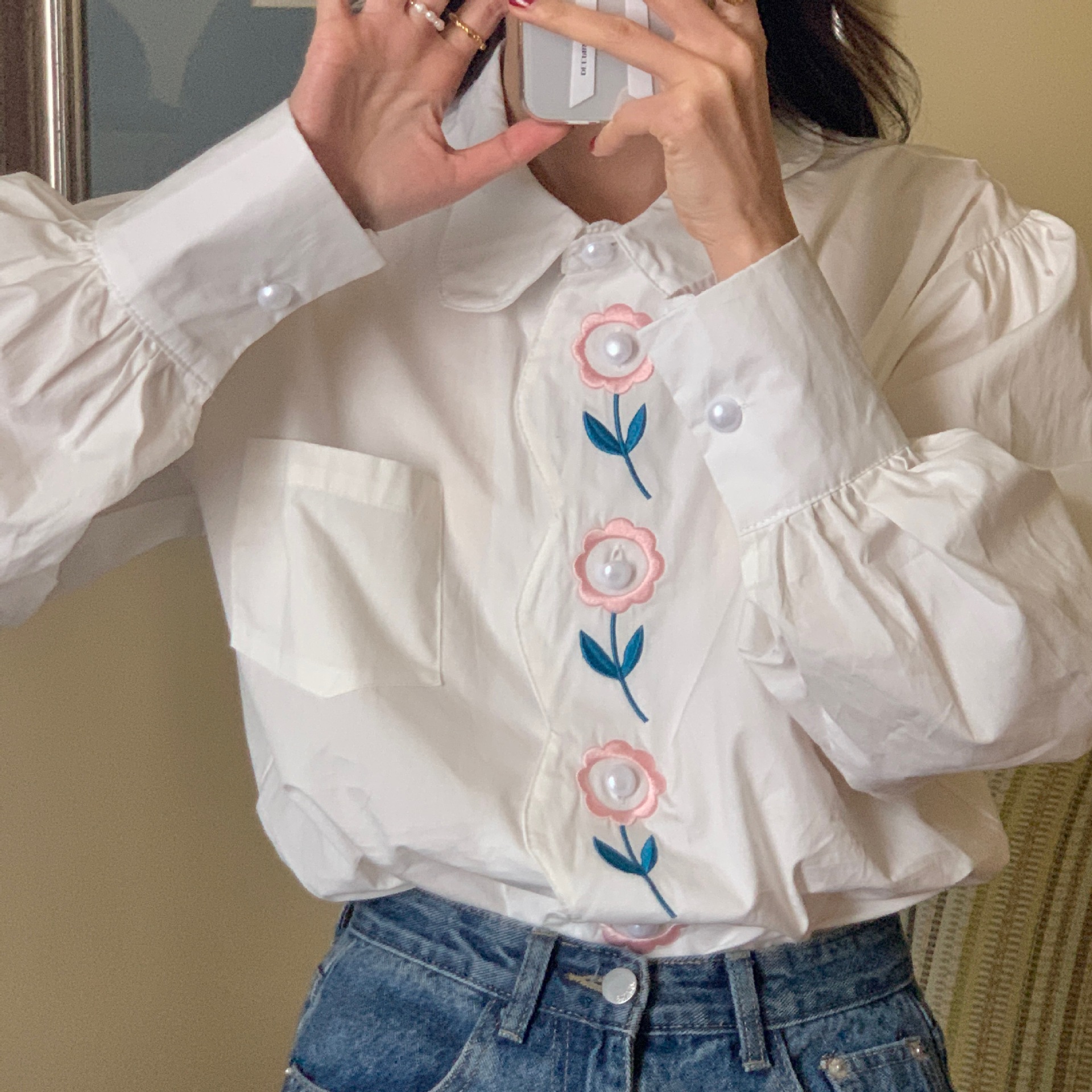 JMA-190 实拍2023秋季韩系甜美减龄刺绣重工小众口袋珍珠扣波浪领宽松衬衫