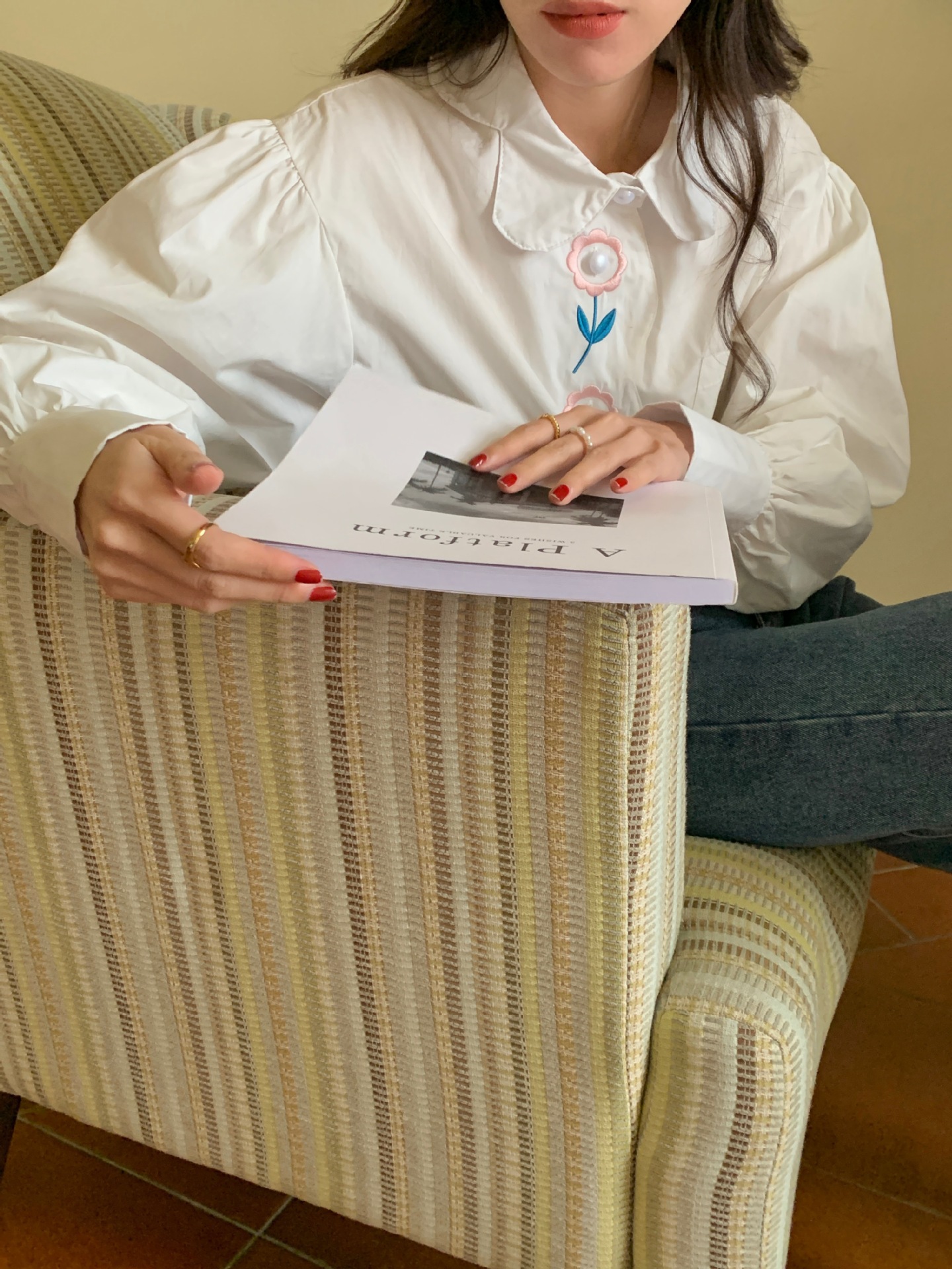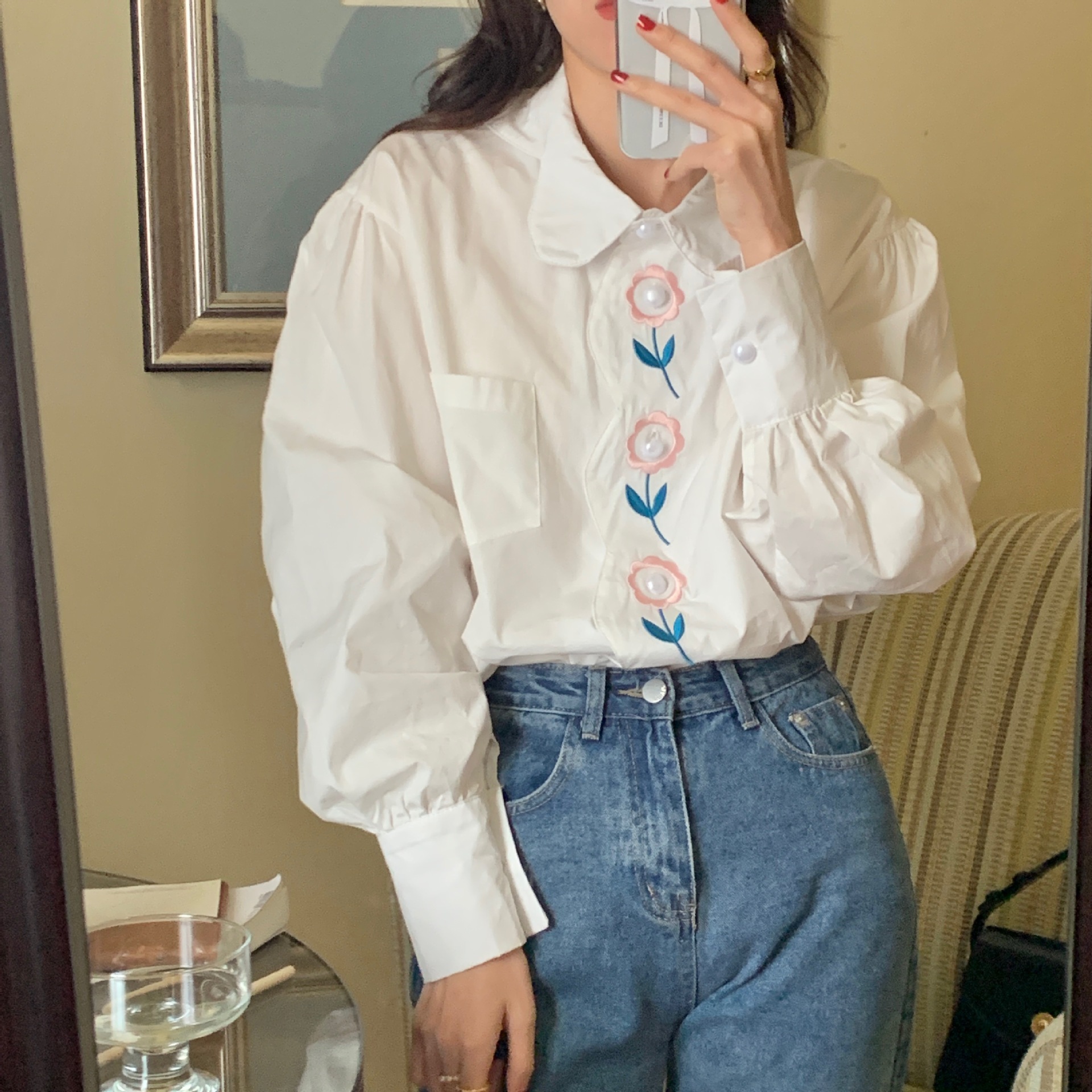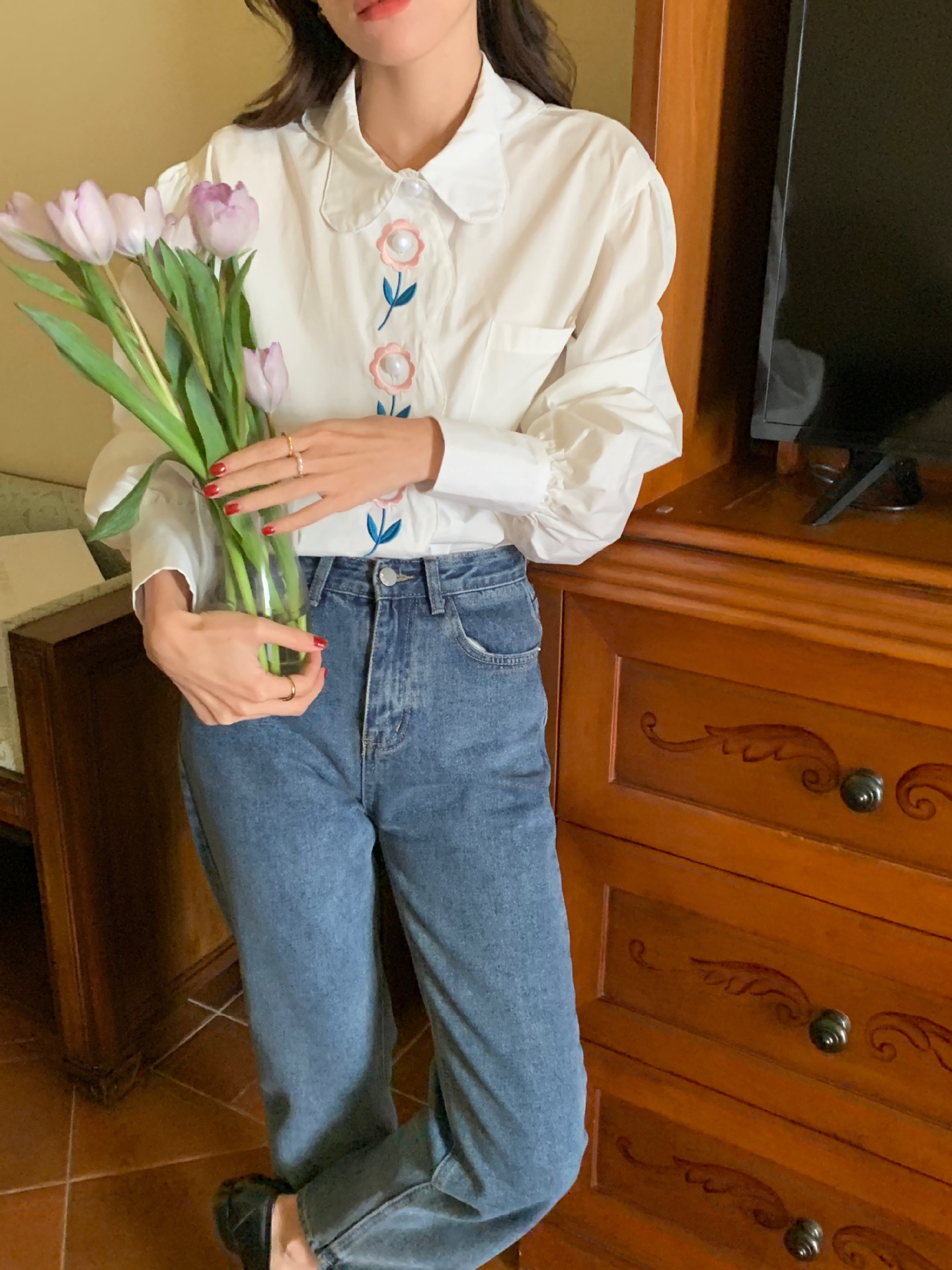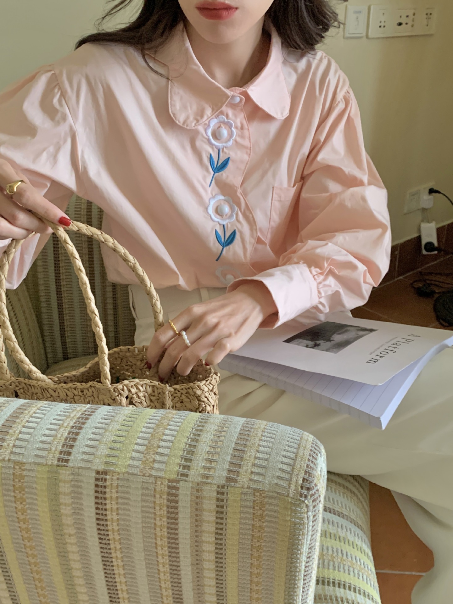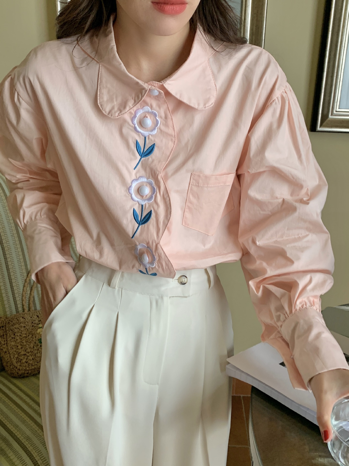 JMA-190 实拍2023秋季韩系甜美减龄刺绣重工小众口袋珍珠扣波浪领宽松衬衫