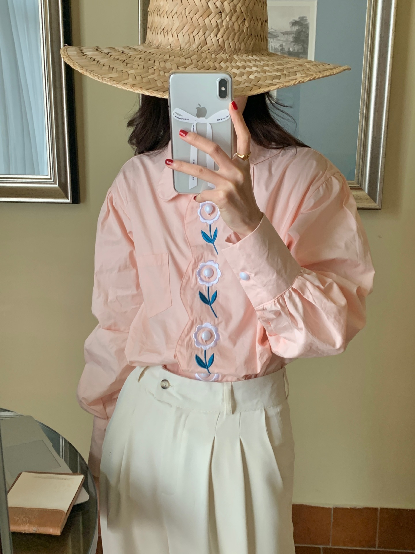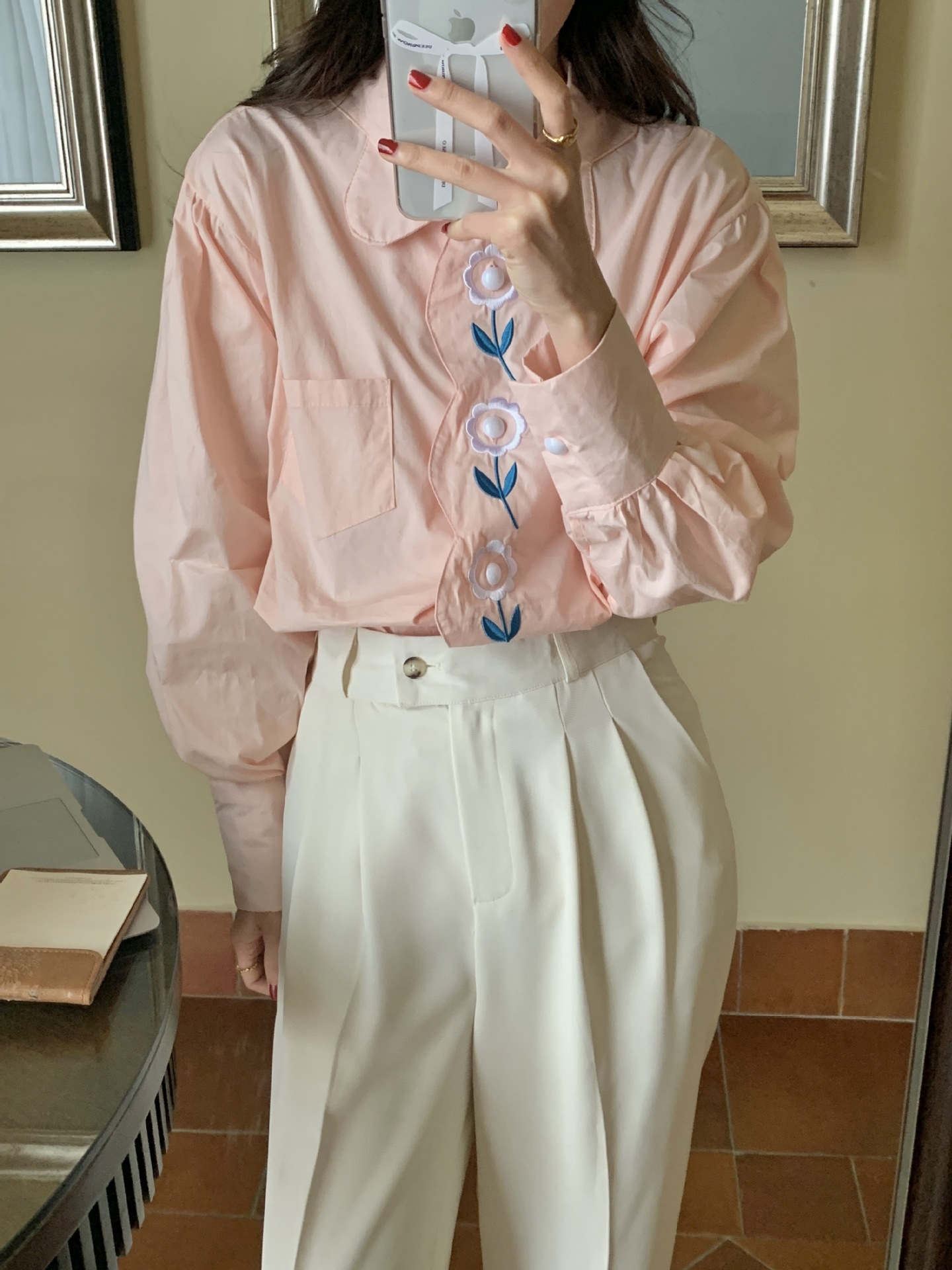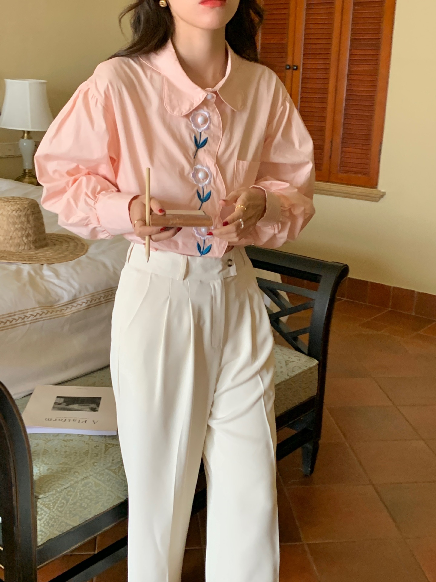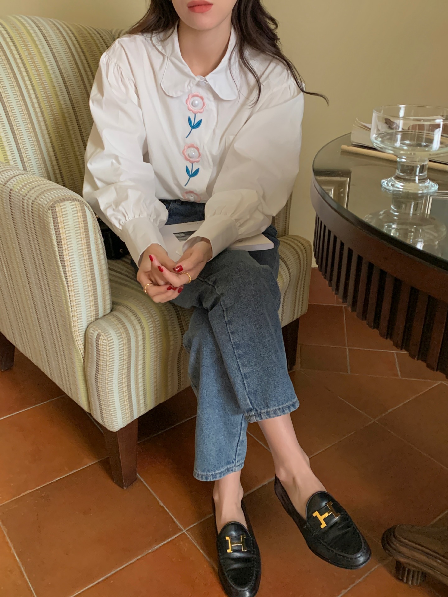 JMA-190 实拍2023秋季韩系甜美减龄刺绣重工小众口袋珍珠扣波浪领宽松衬衫