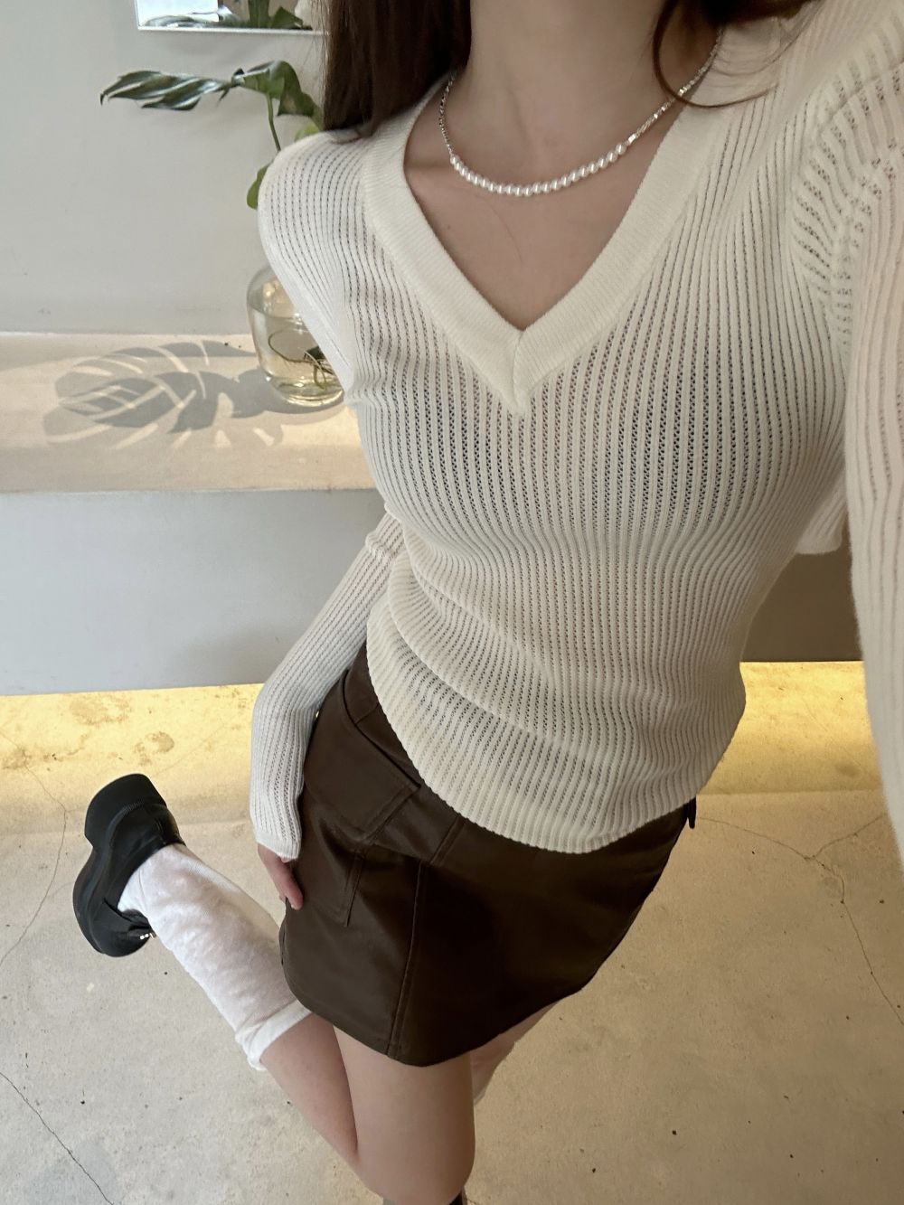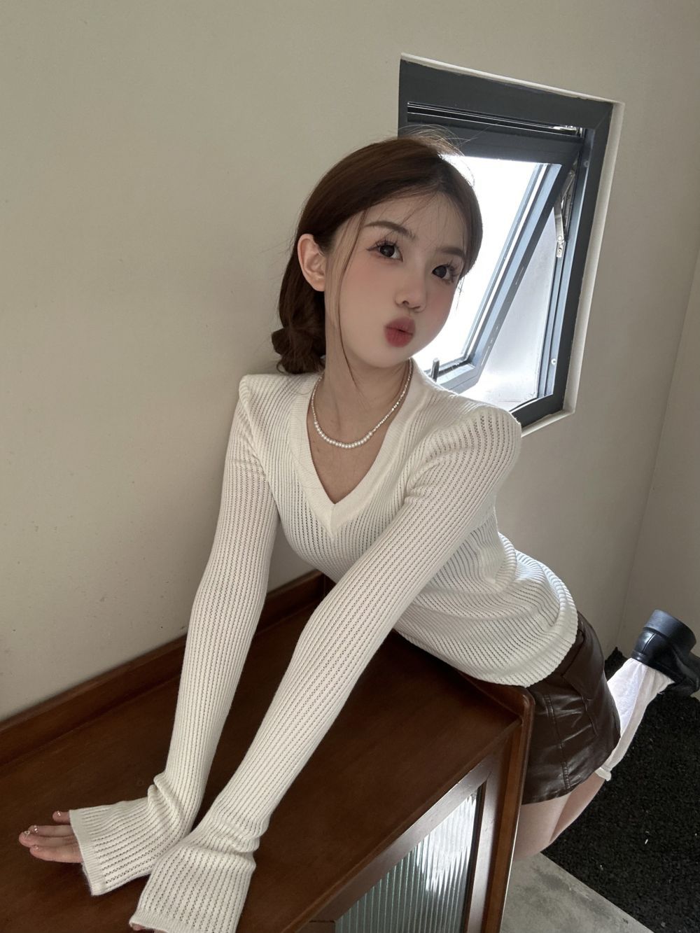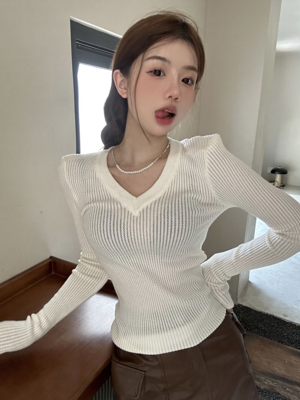 JMA-207 实拍 2023秋季新款韩版设计感背后破洞纯色V领针织衫打底衫上衣女