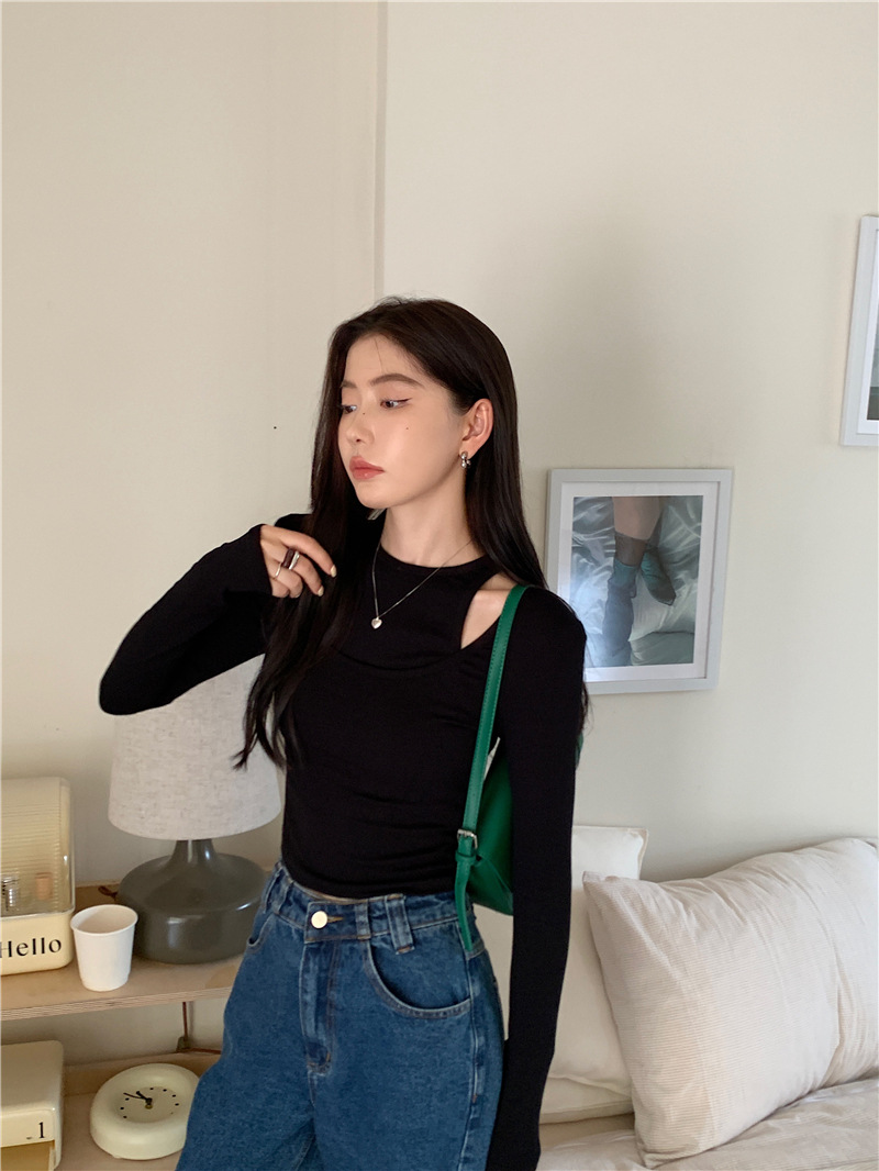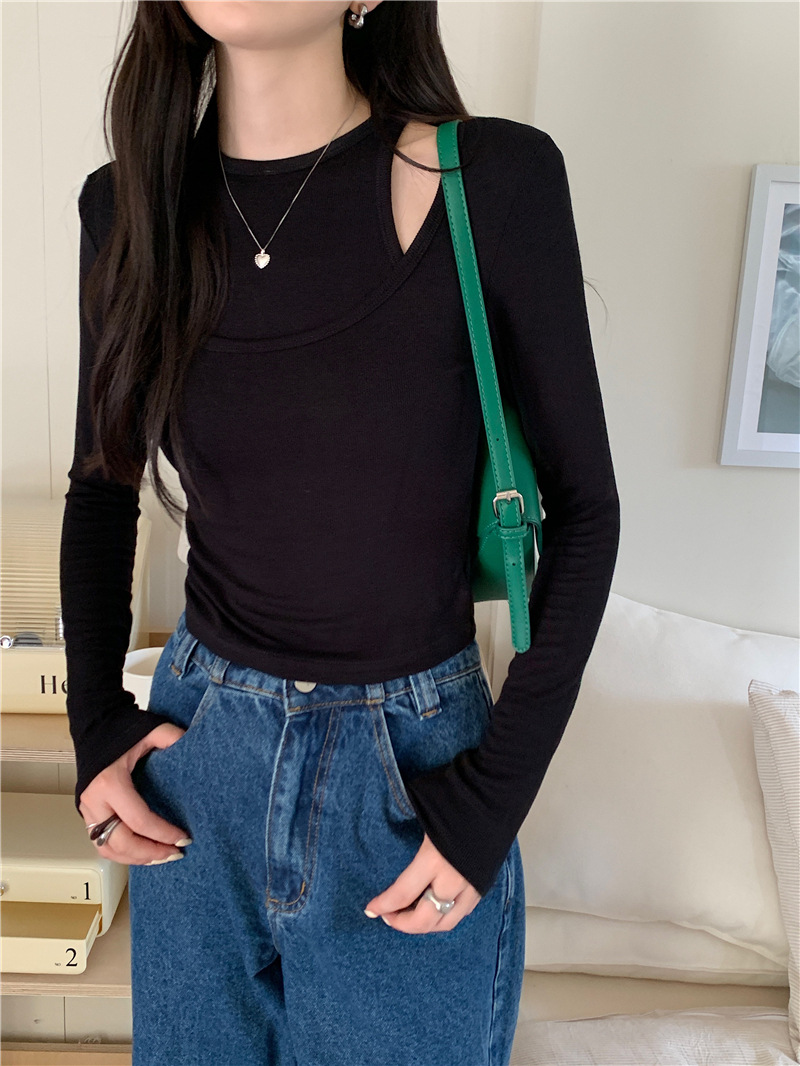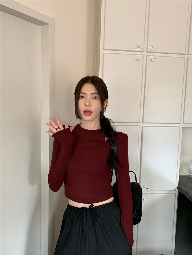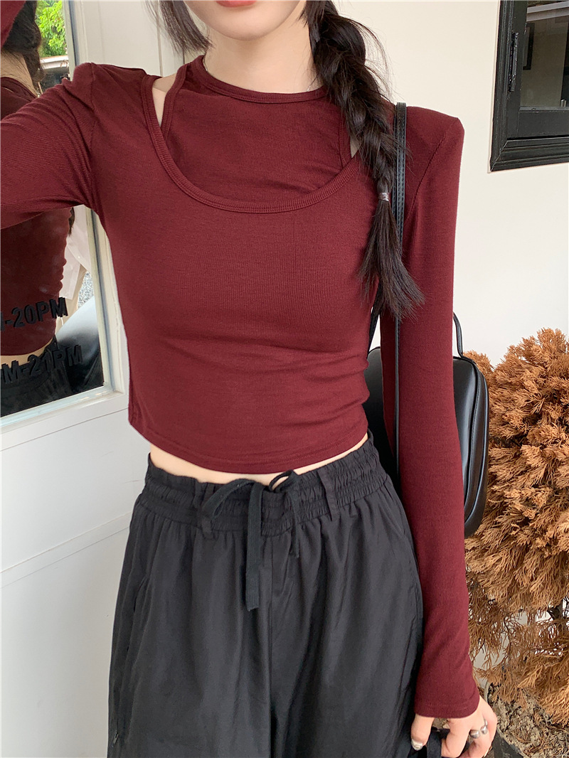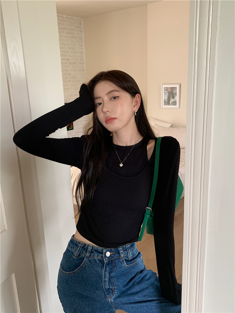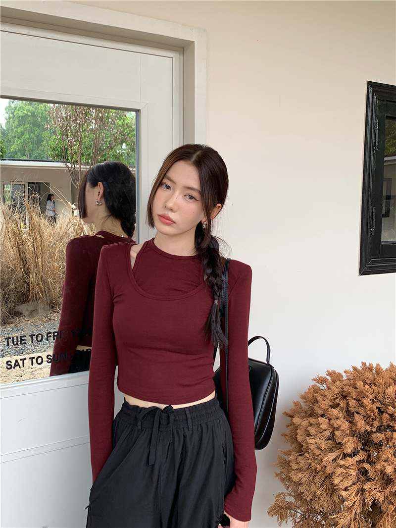 JMA-213 实拍 2023韩国早秋新款设计感修身显瘦假两件短款长袖T恤女上衣潮