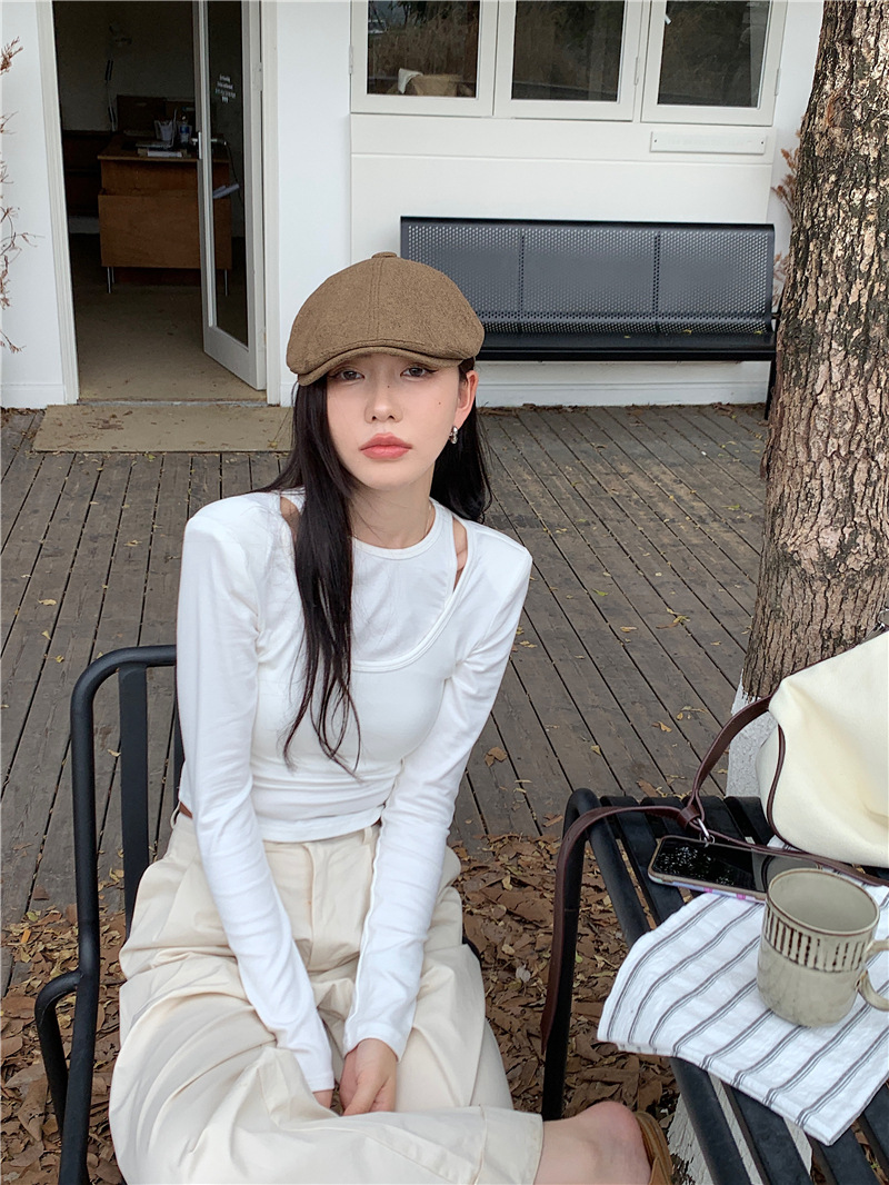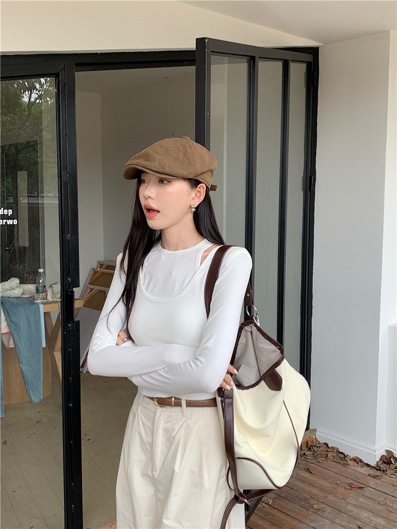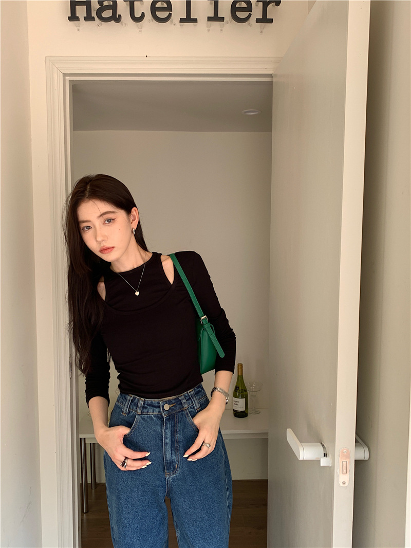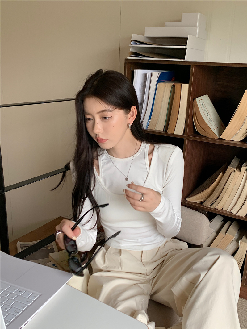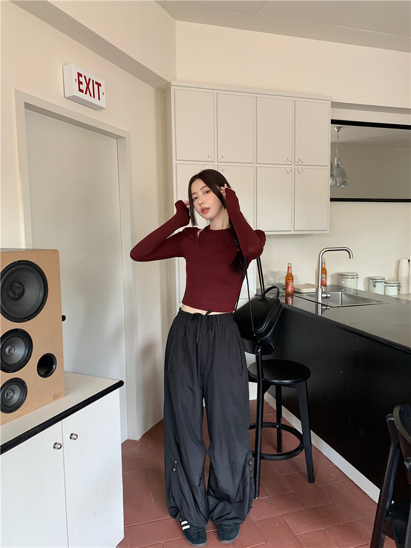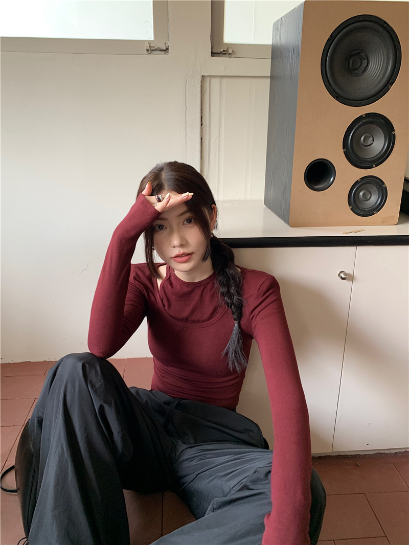 JMA-213 实拍 2023韩国早秋新款设计感修身显瘦假两件短款长袖T恤女上衣潮