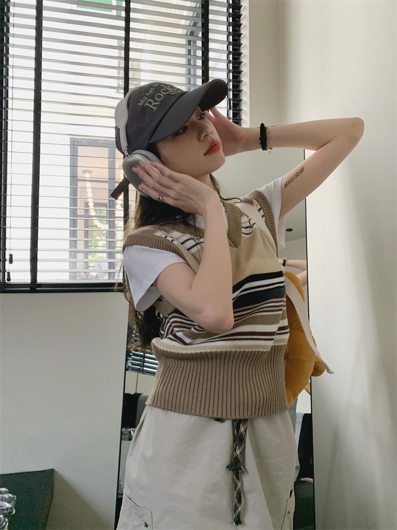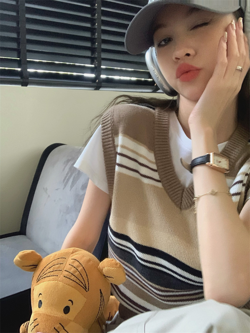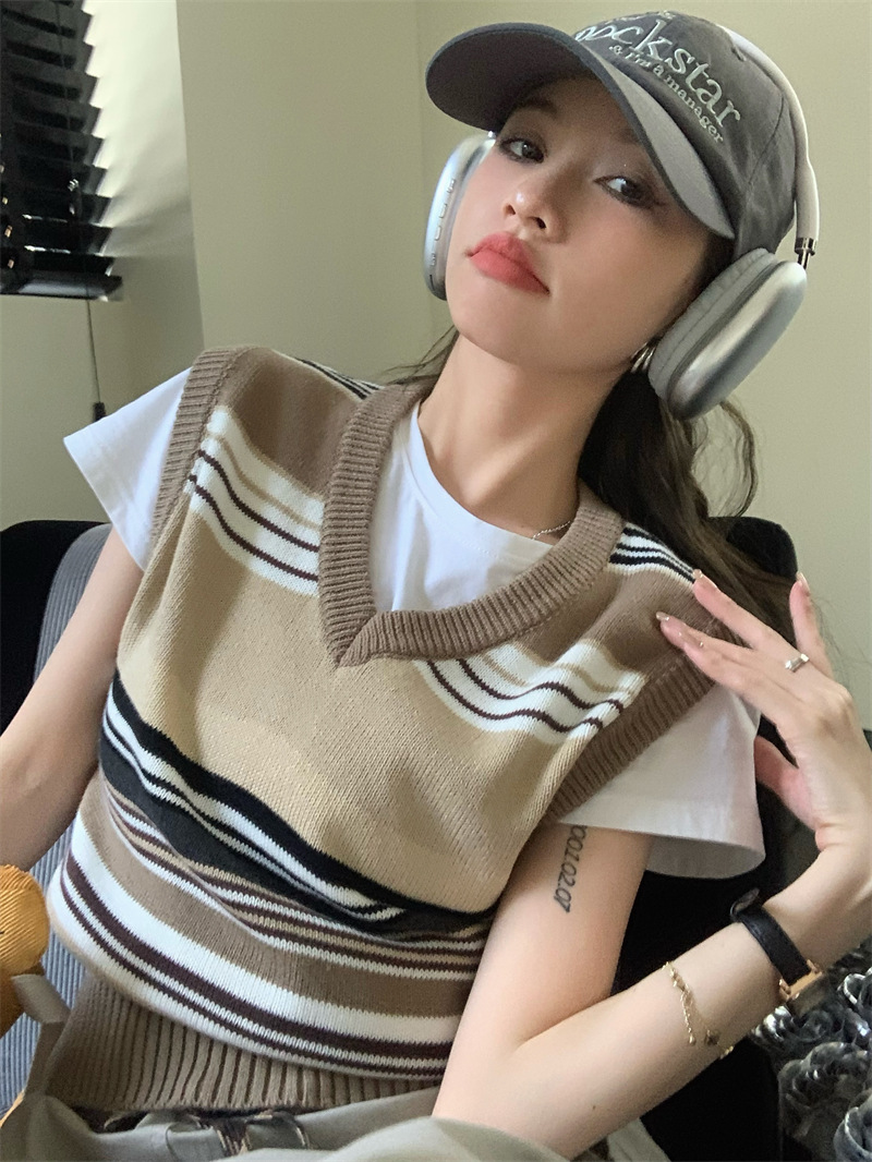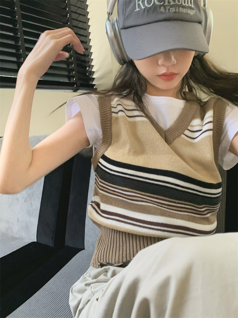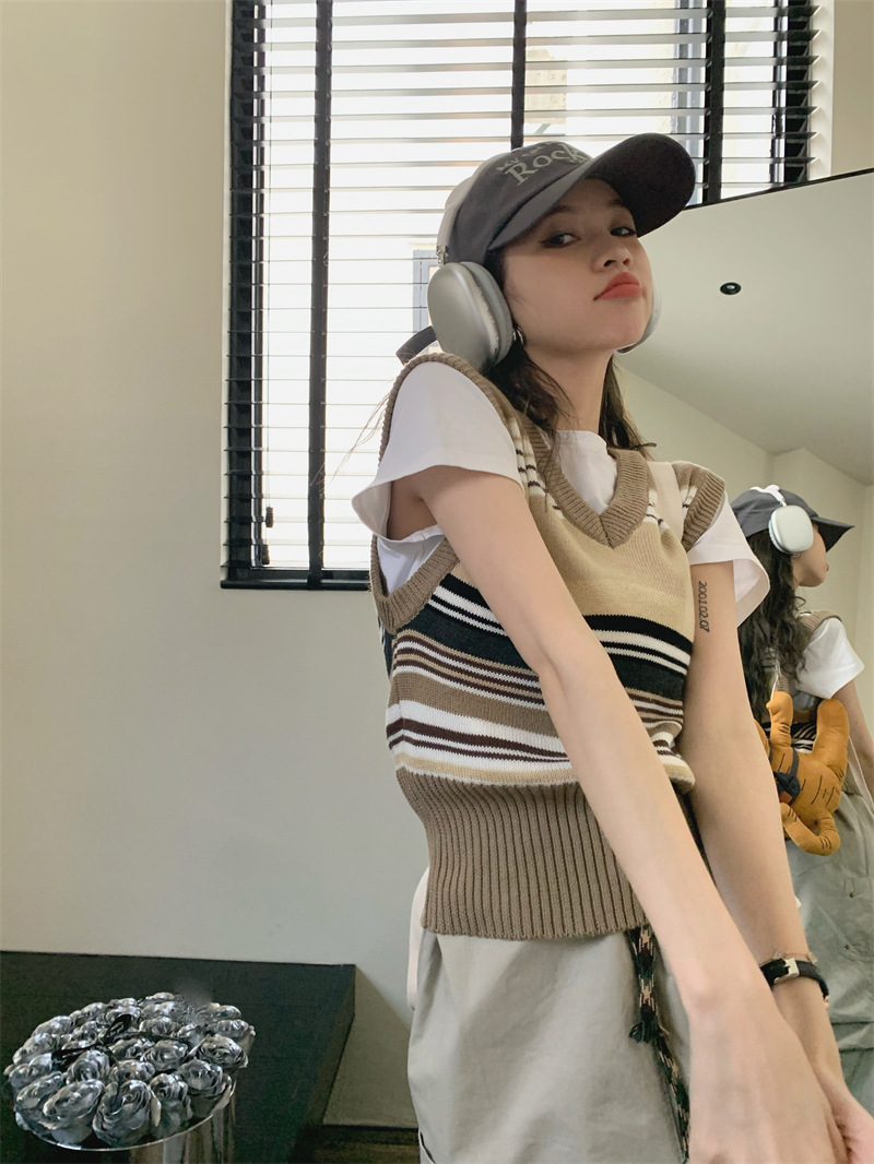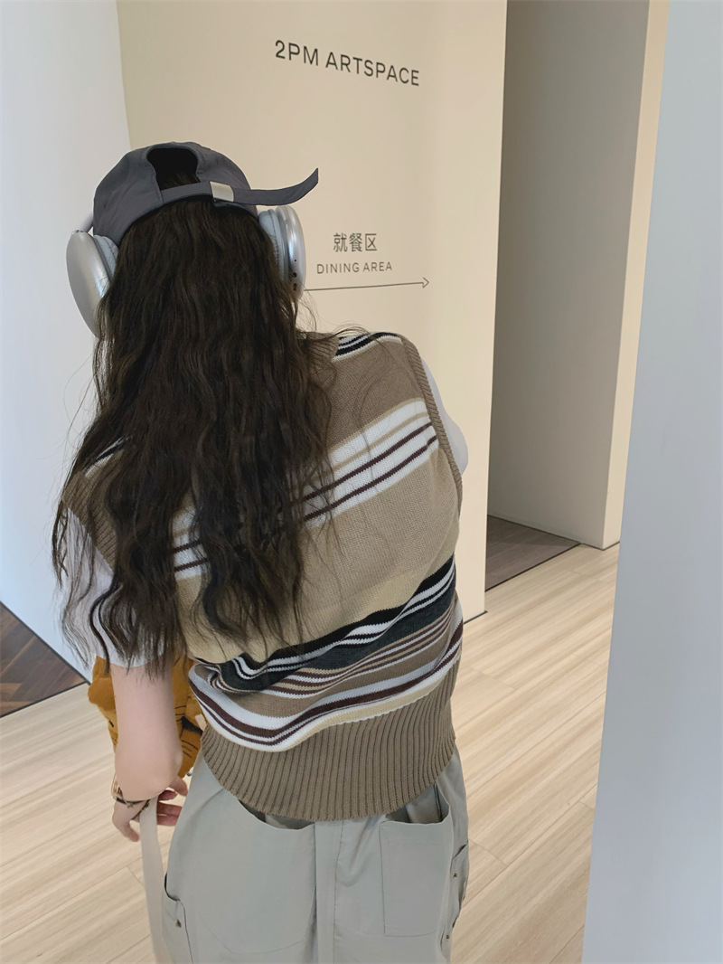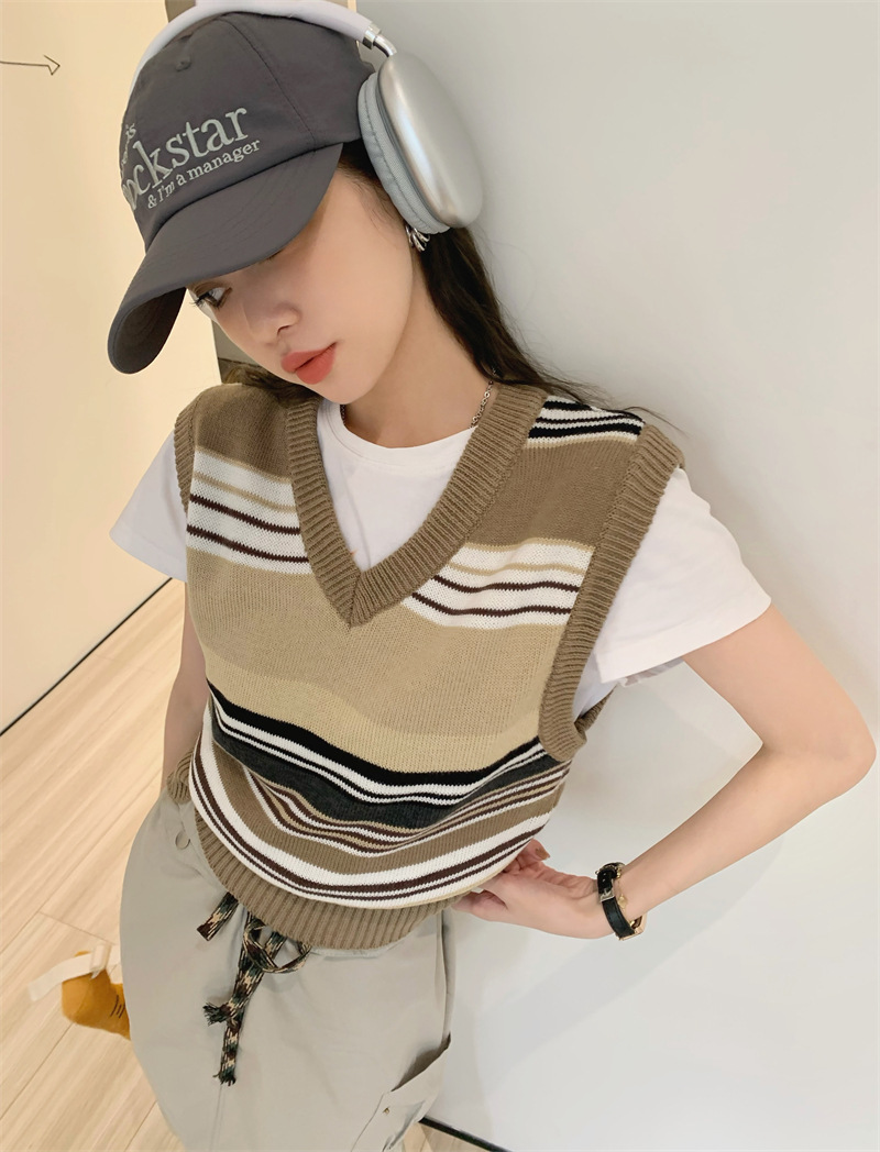 JMA-224 实拍 撞色条纹针织马夹背心女2023秋季修身显瘦V领叠穿马甲上衣潮