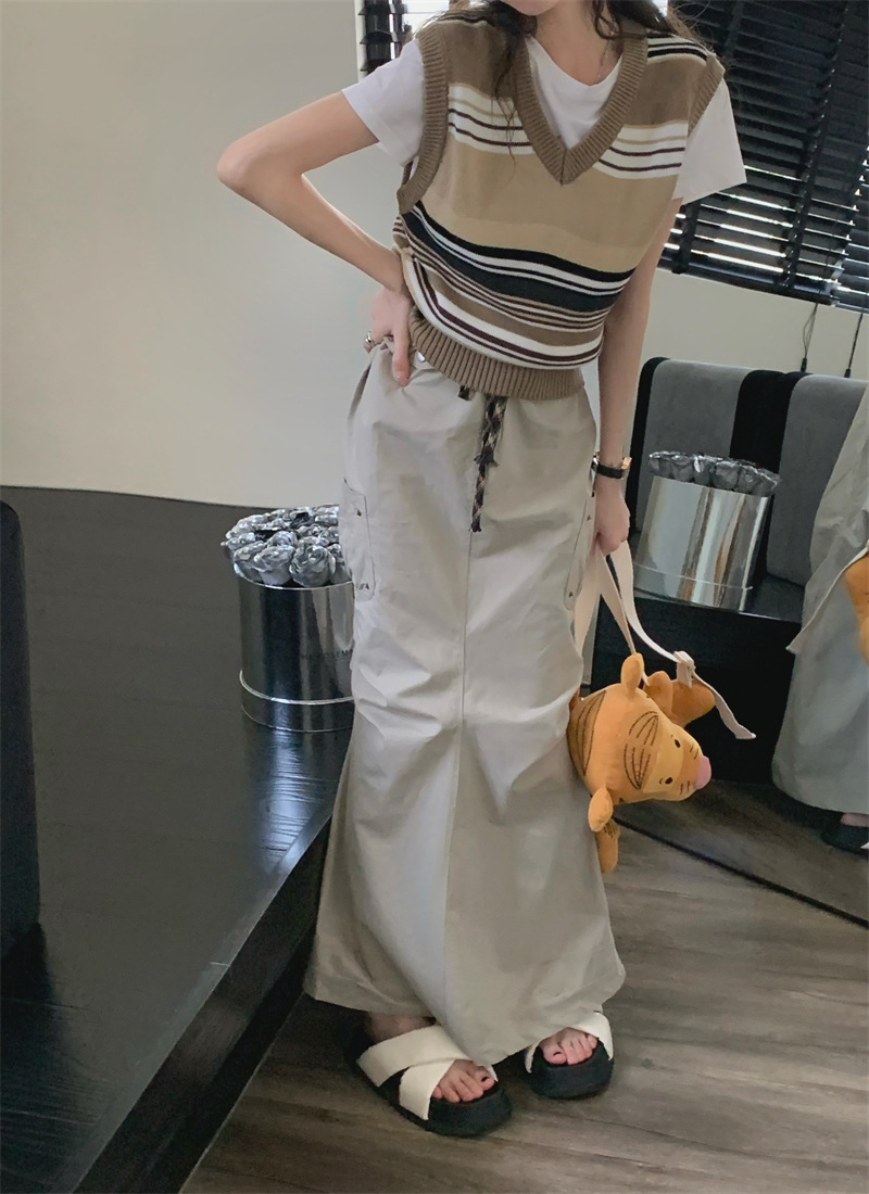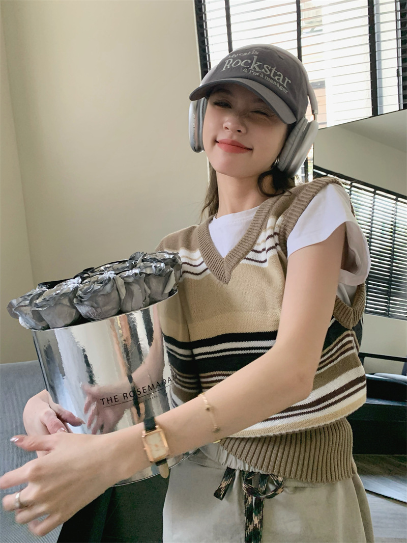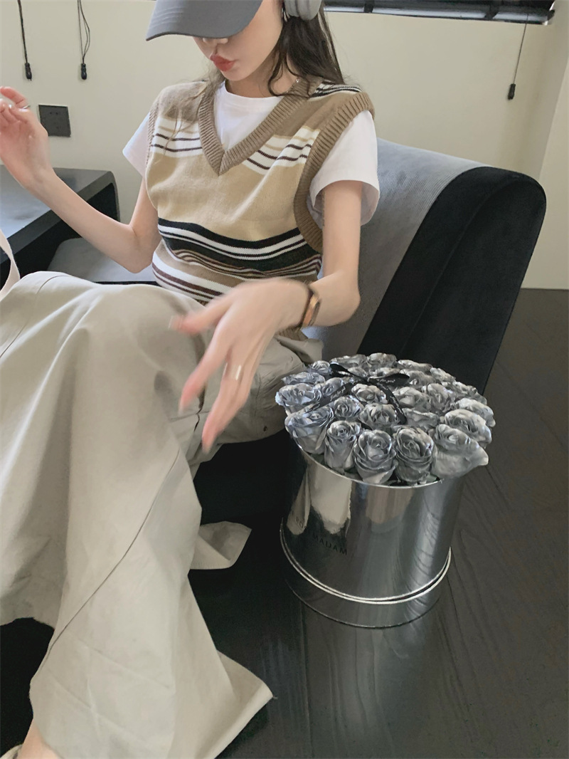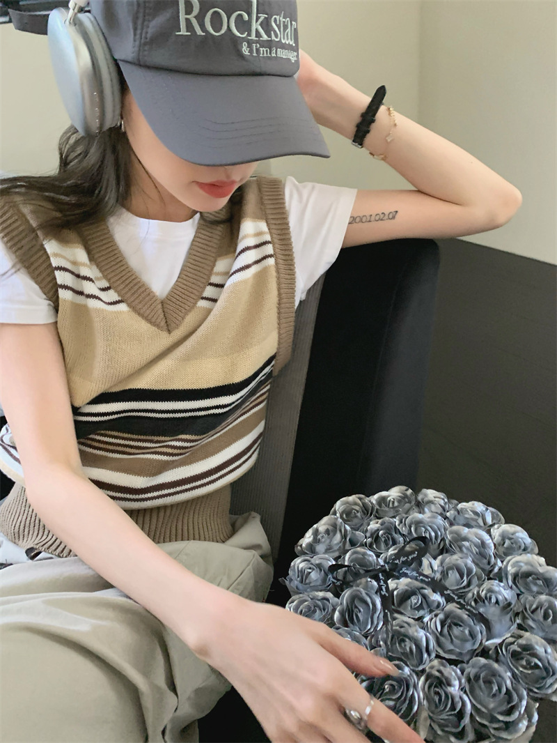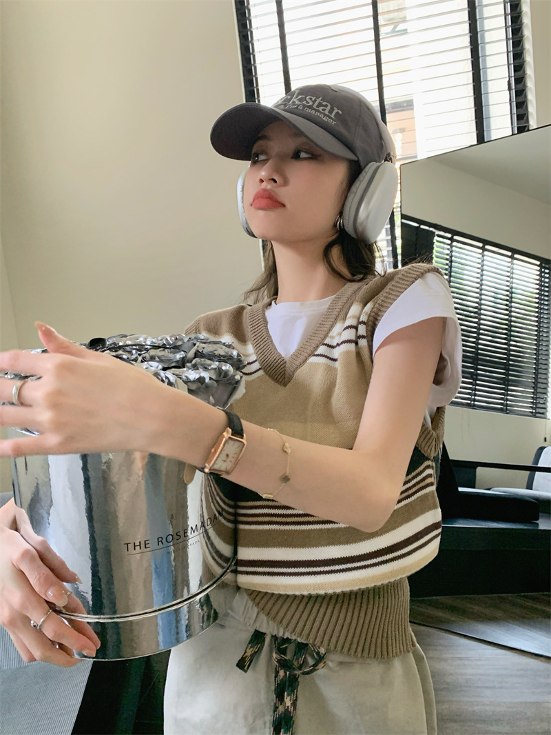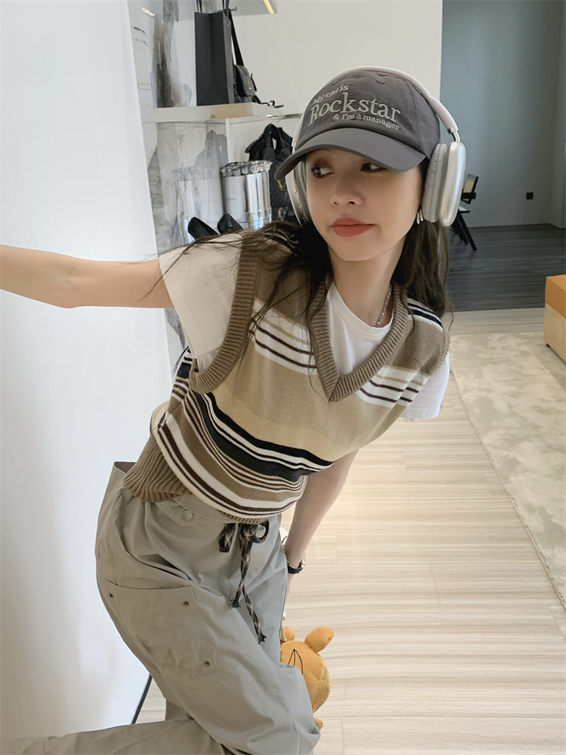 JMA-224 实拍 撞色条纹针织马夹背心女2023秋季修身显瘦V领叠穿马甲上衣潮