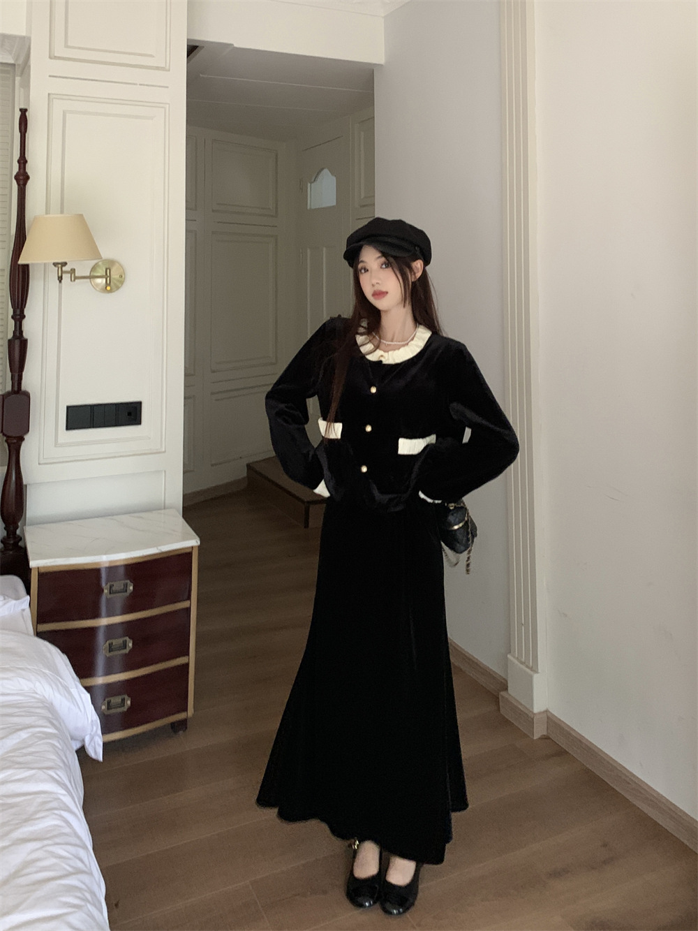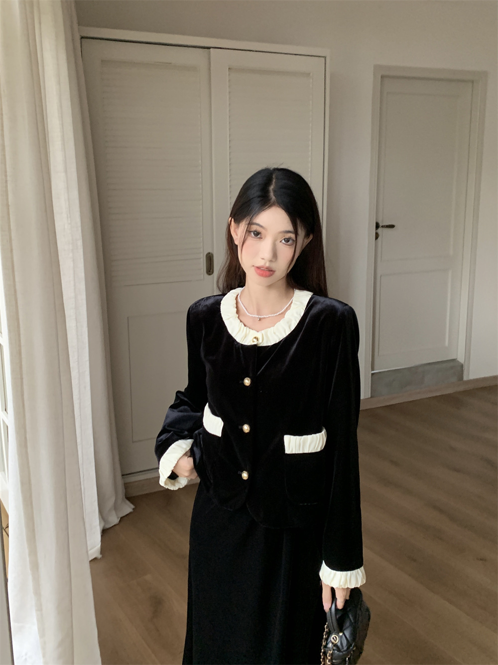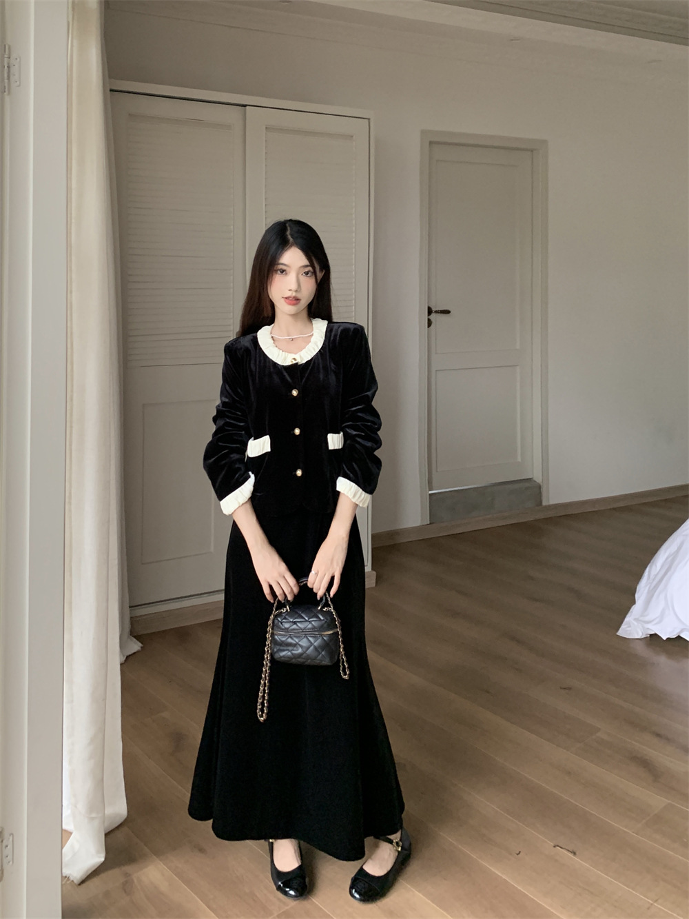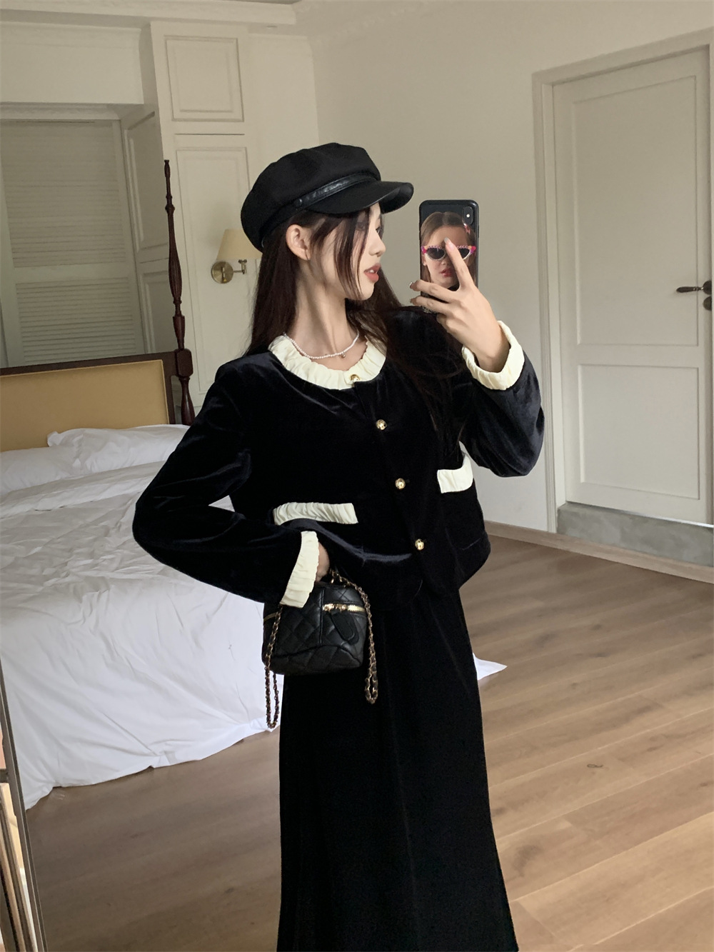 JMA-225 实拍 秋冬季法式撞色圆领小香风丝绒短款长袖外套+高腰长款半身裙