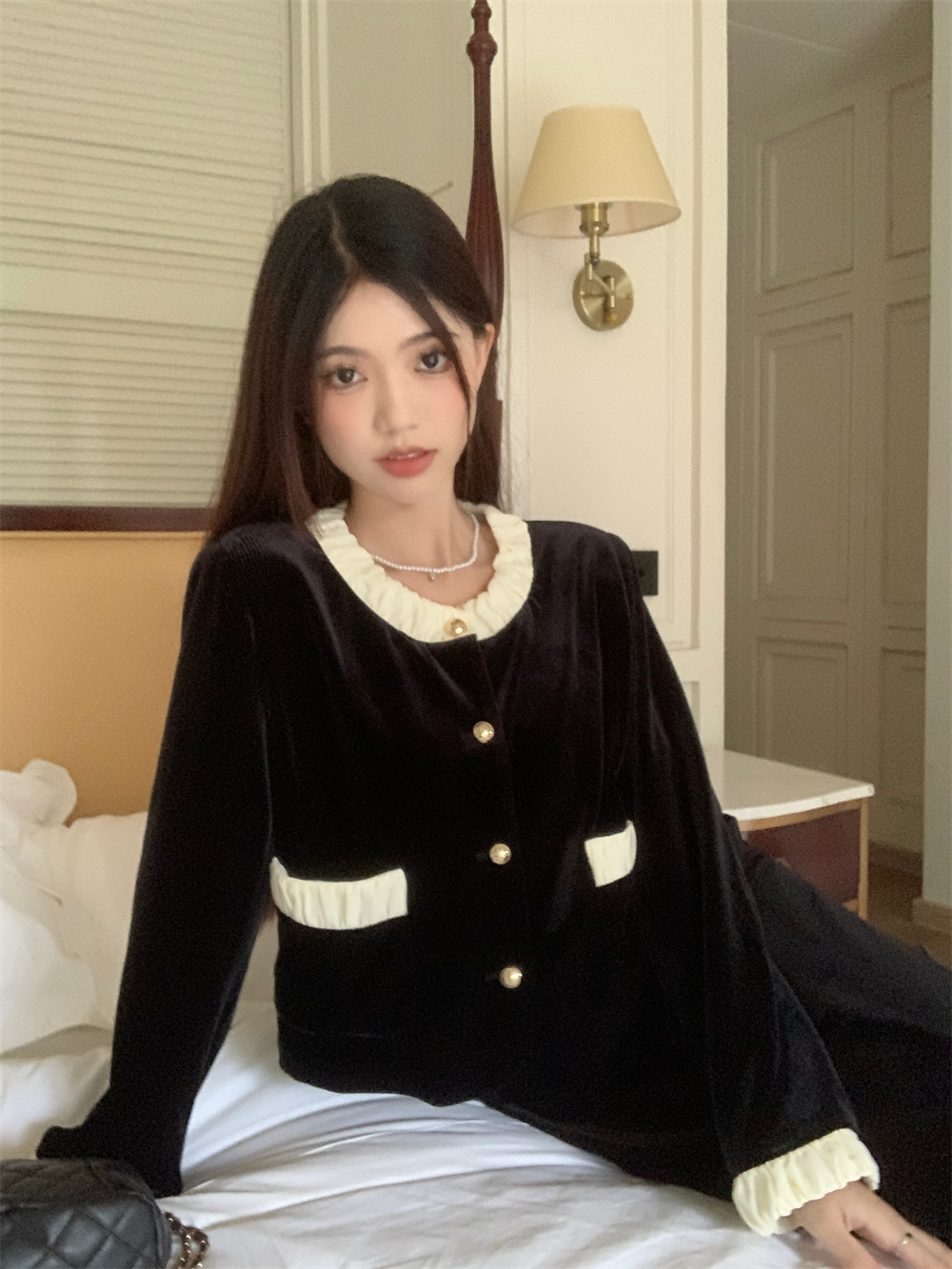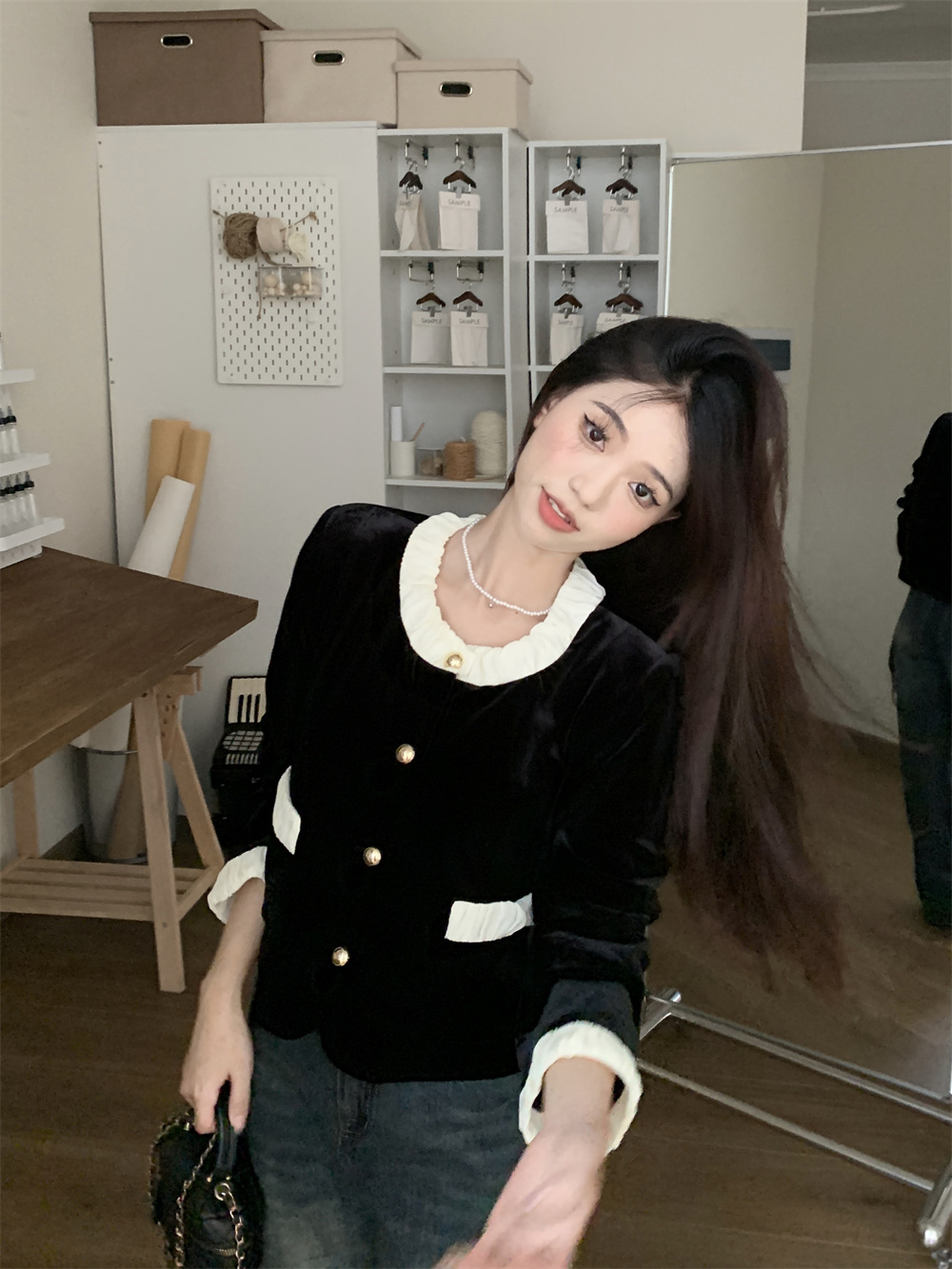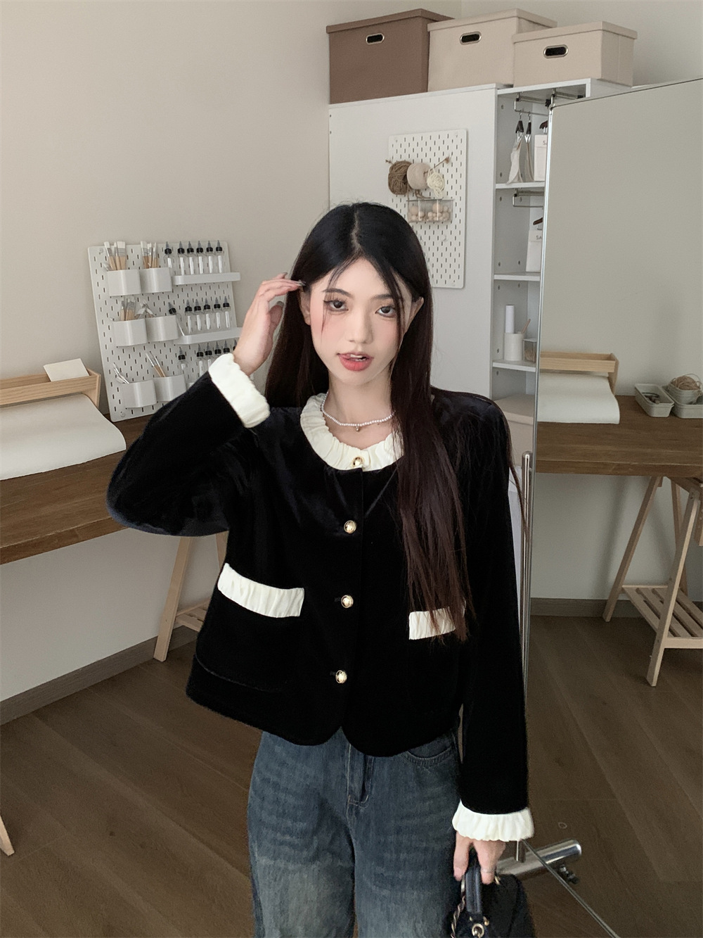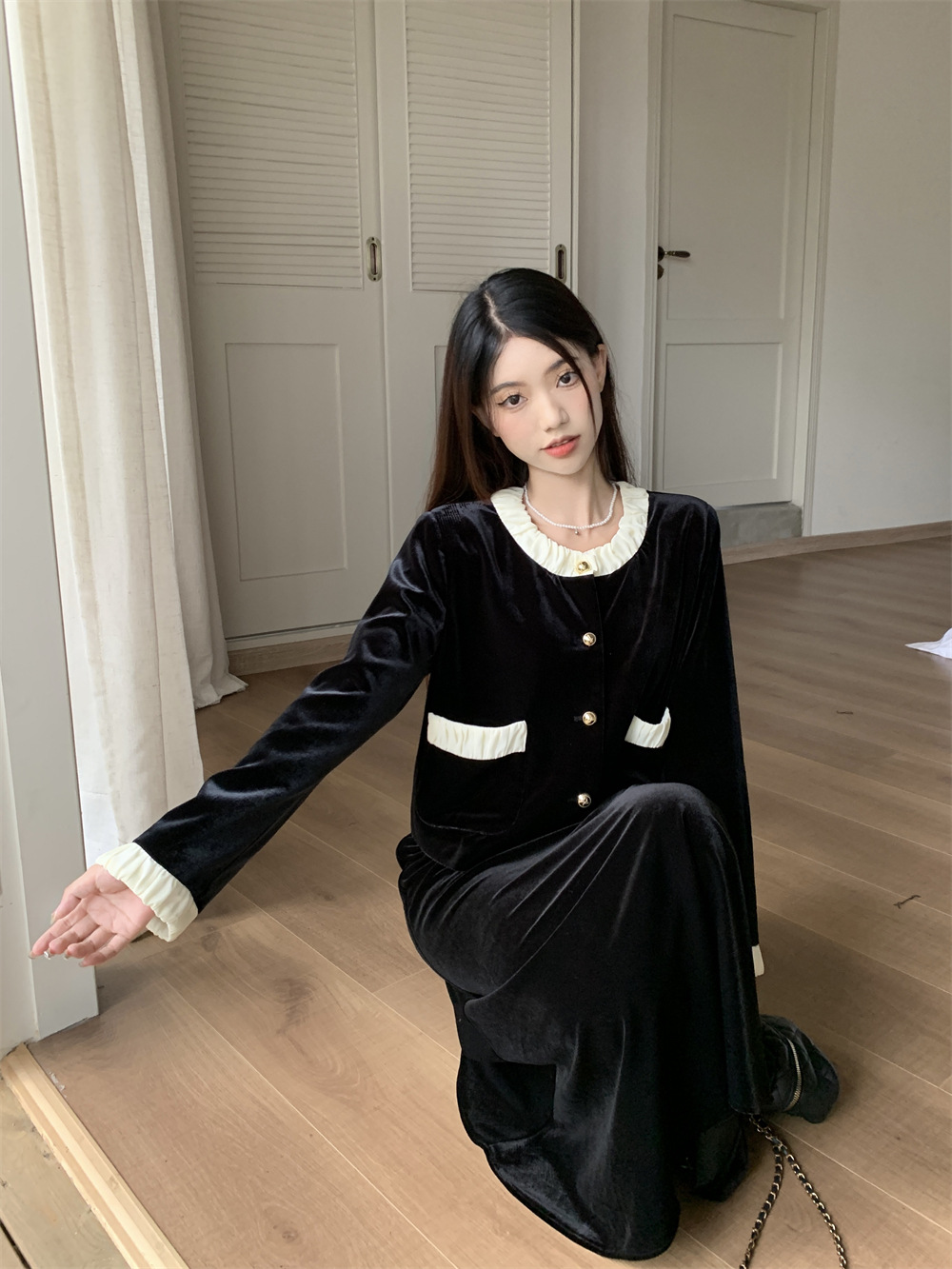 JMA-225 实拍 秋冬季法式撞色圆领小香风丝绒短款长袖外套+高腰长款半身裙