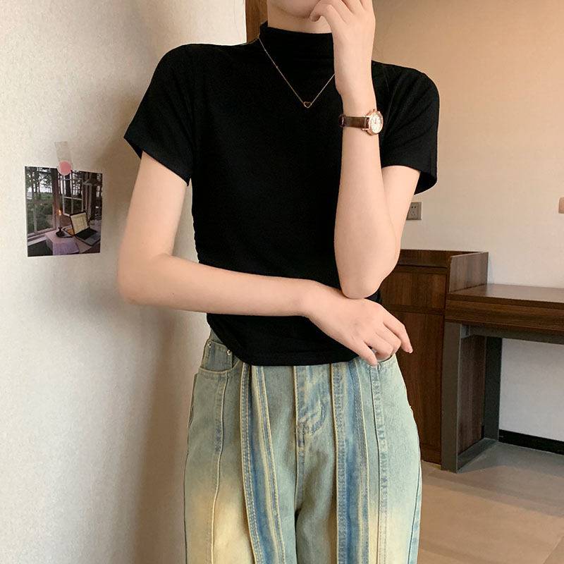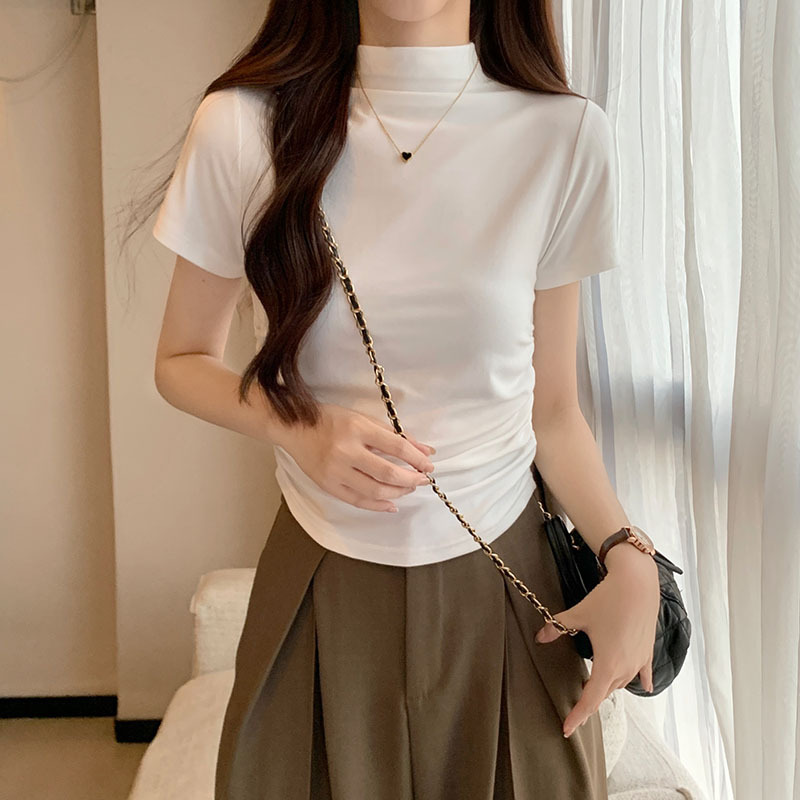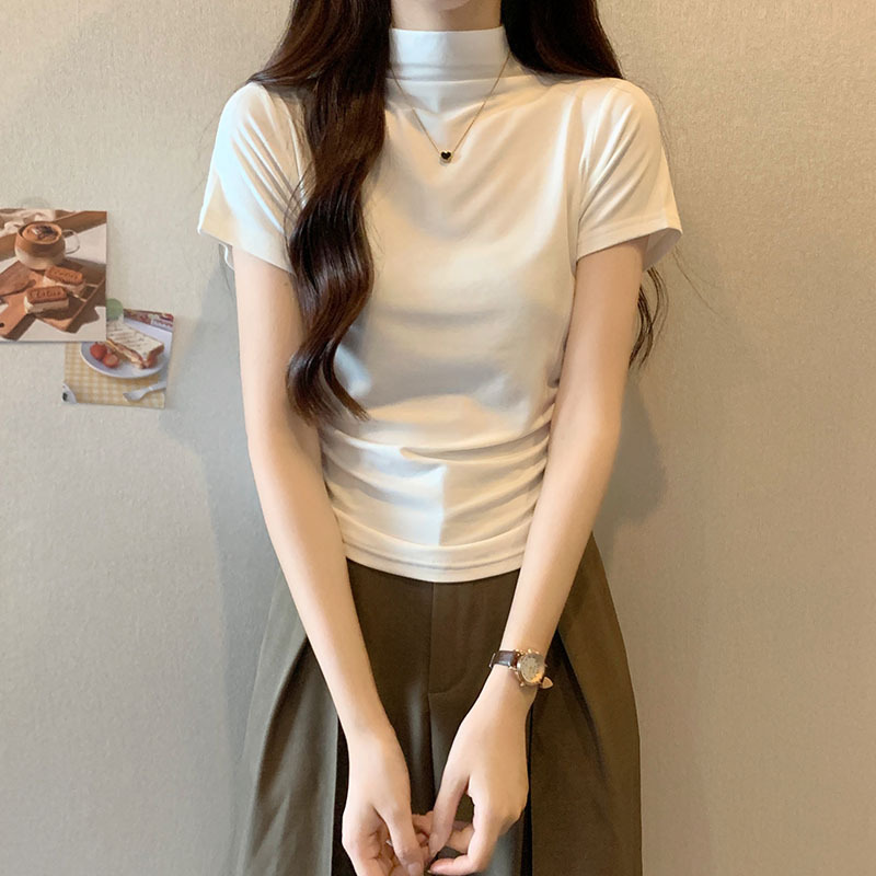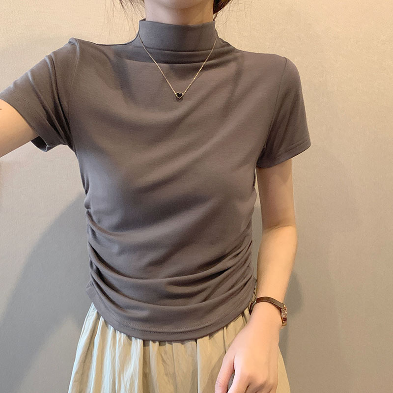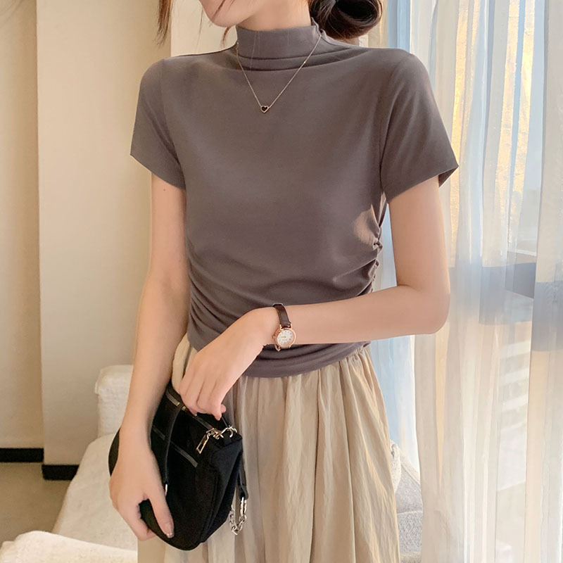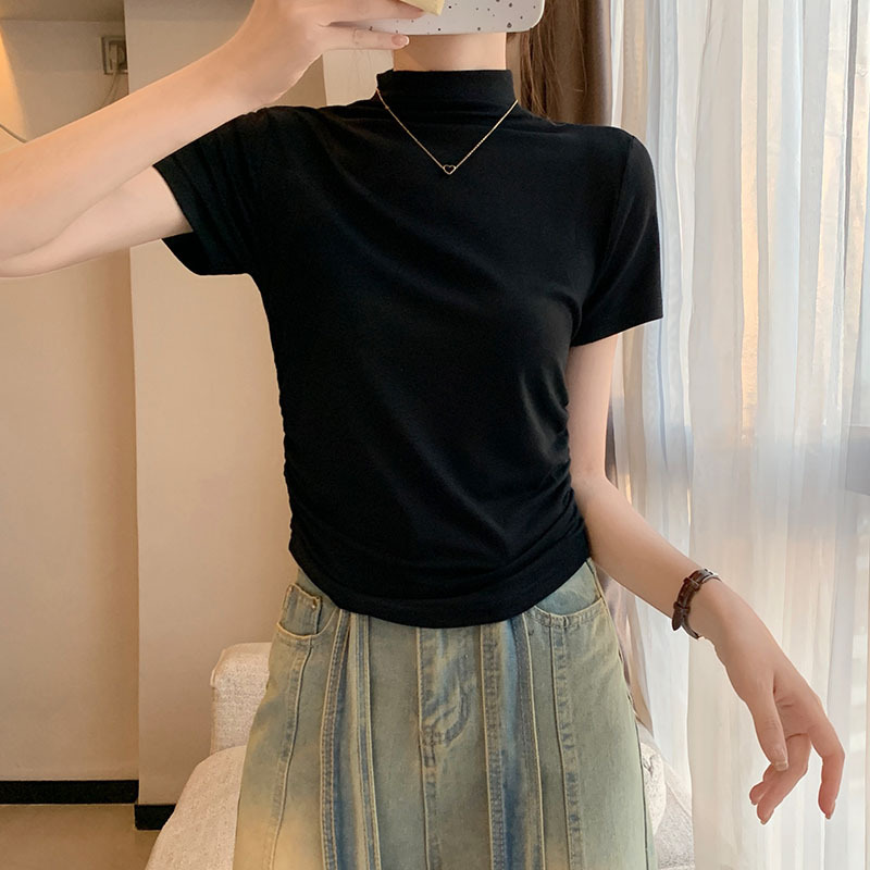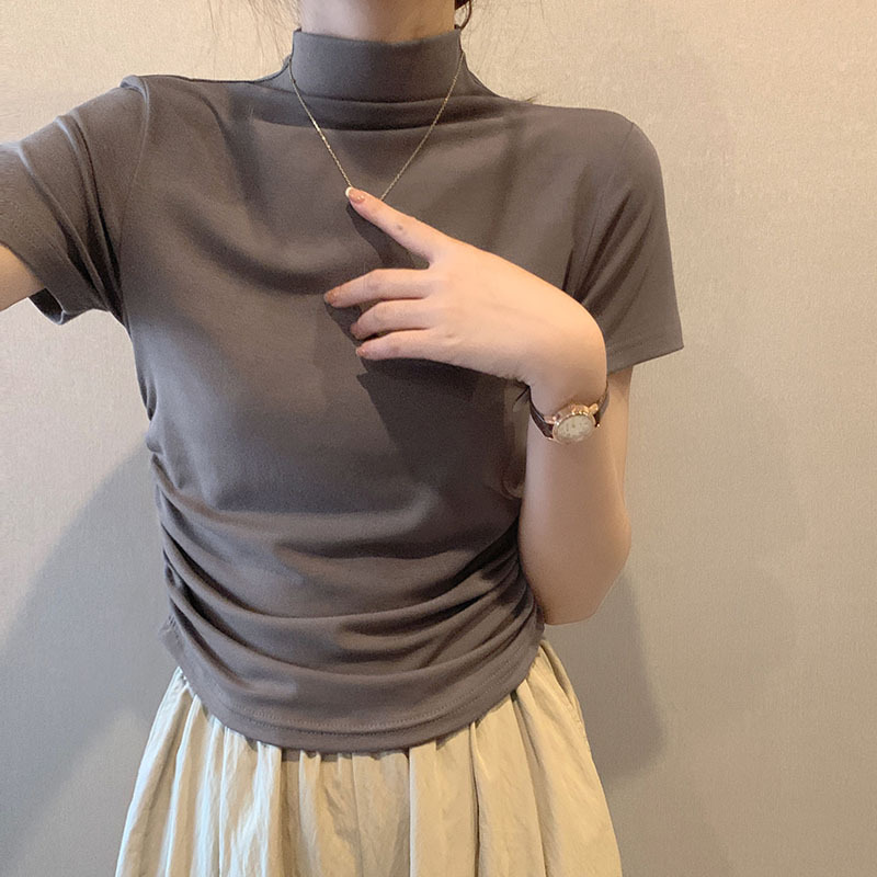 JMA-228 实拍 半高领正肩短袖t恤女2023初秋季设计感抽褶收腰紧身打底上衣