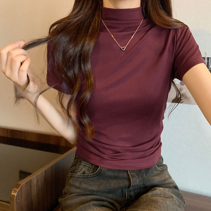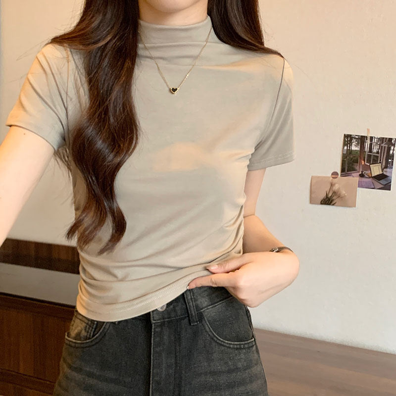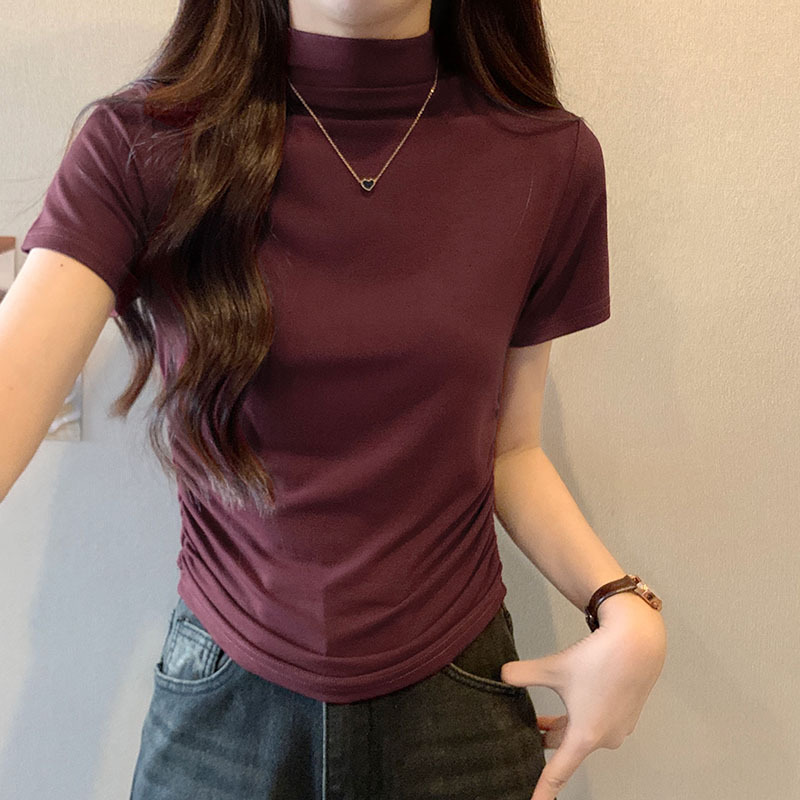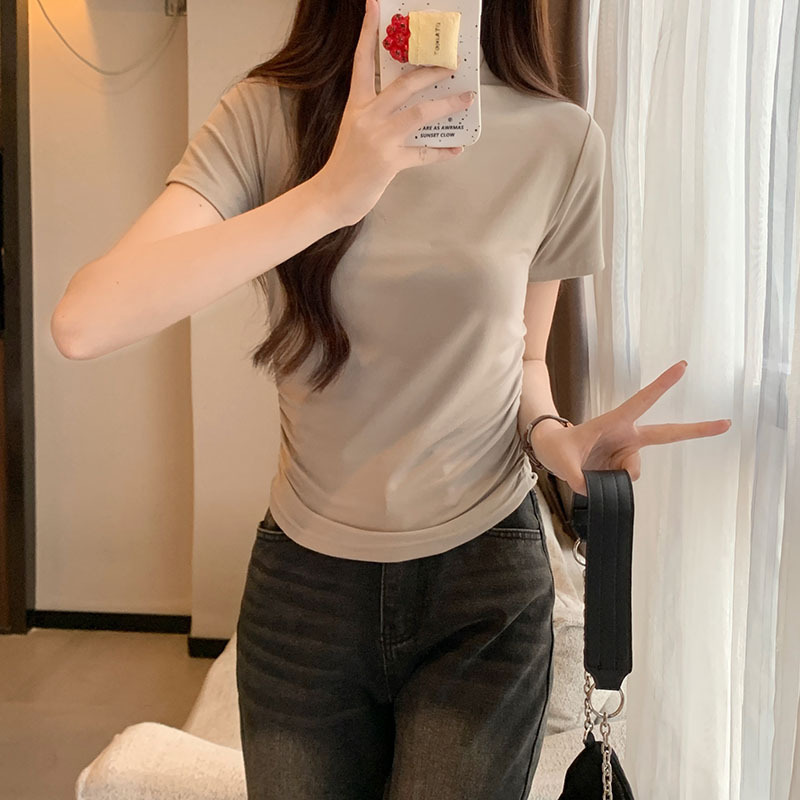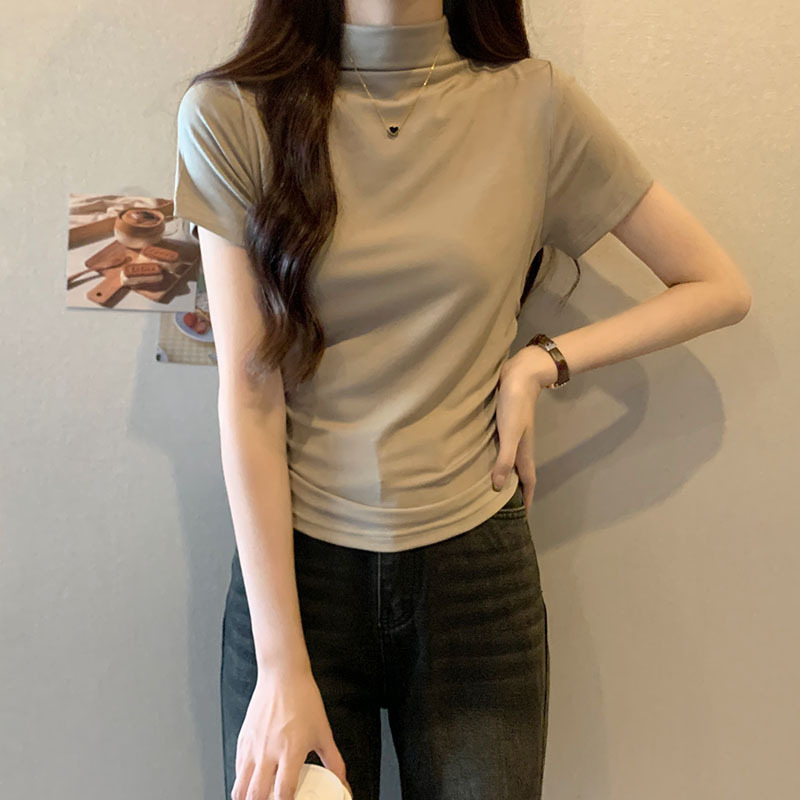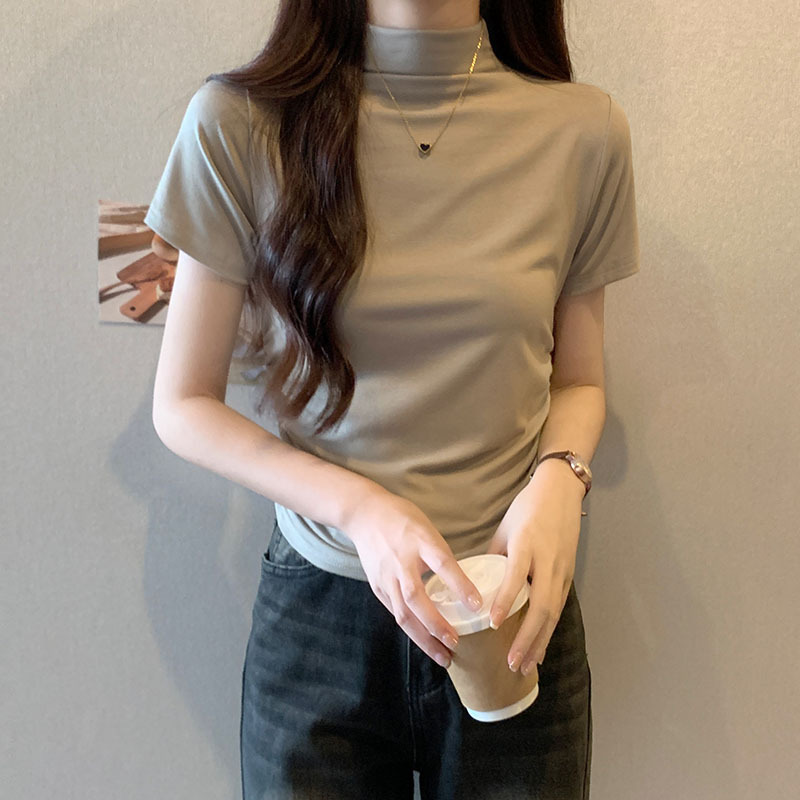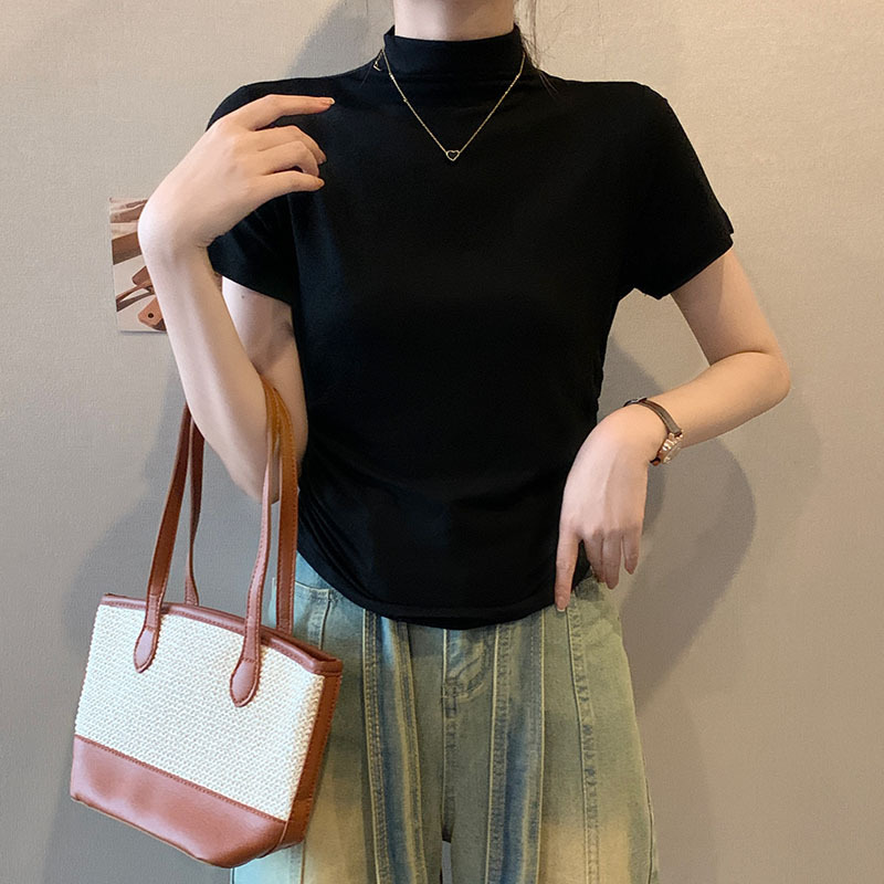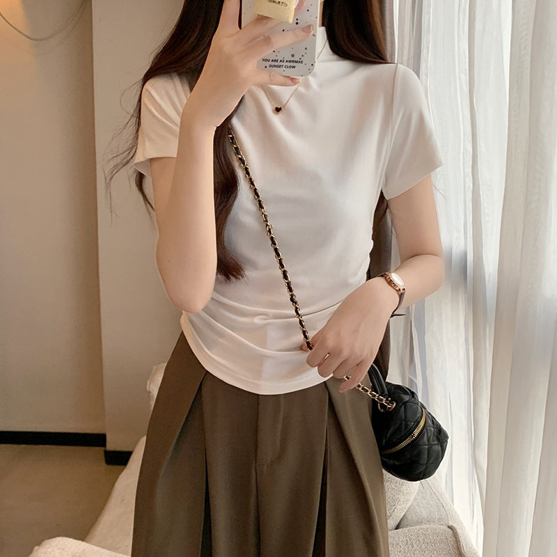 JMA-228 实拍 半高领正肩短袖t恤女2023初秋季设计感抽褶收腰紧身打底上衣