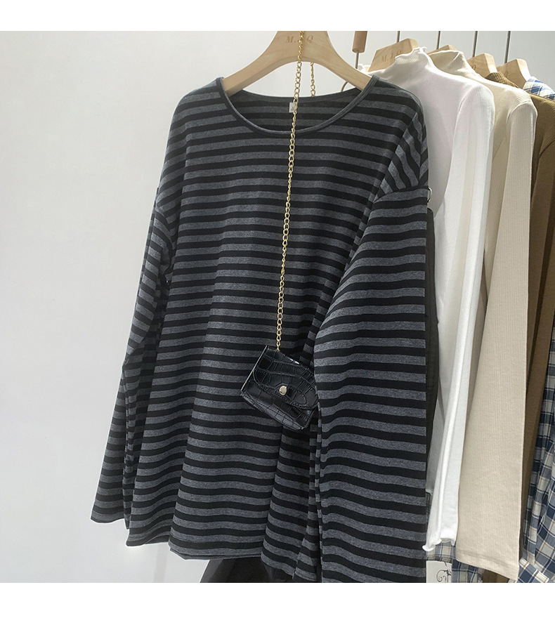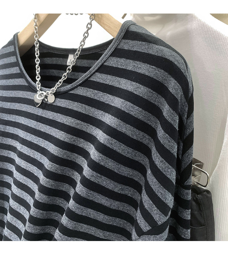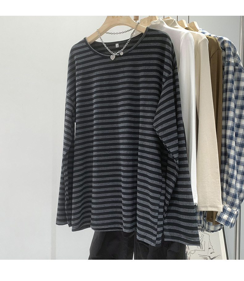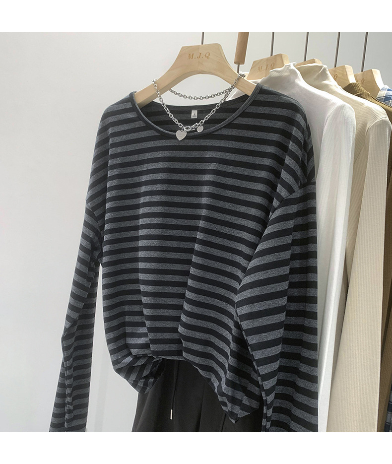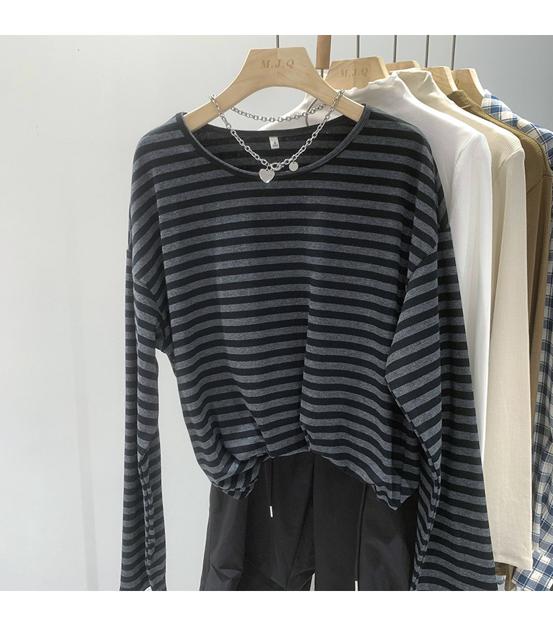 JMA-232 实拍 韩版休闲条纹慵懒风长袖T恤2023秋季新款韩版设计感小众上衣