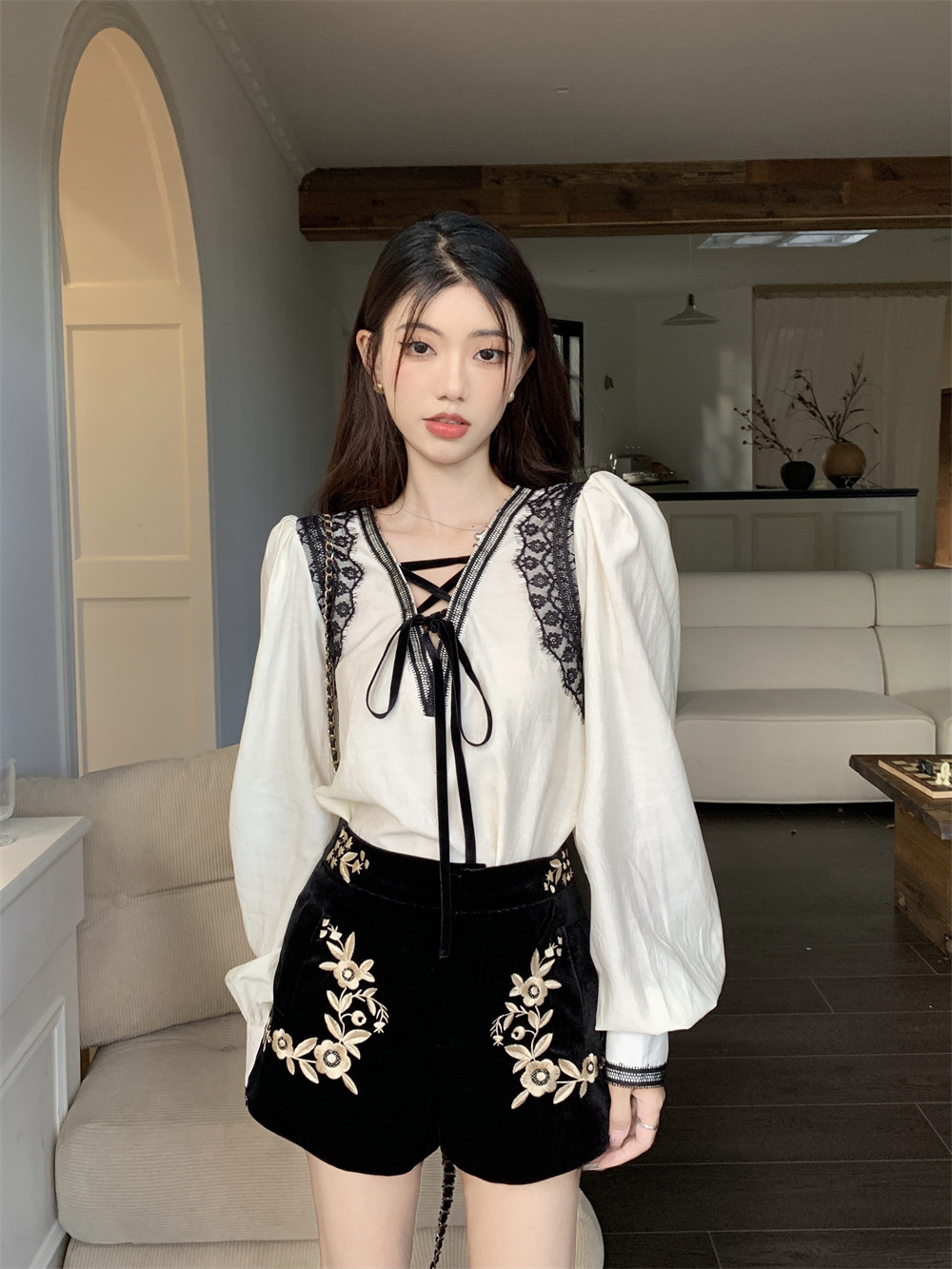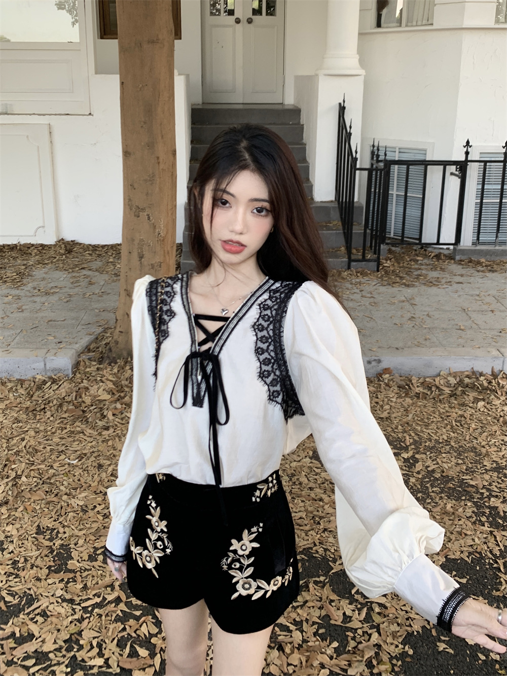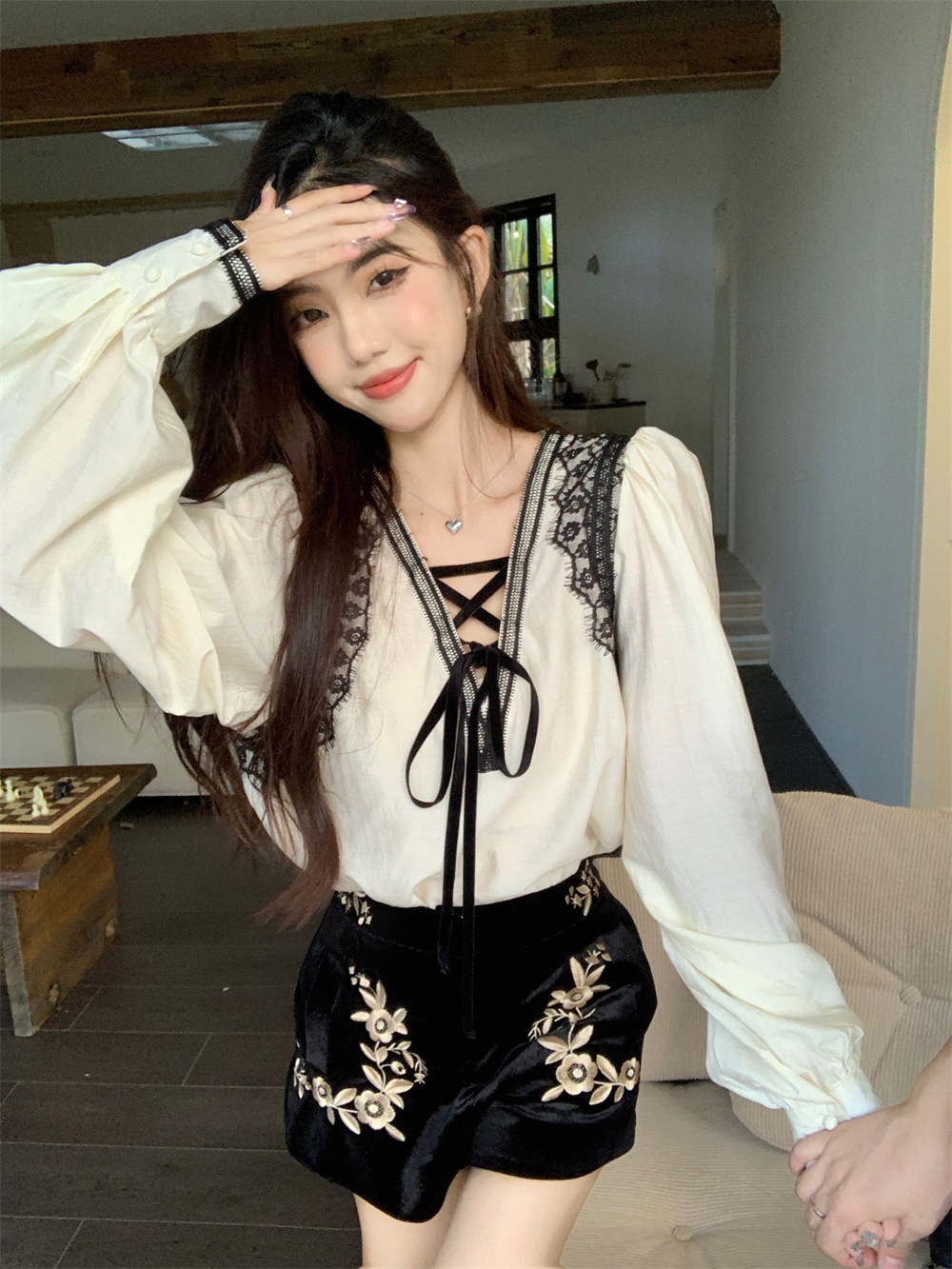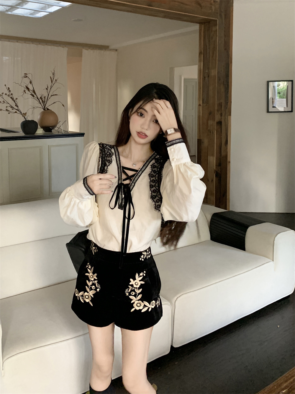 JMA-241 实拍 秋季法式V领绑带蕾丝拼接宽松长袖衬衫女+高腰刺绣丝绒短裤