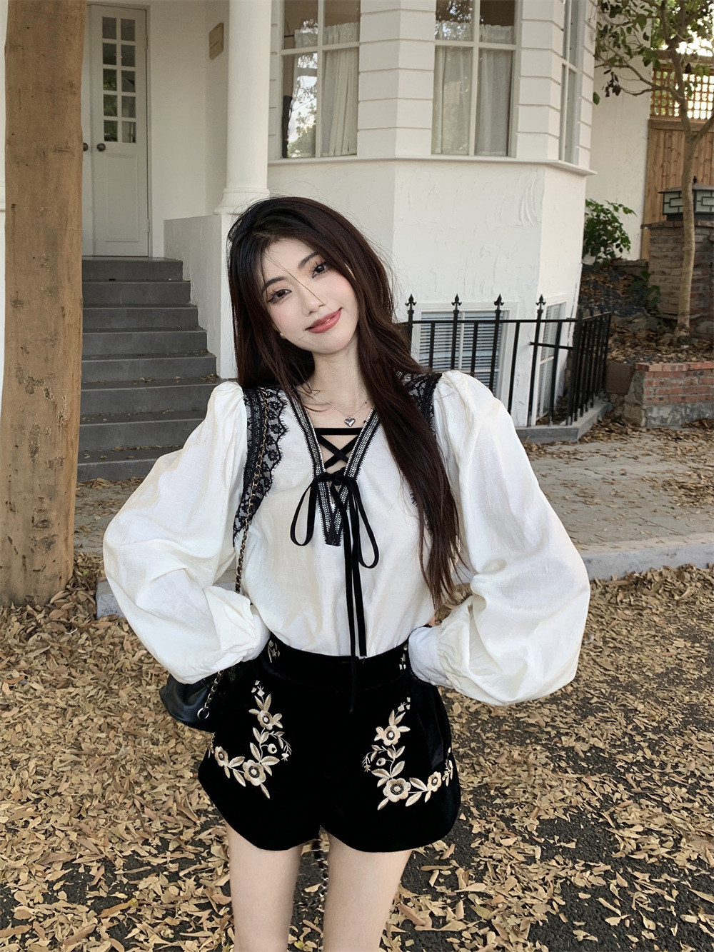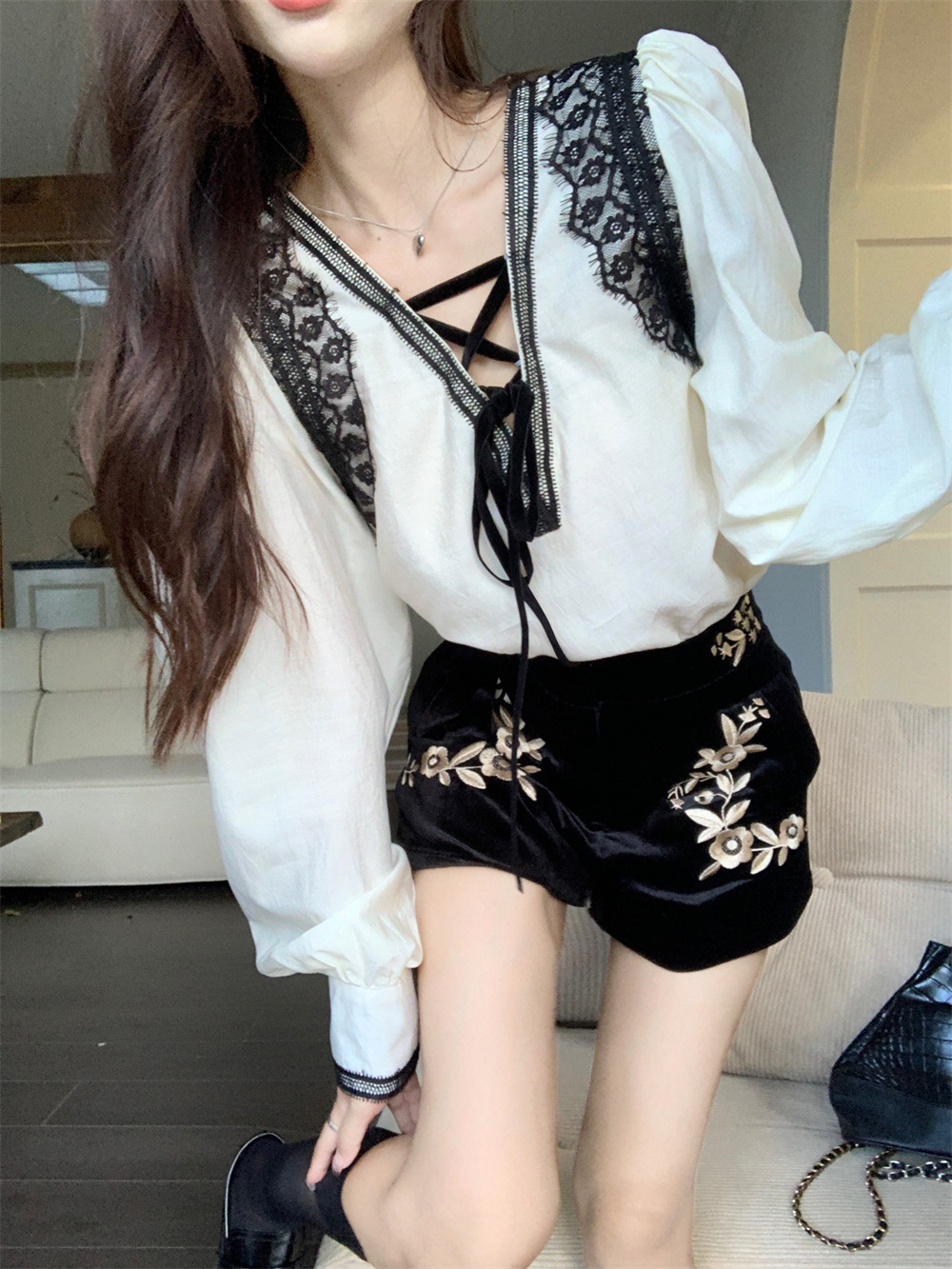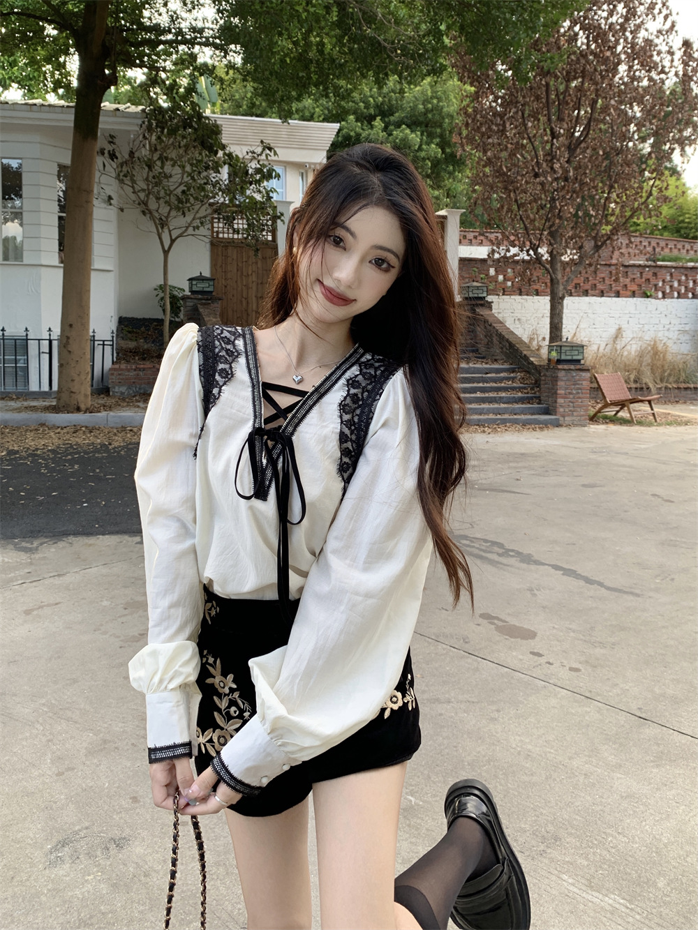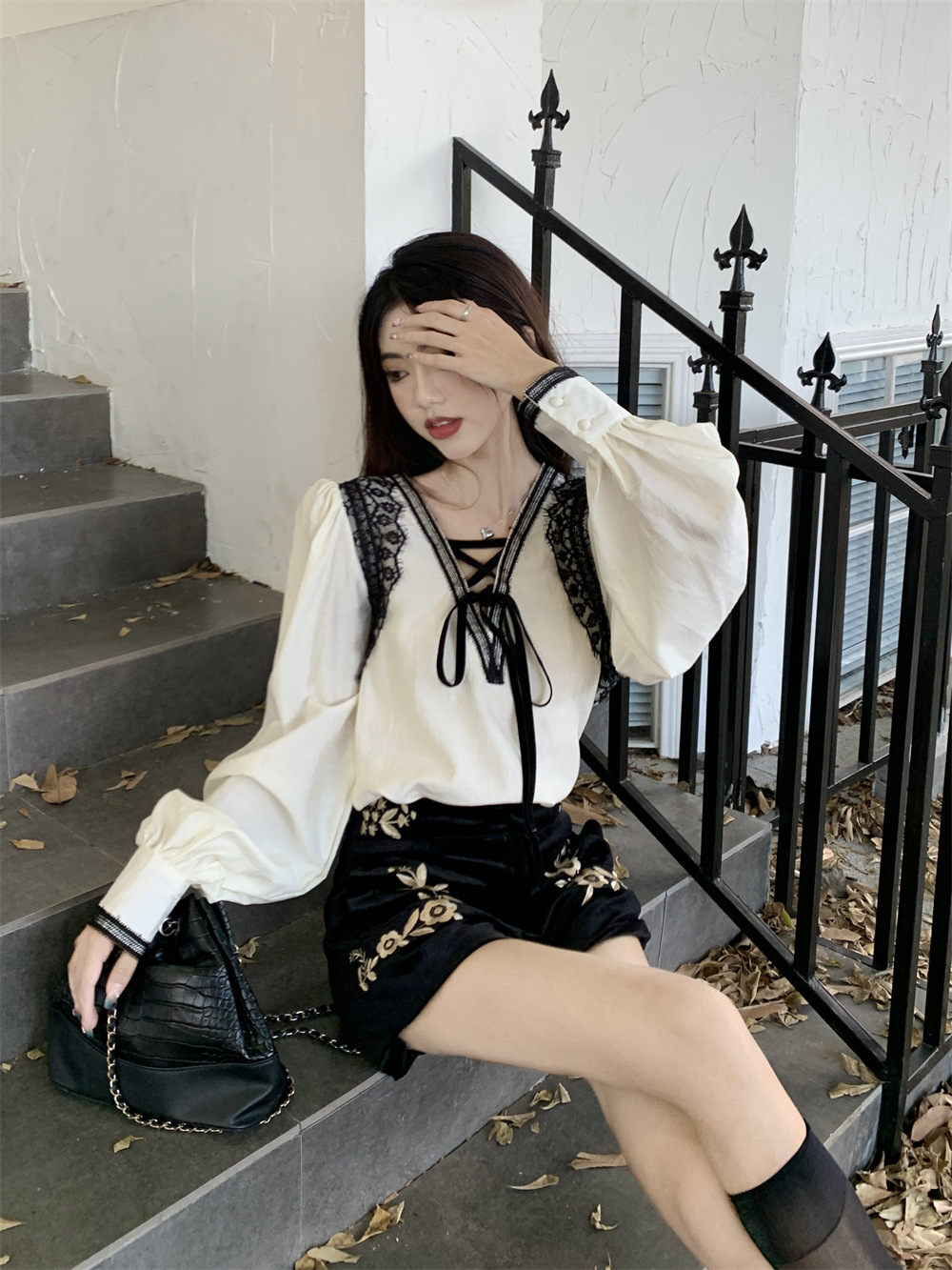 JMA-241 实拍 秋季法式V领绑带蕾丝拼接宽松长袖衬衫女+高腰刺绣丝绒短裤