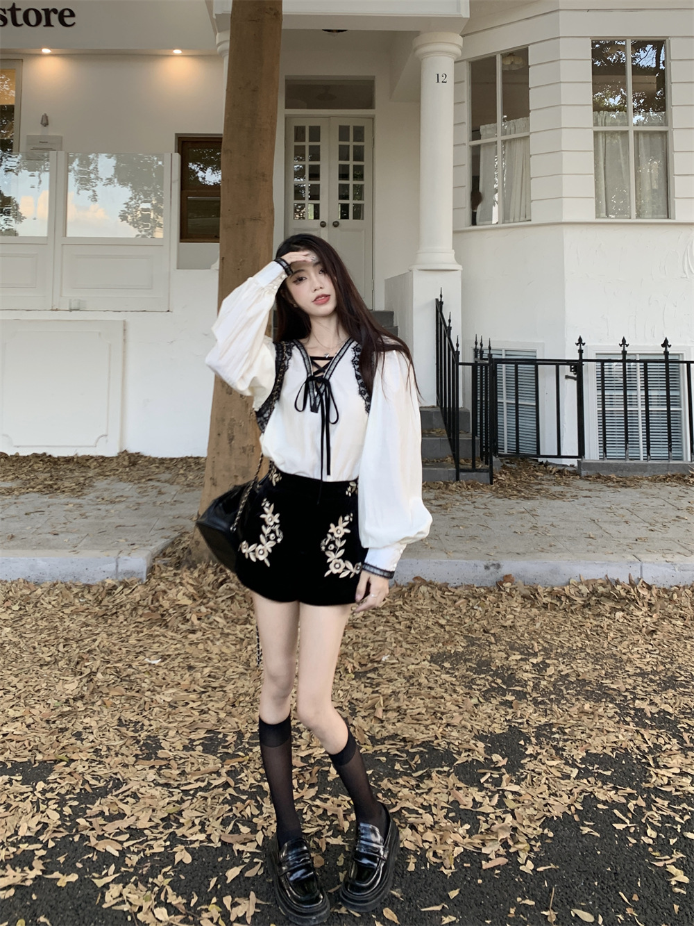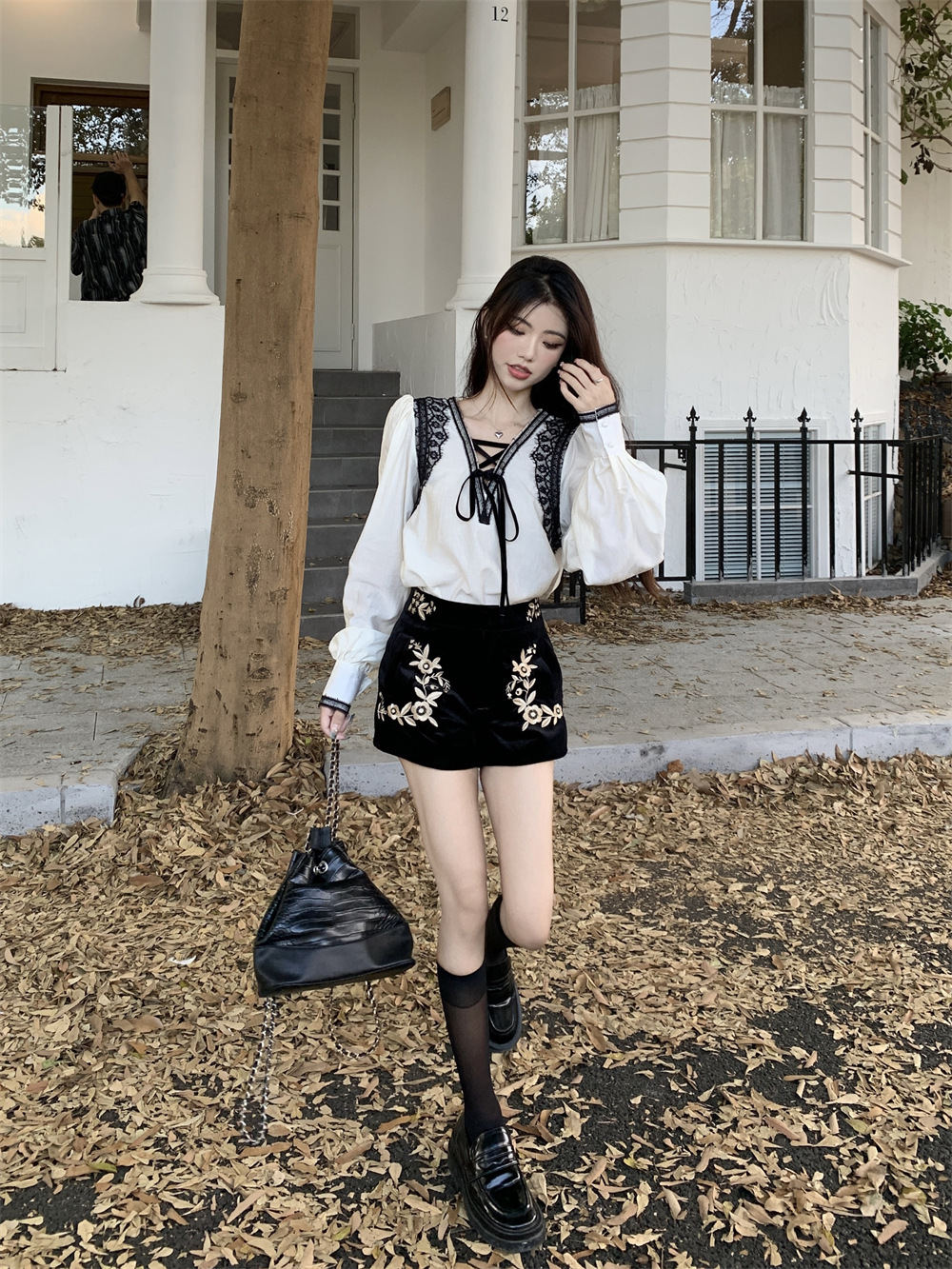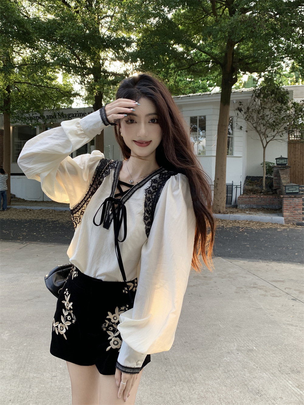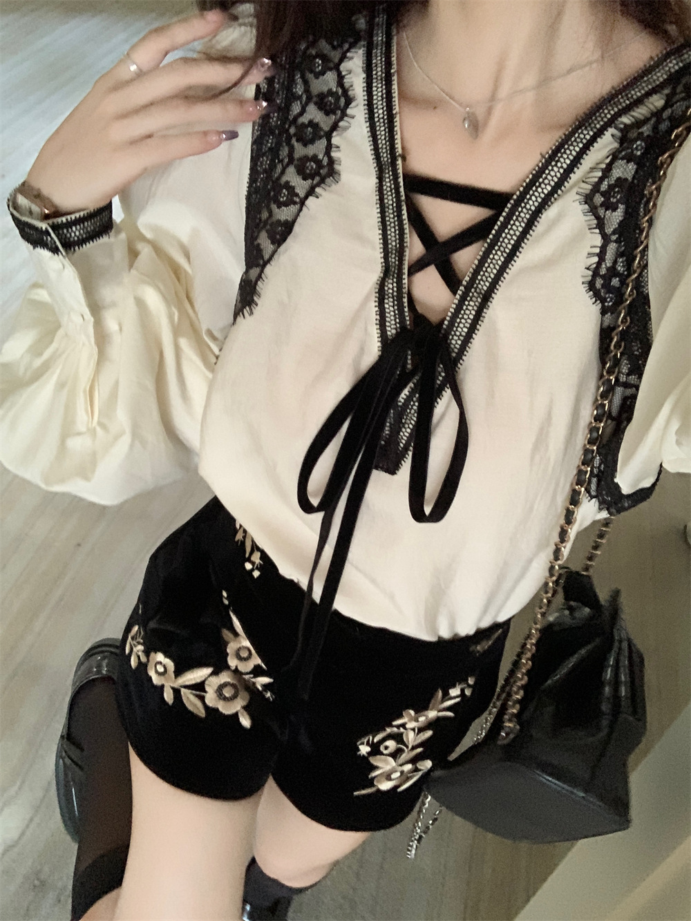 JMA-241 实拍 秋季法式V领绑带蕾丝拼接宽松长袖衬衫女+高腰刺绣丝绒短裤
