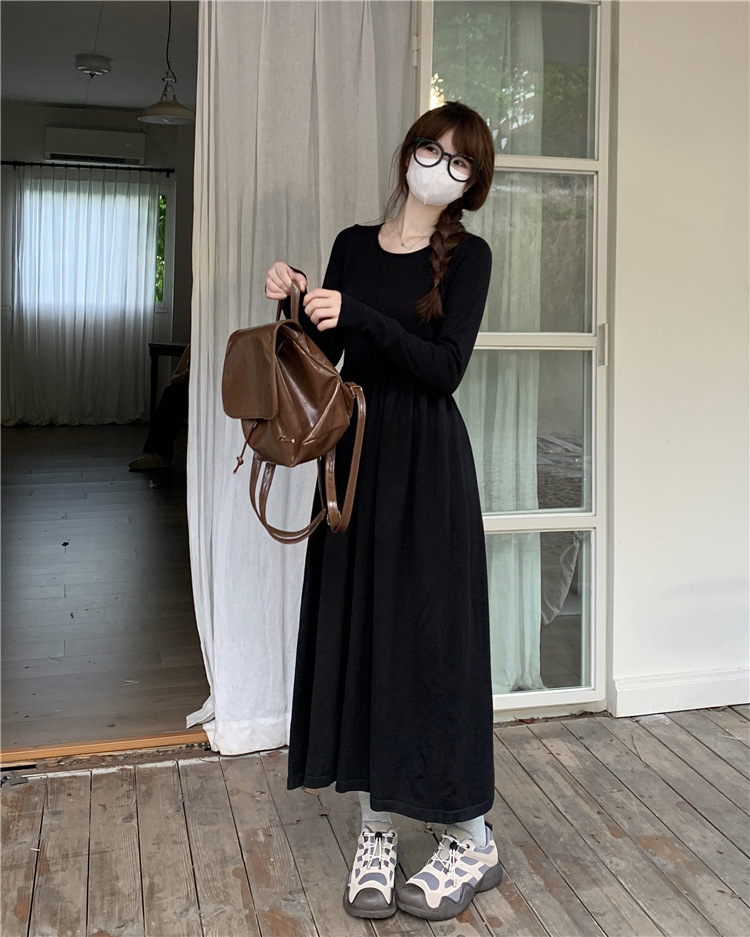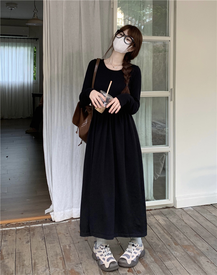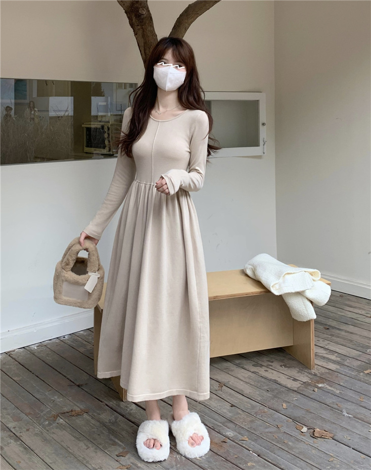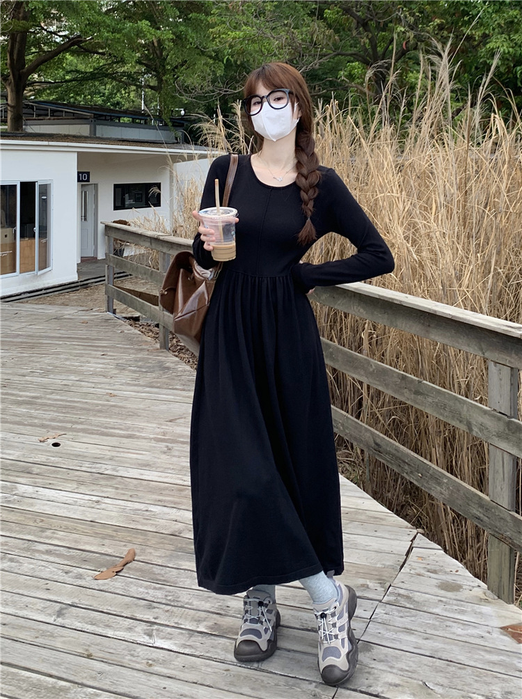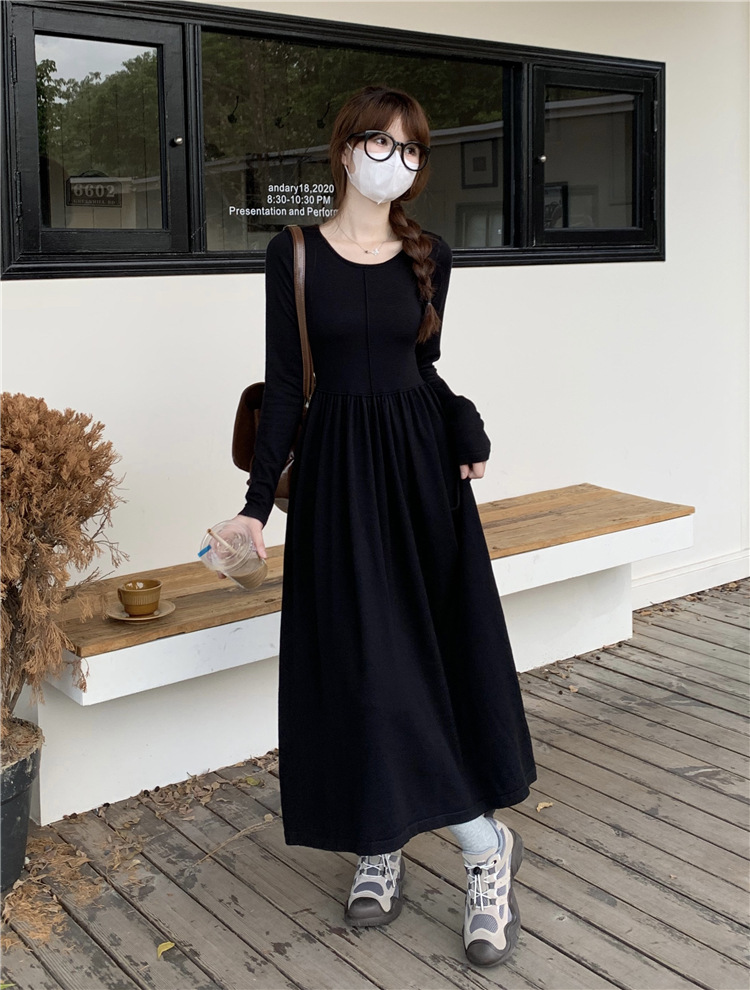 JMA-253 实拍 2023秋冬法式圆领长袖针织连衣裙女设计感收腰显瘦打底裙子