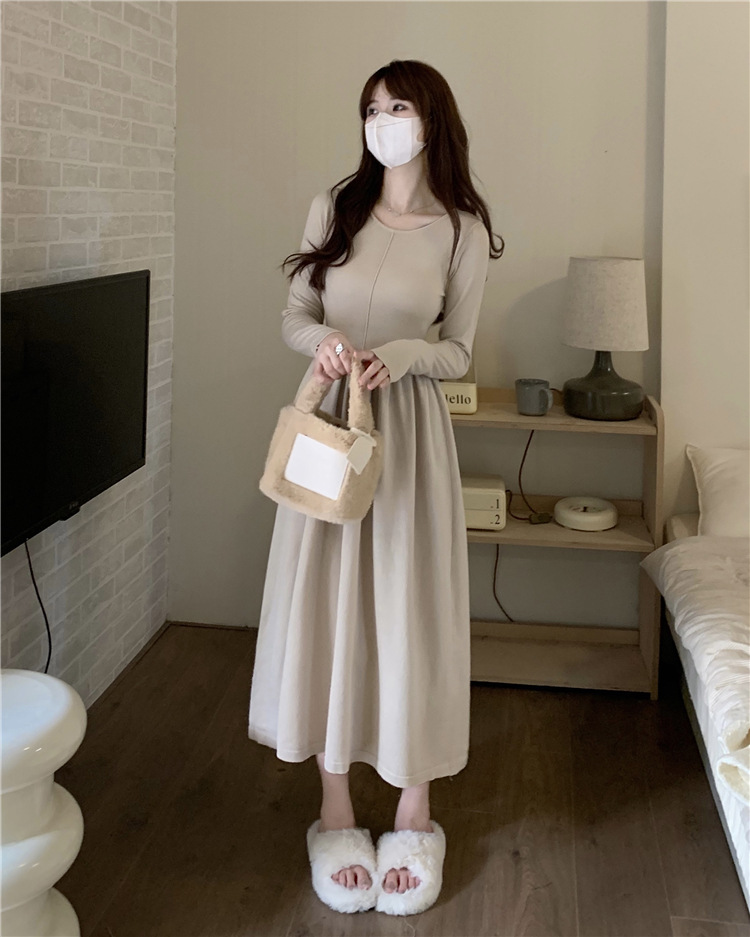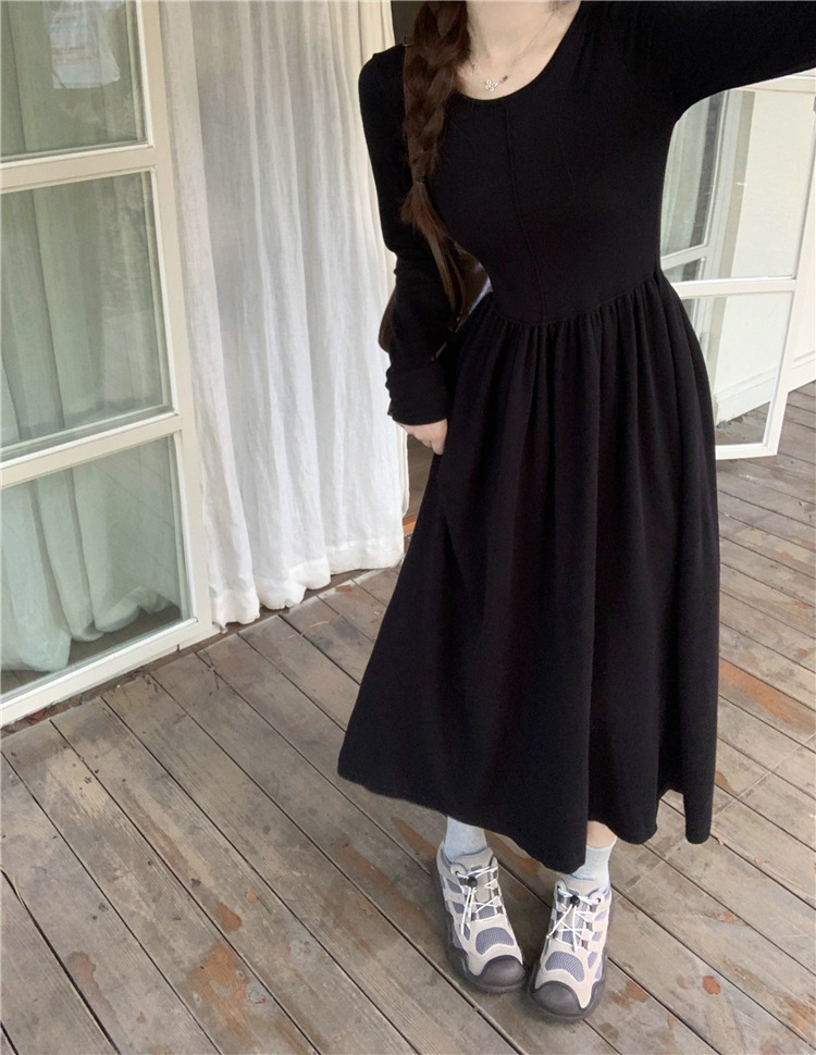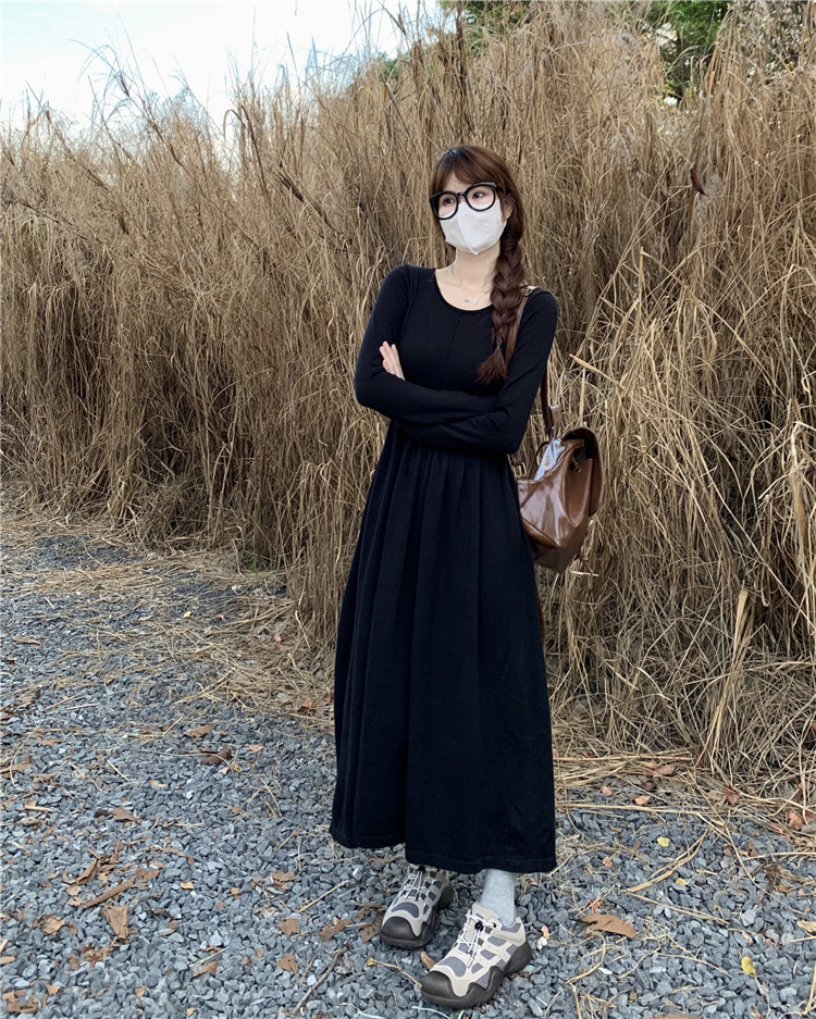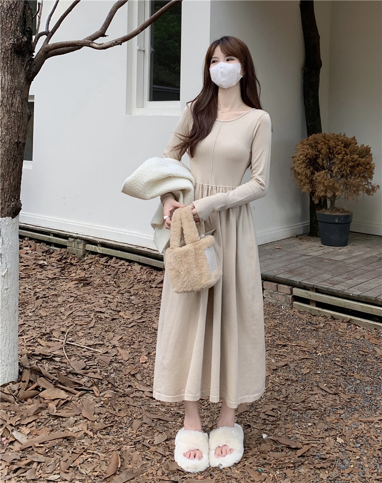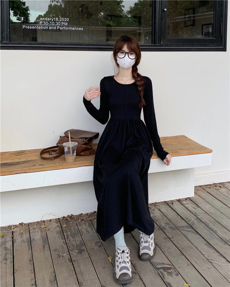 JMA-253 实拍 2023秋冬法式圆领长袖针织连衣裙女设计感收腰显瘦打底裙子