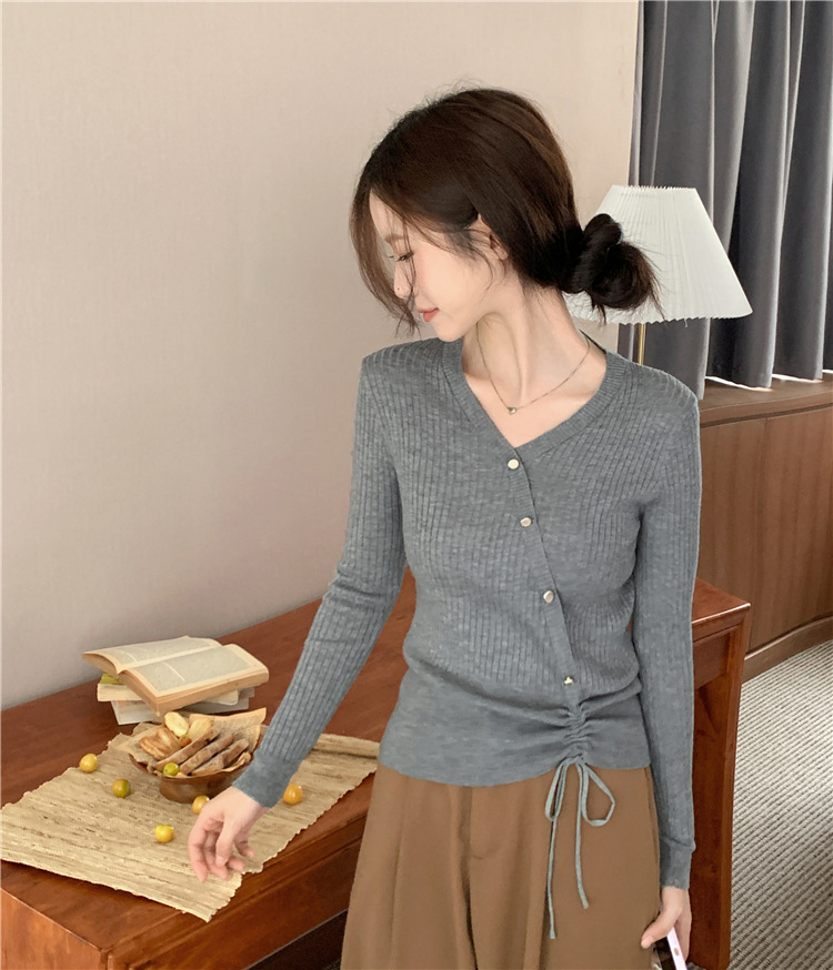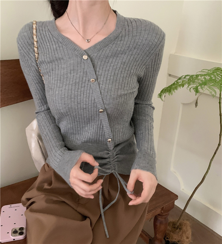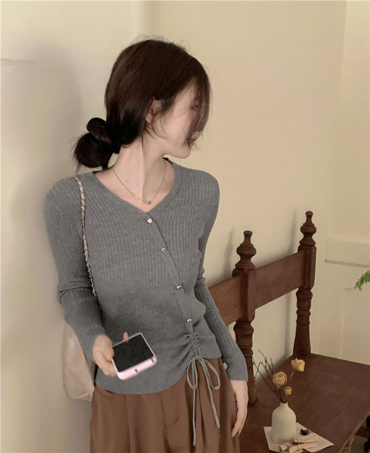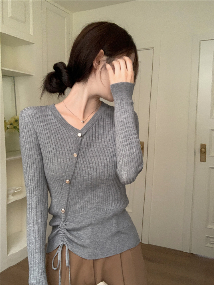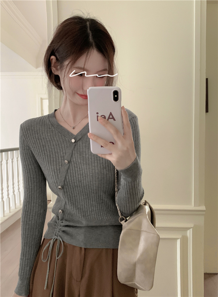 JMA-255 实拍 2023秋季新款韩系纯色软糯斜门襟设计感长袖针织衫修身上衣
