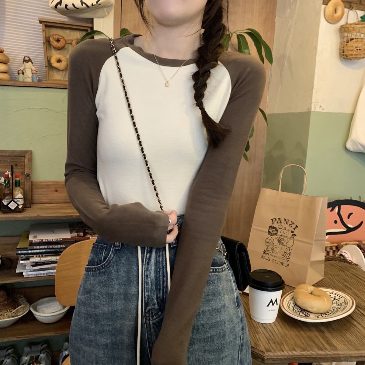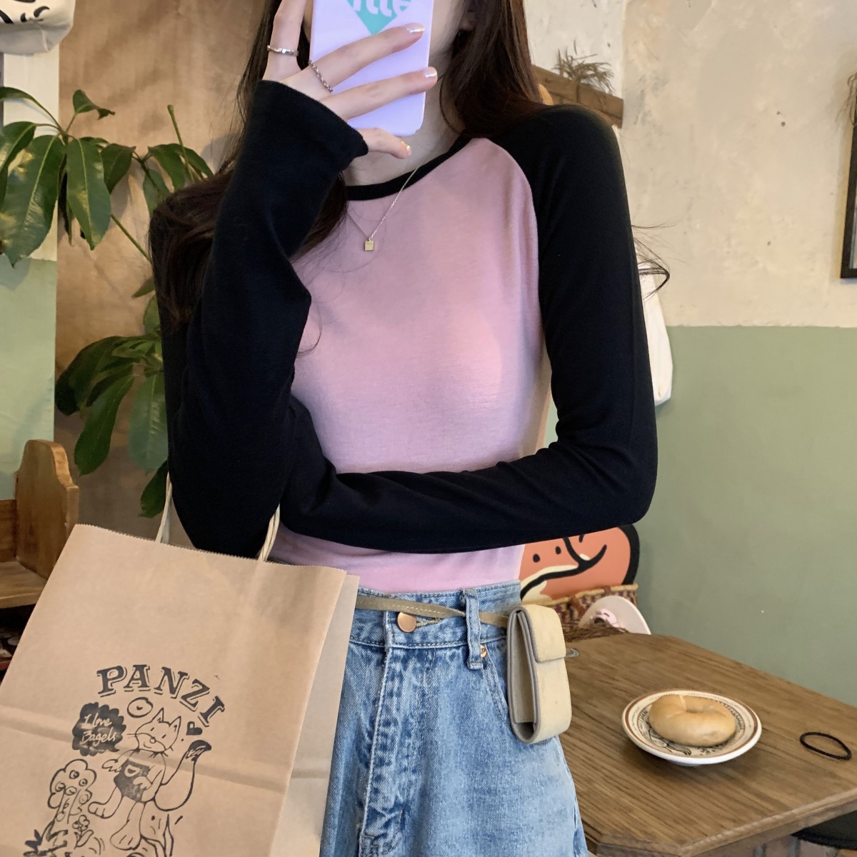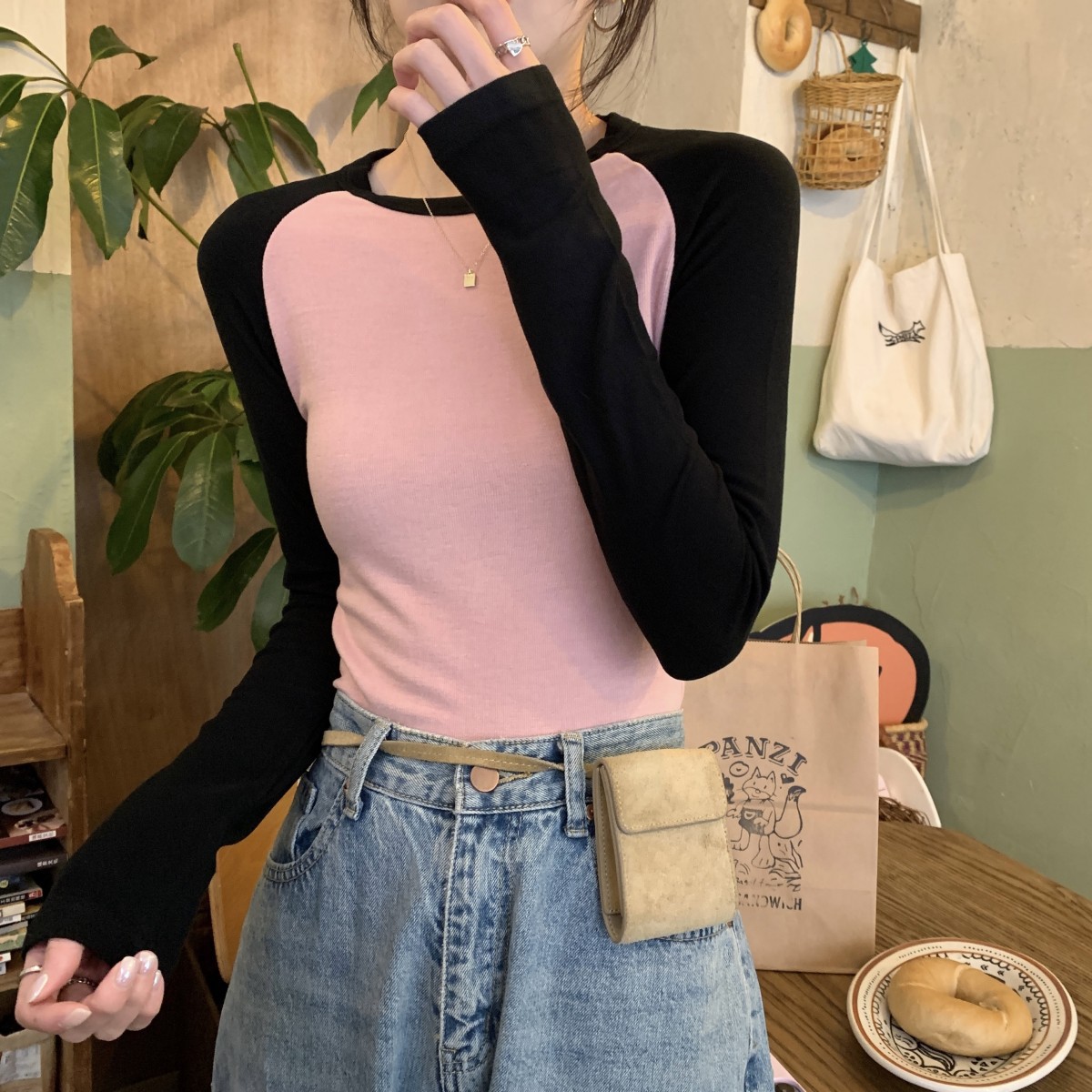 JMA-260 实拍 2023秋季韩版修身撞色设计感短款内搭长袖T恤女打底衫上衣潮