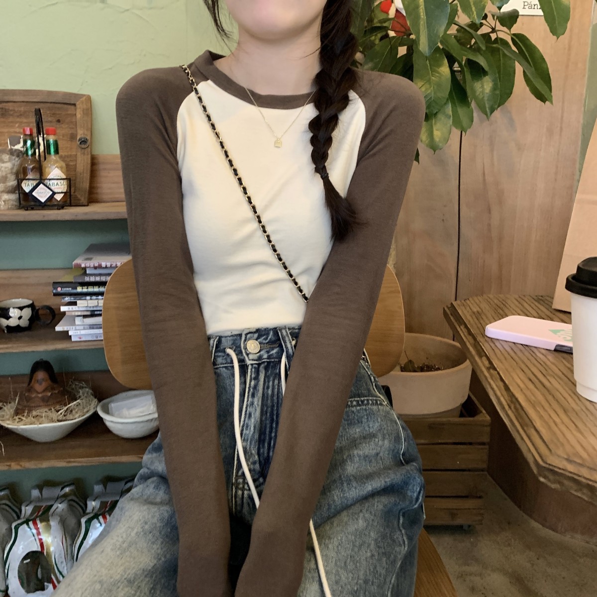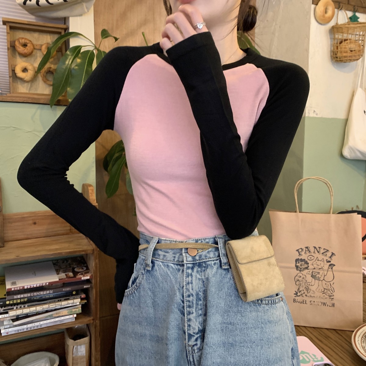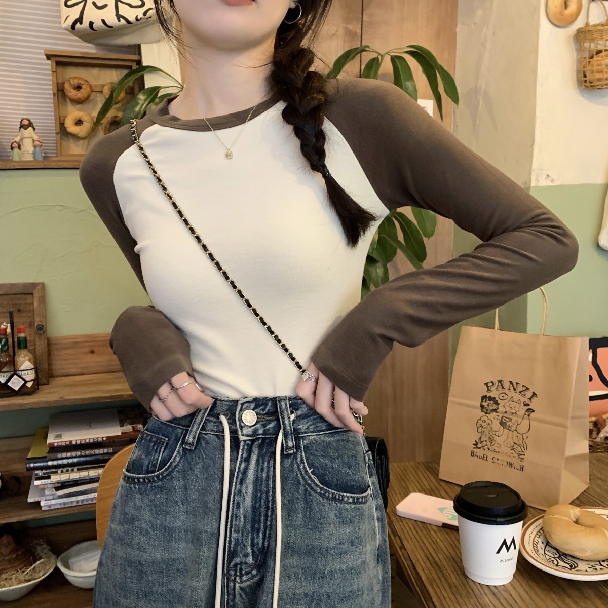 JMA-260 实拍 2023秋季韩版修身撞色设计感短款内搭长袖T恤女打底衫上衣潮
