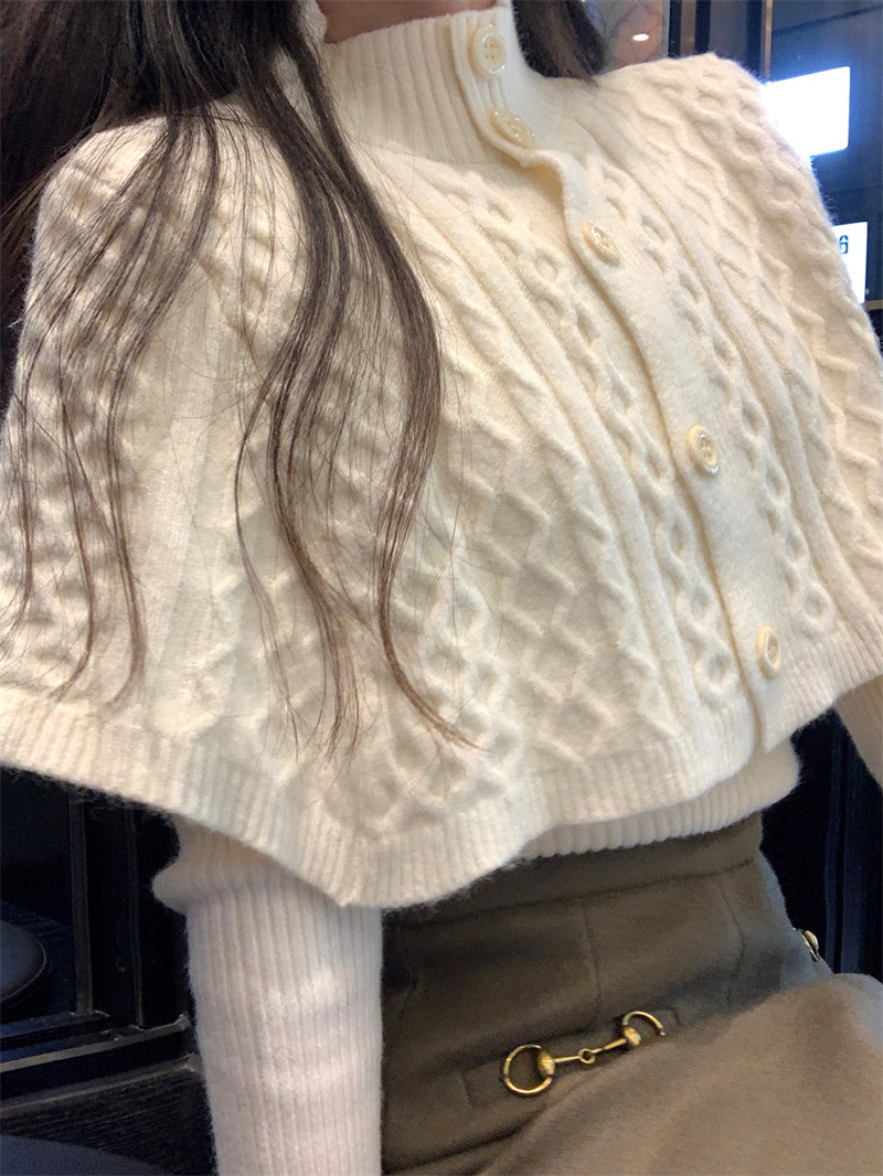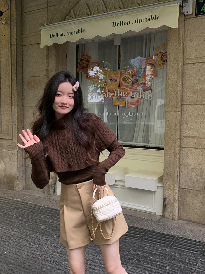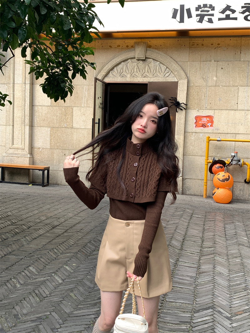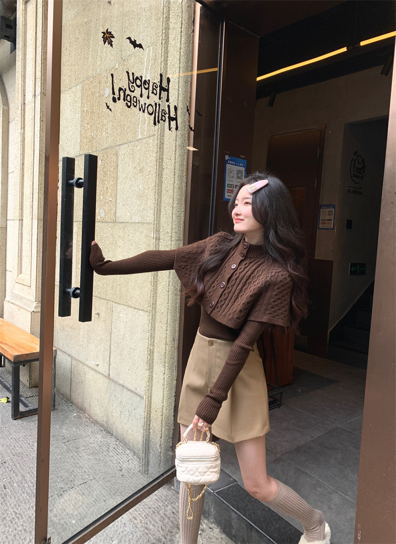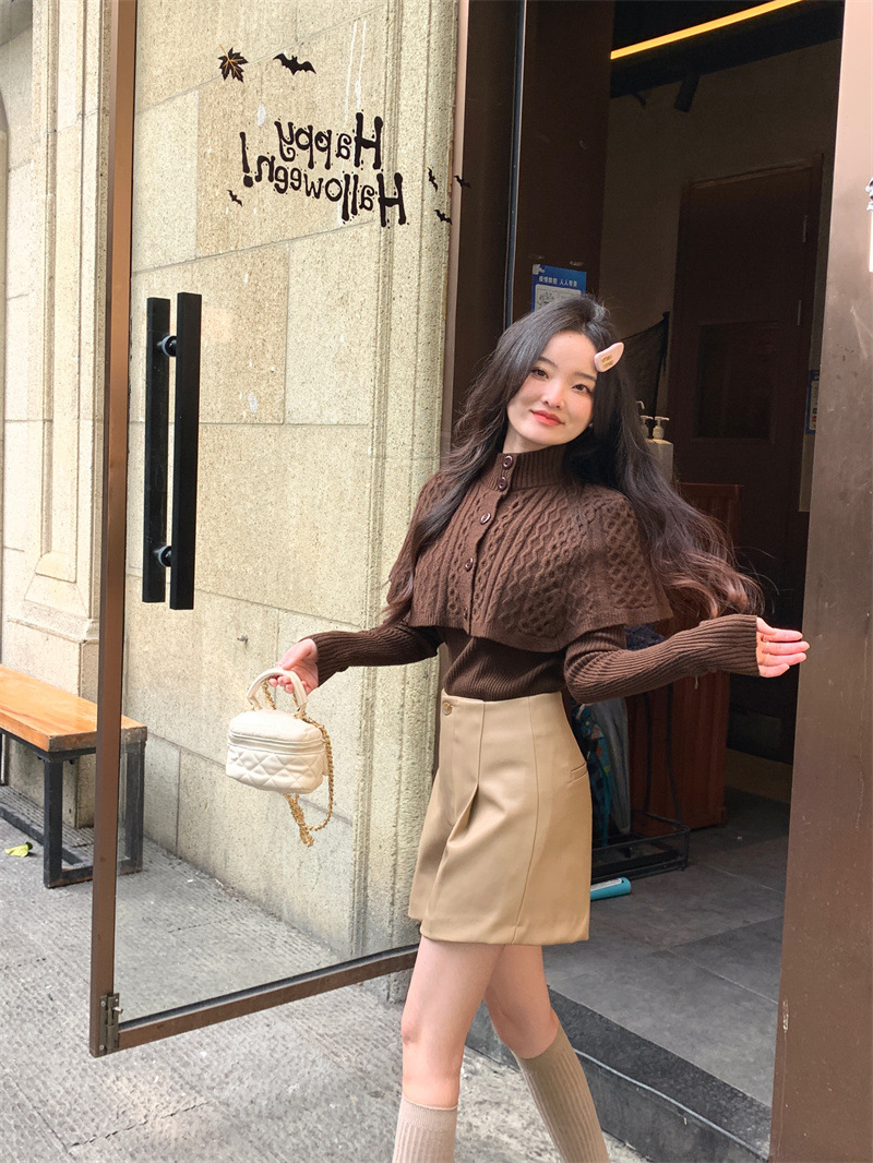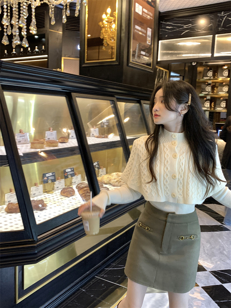 JMA-261 实拍实价~纯欲小香风高领毛衣披肩+针织打底衫两件套套装