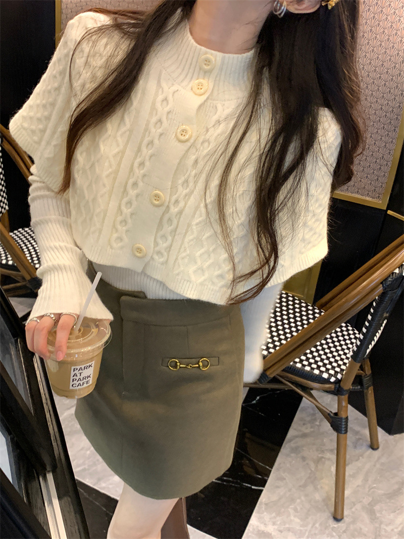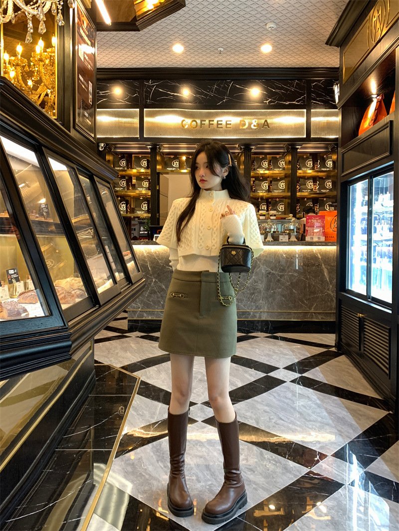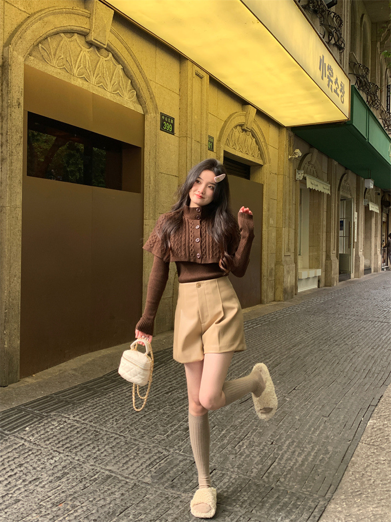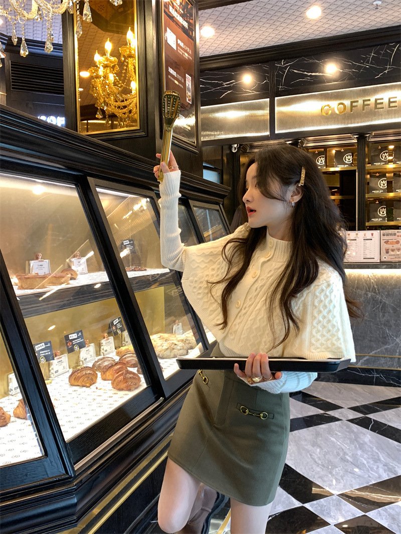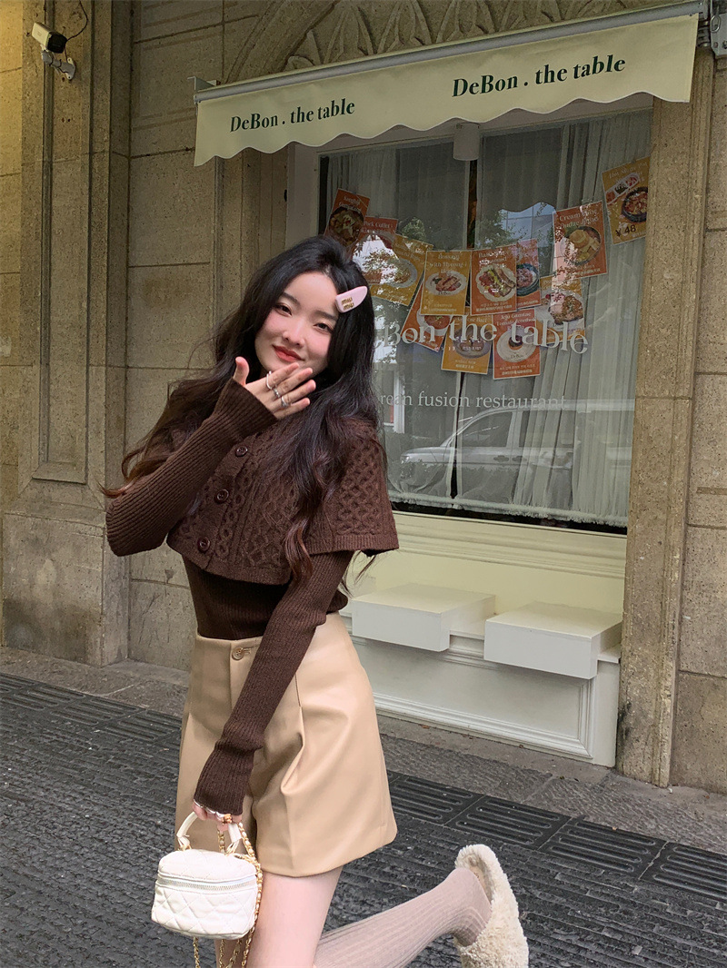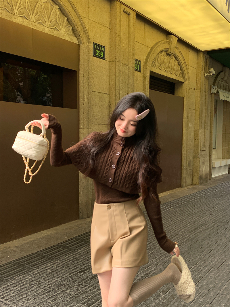 JMA-261 实拍实价~纯欲小香风高领毛衣披肩+针织打底衫两件套套装