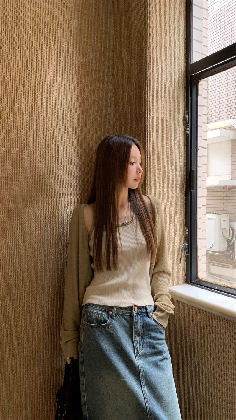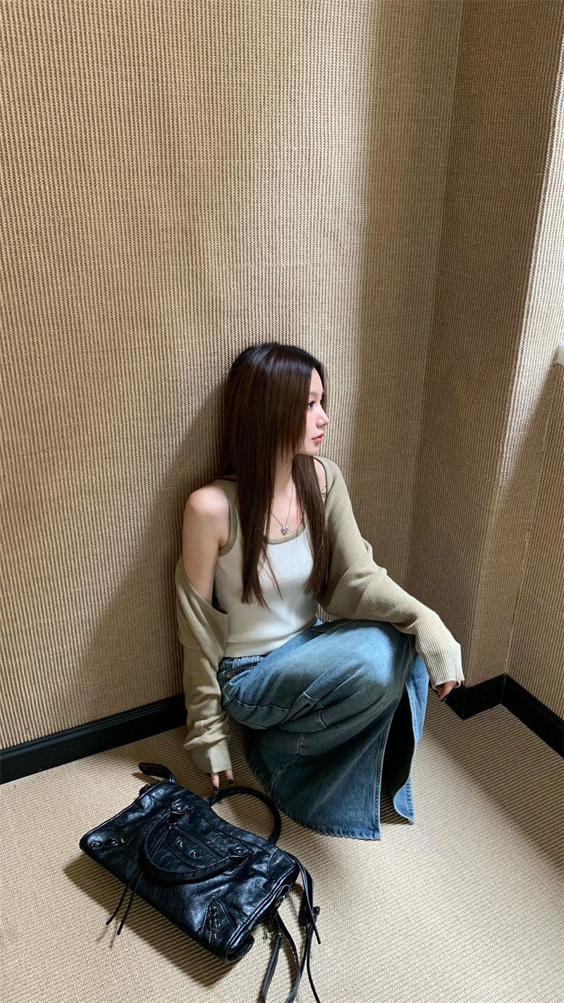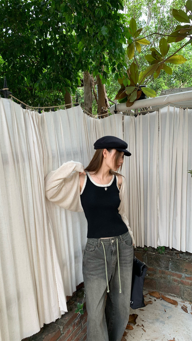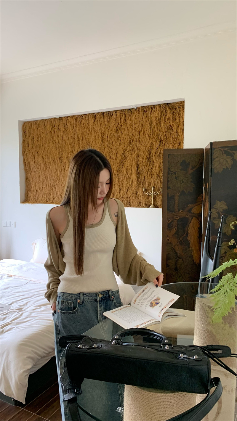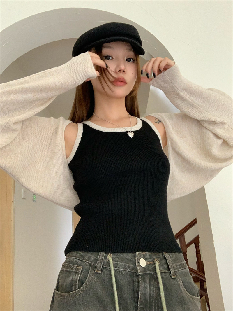 JMA-266 实拍 2023秋季新款韩版百搭撞色针织吊带背心+长袖针织开衫两件套