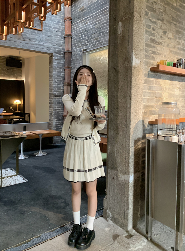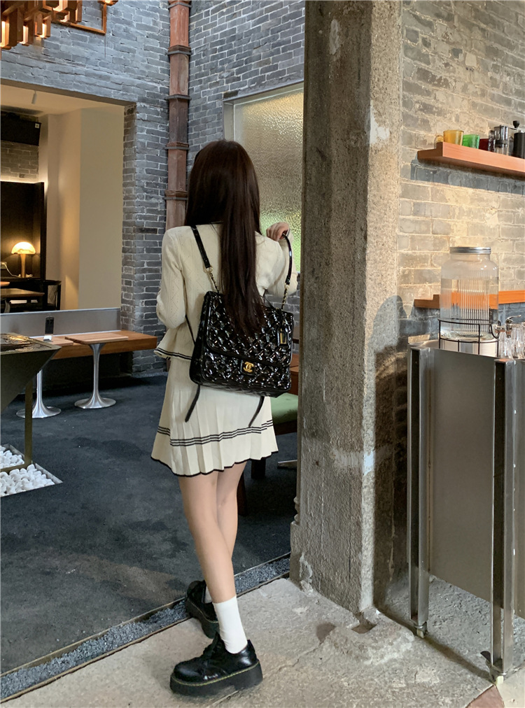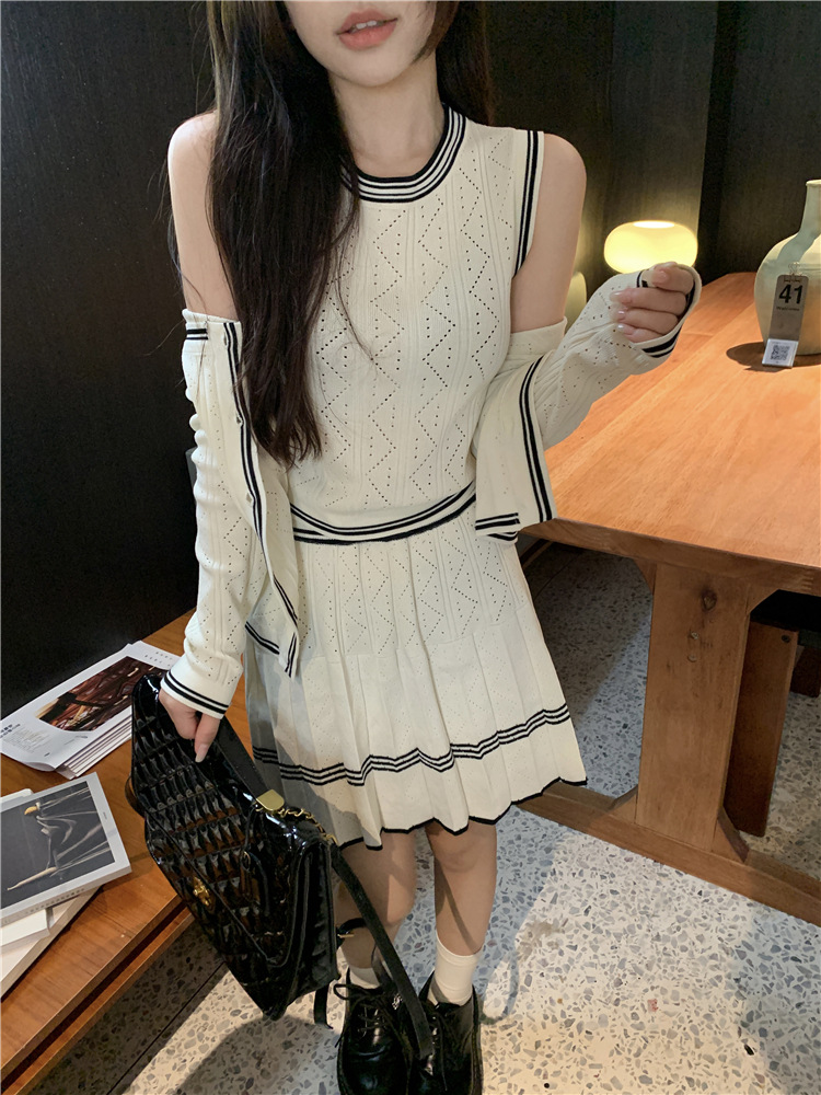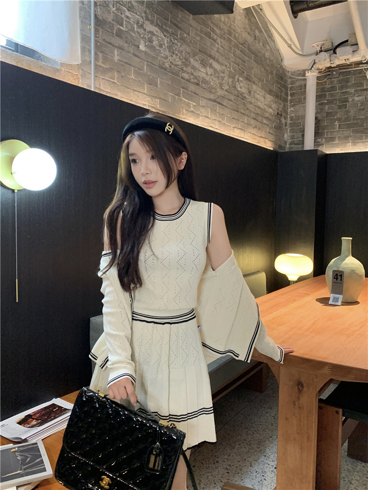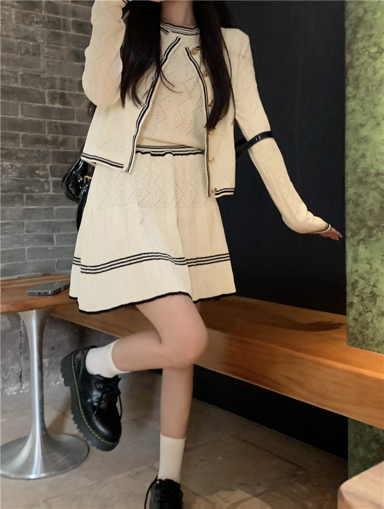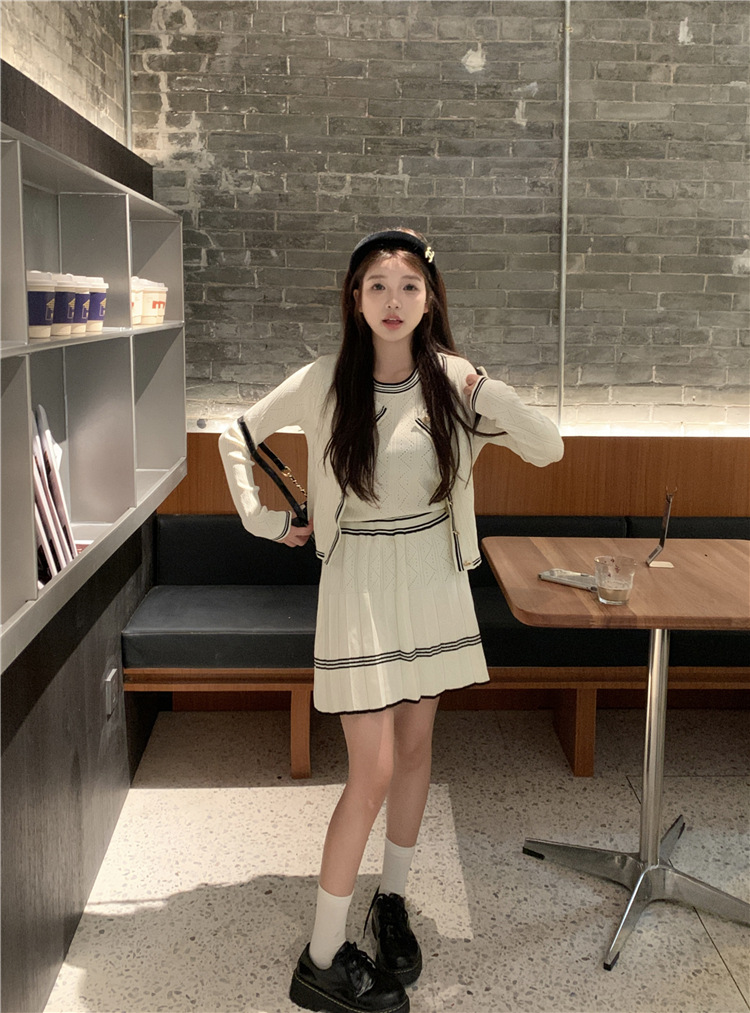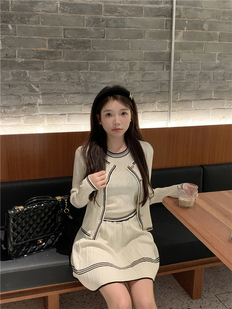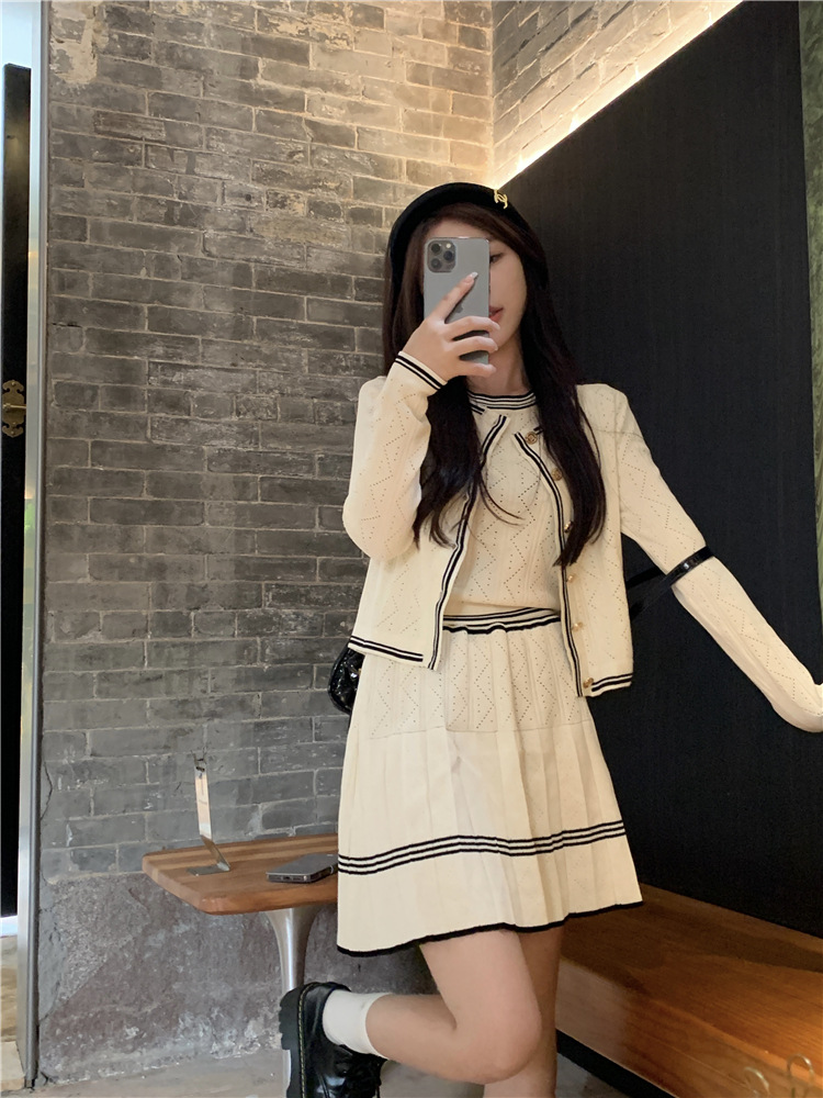 JMA-281 实拍 2023秋季法式气质收腰针织背心+半身裙+针织开衫小香套装裙